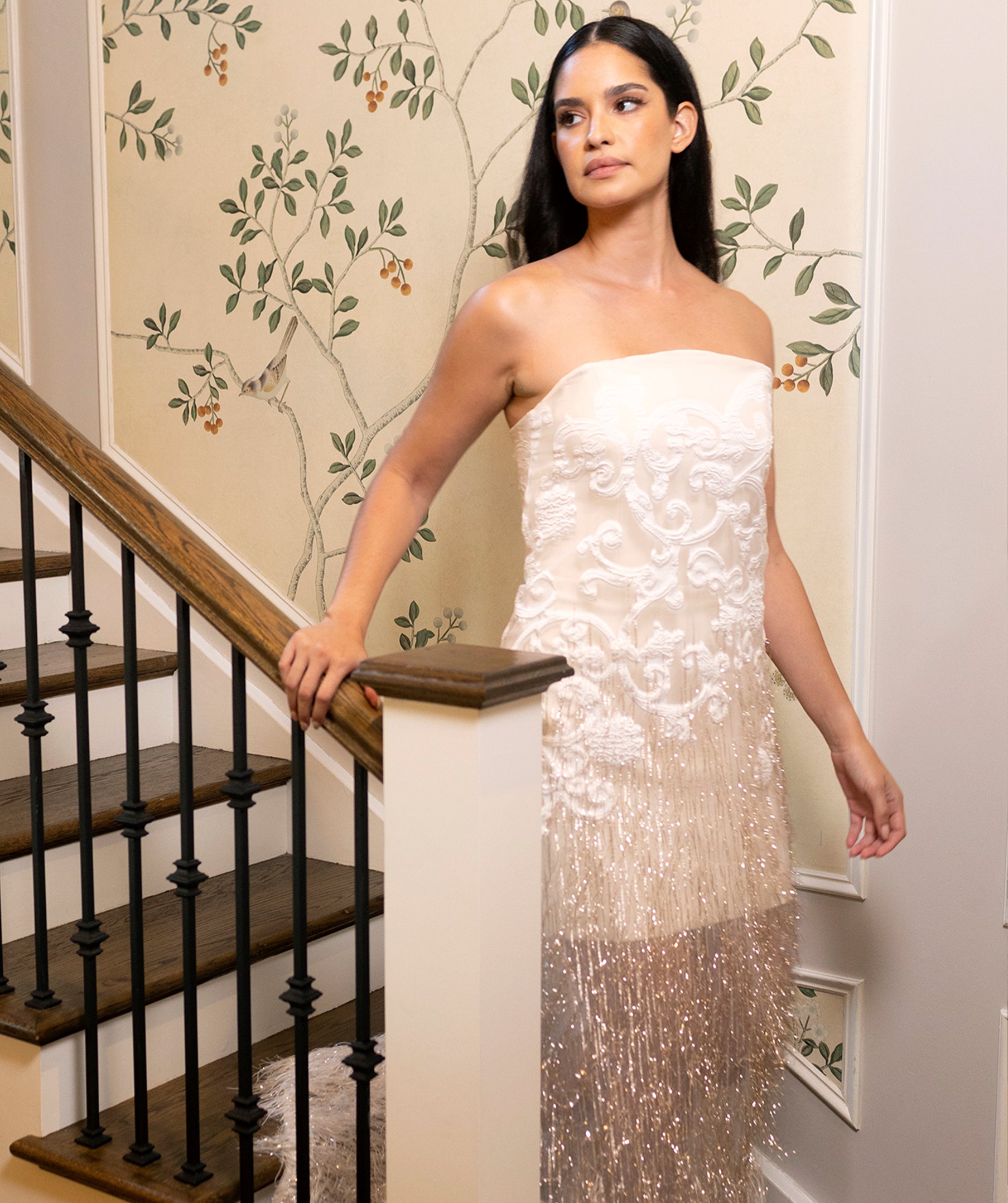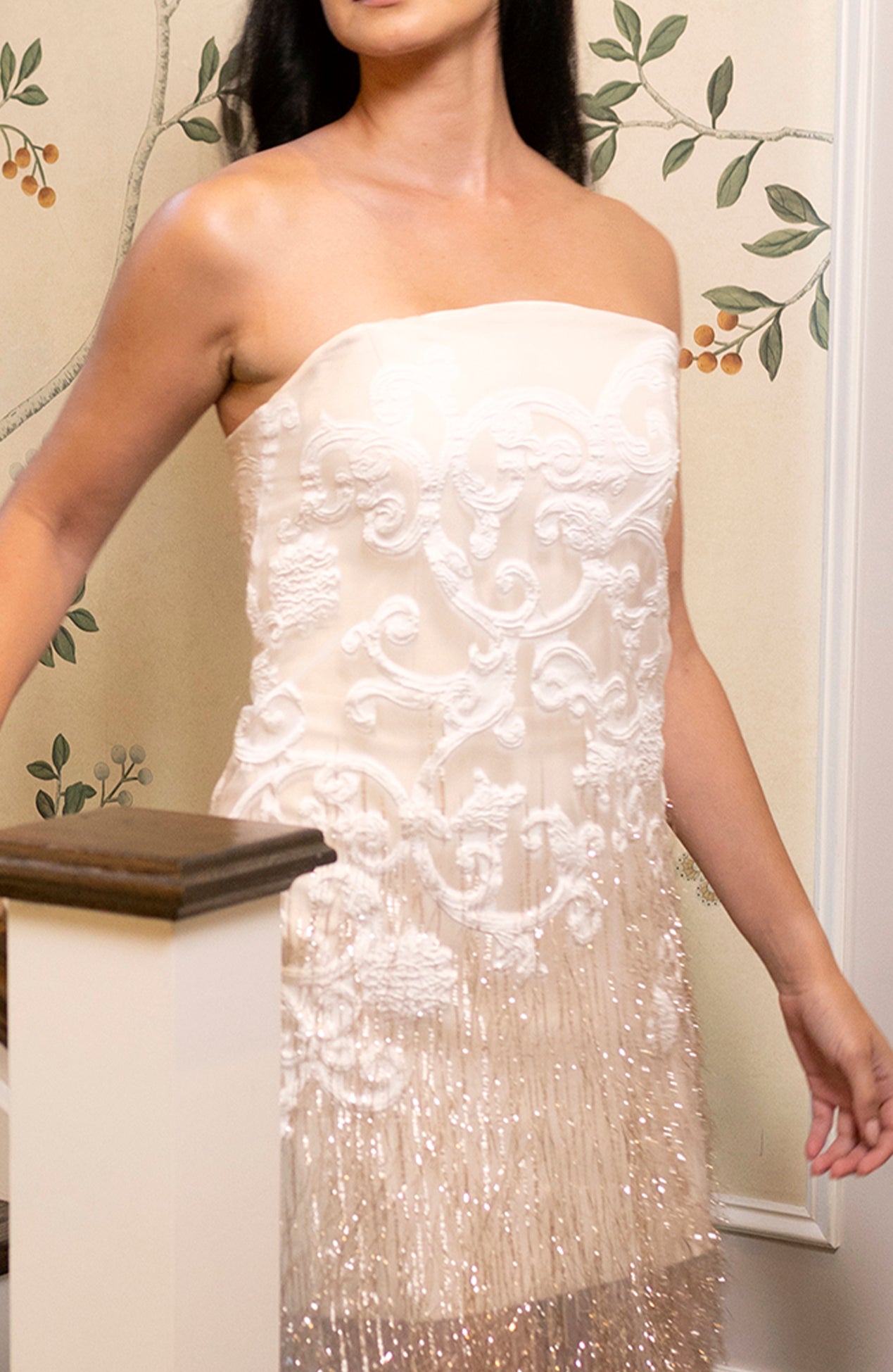 Strapless metallic fringe brocade dress