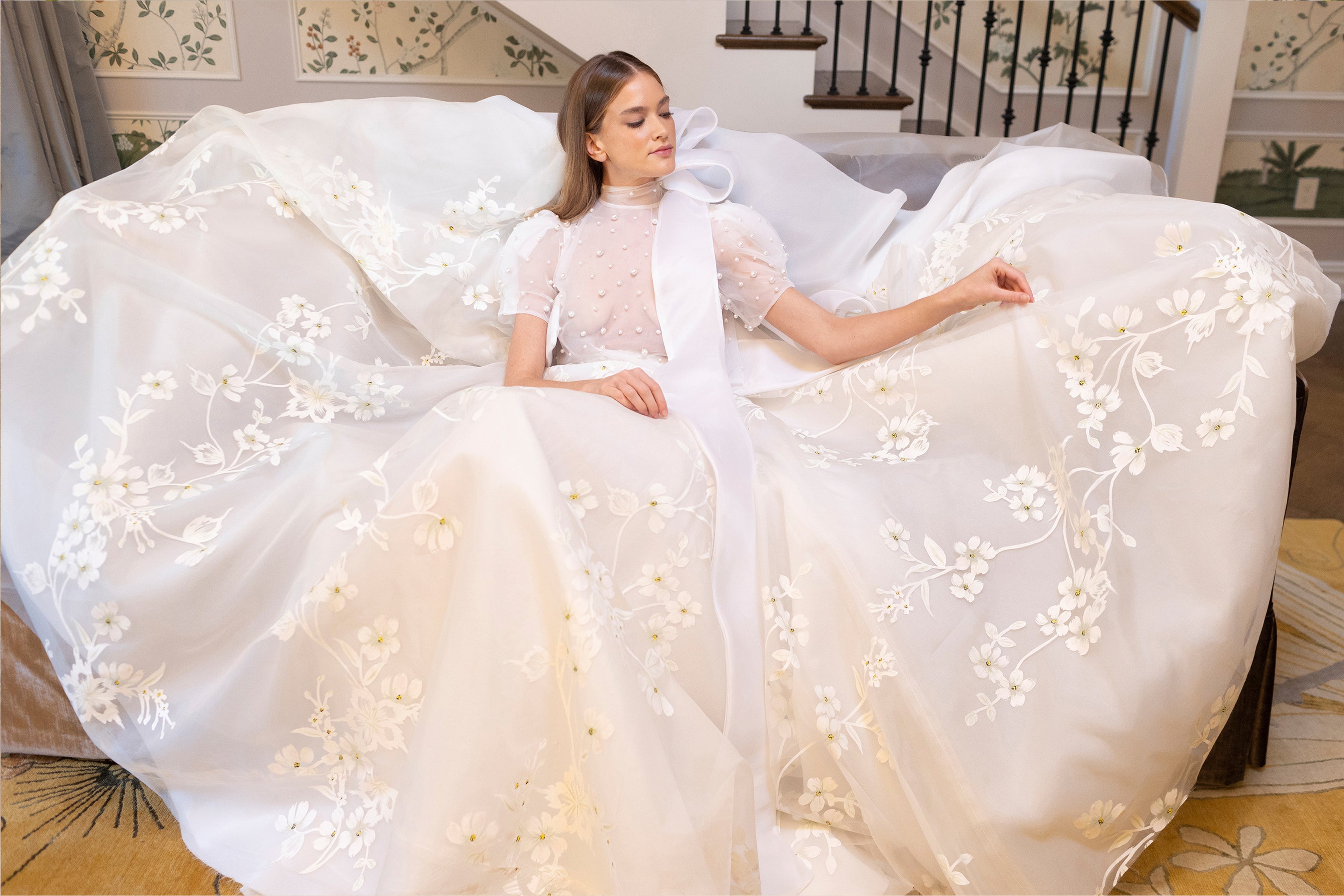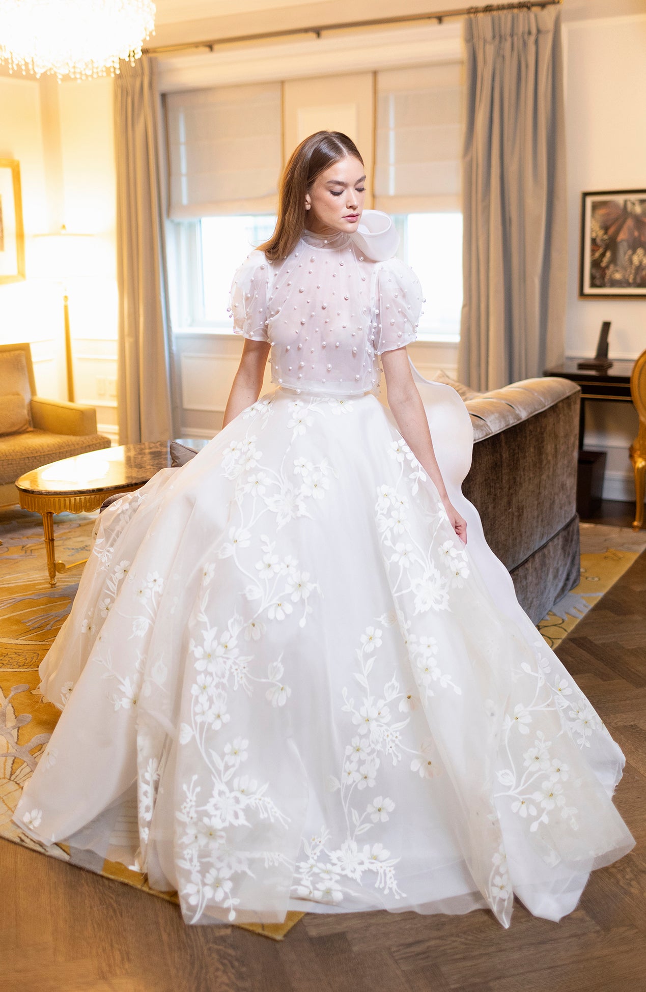 high neck puff sleeve pearl tulle topper with organza bow paired with handpainted floral organza ball gown skirt