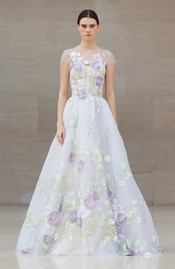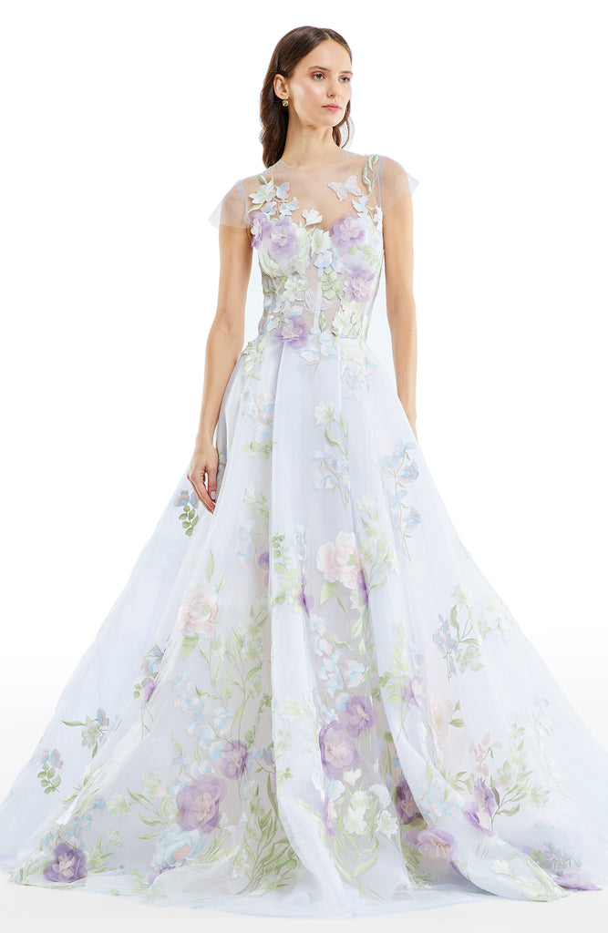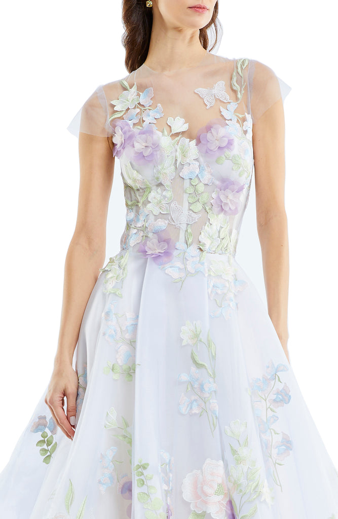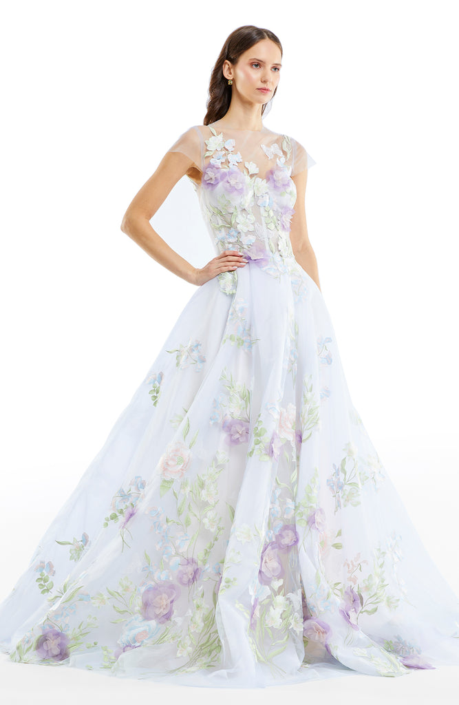 Cap sleeve corset pastel floral embroidered gown with 3d organza flowers