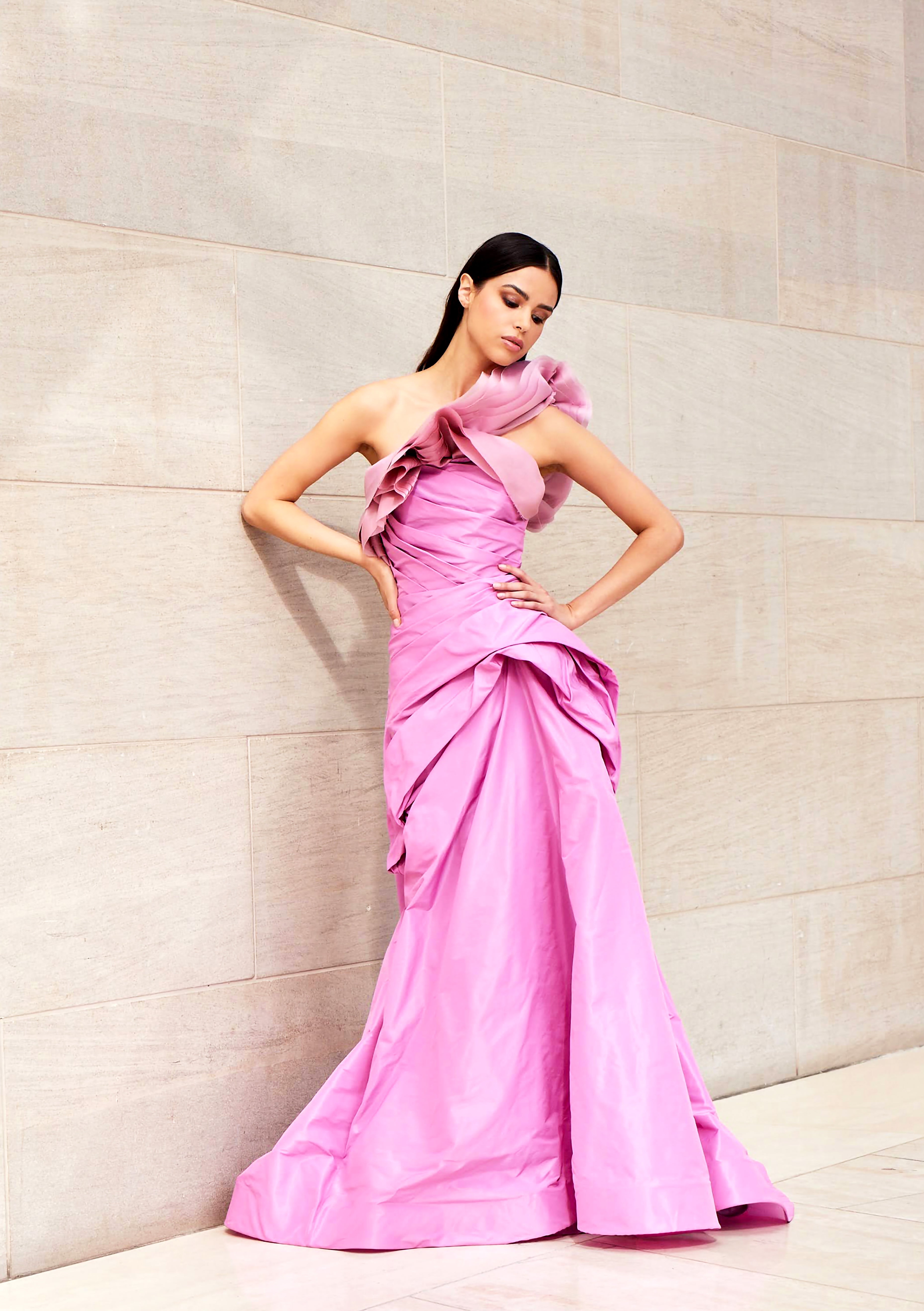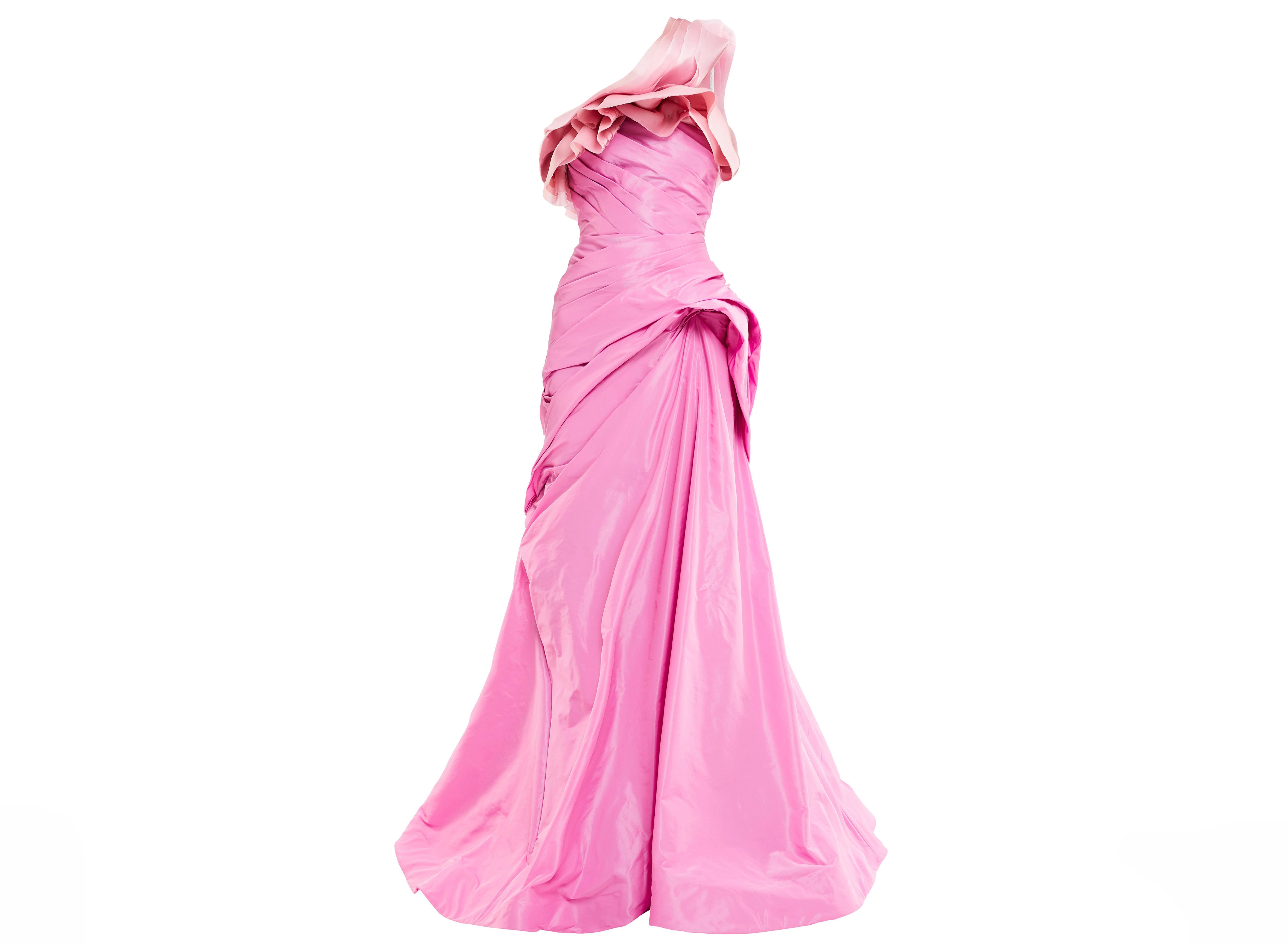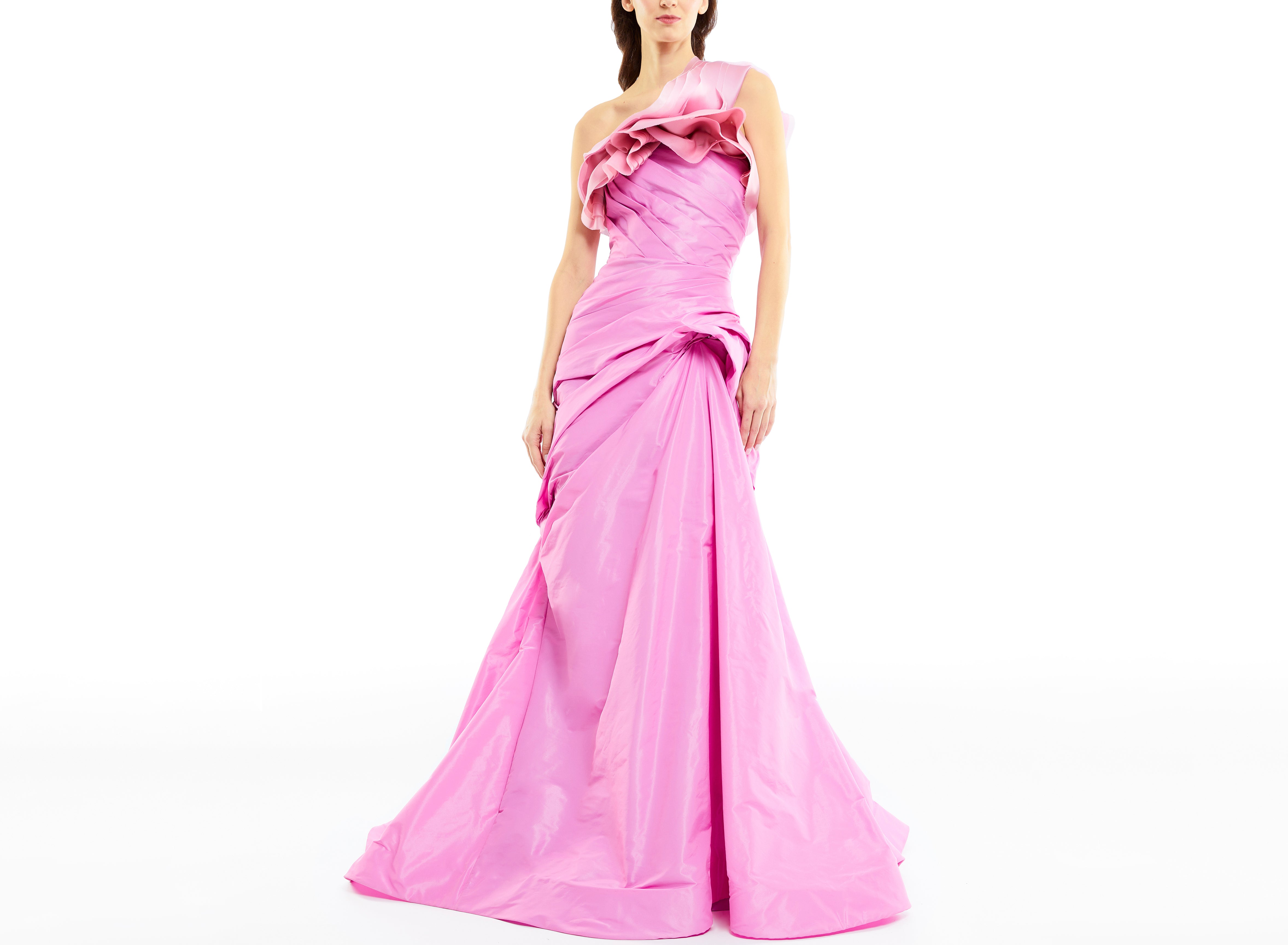 One shoulder ruffle taffeta gown with fitted draped bodice and volume in skirt