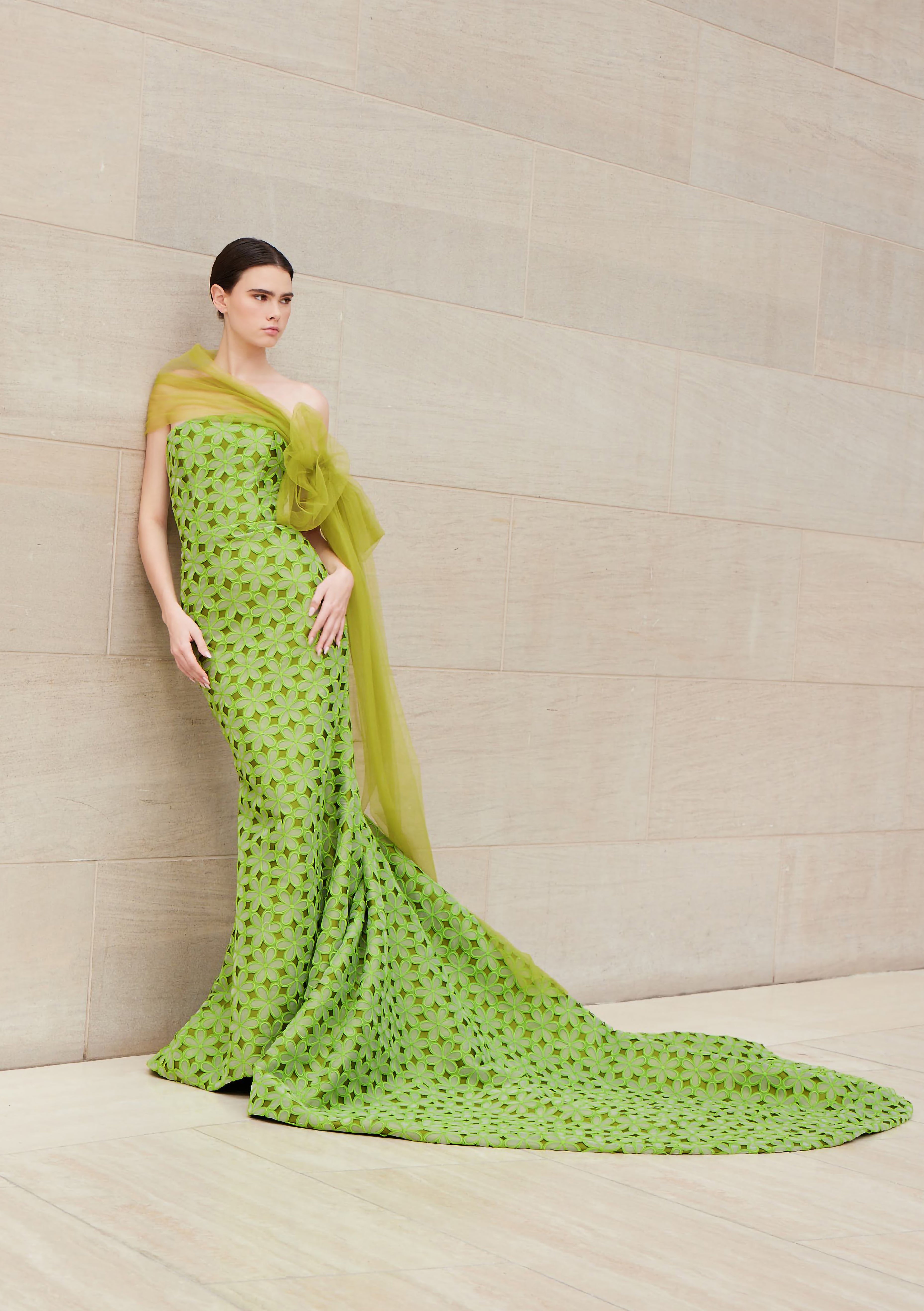 Full length strapless gown with train, embroidered floral pattern, and bow tulle shawl