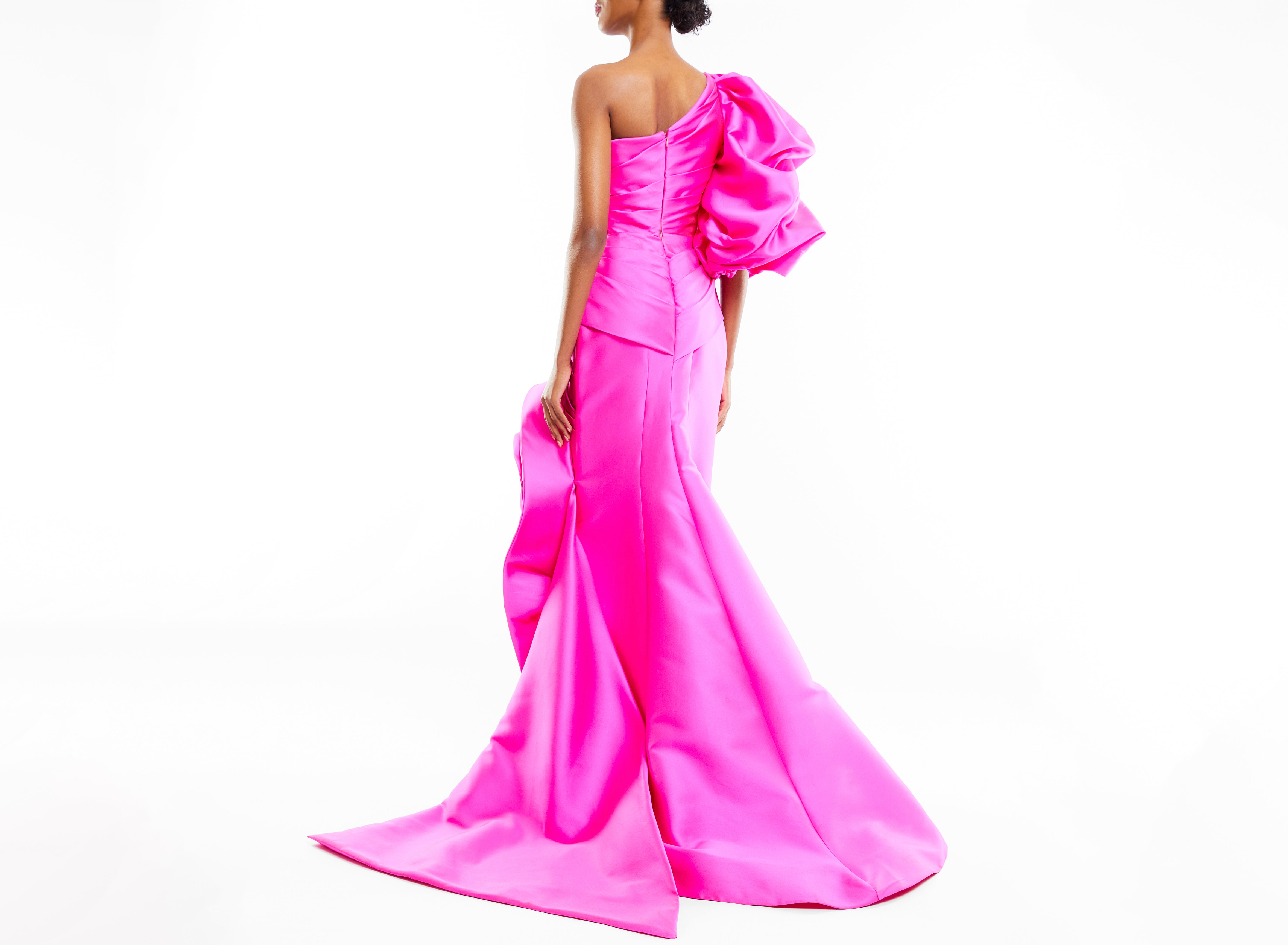 One shoulder satin gown with voluminous gathered sleeve and side train
