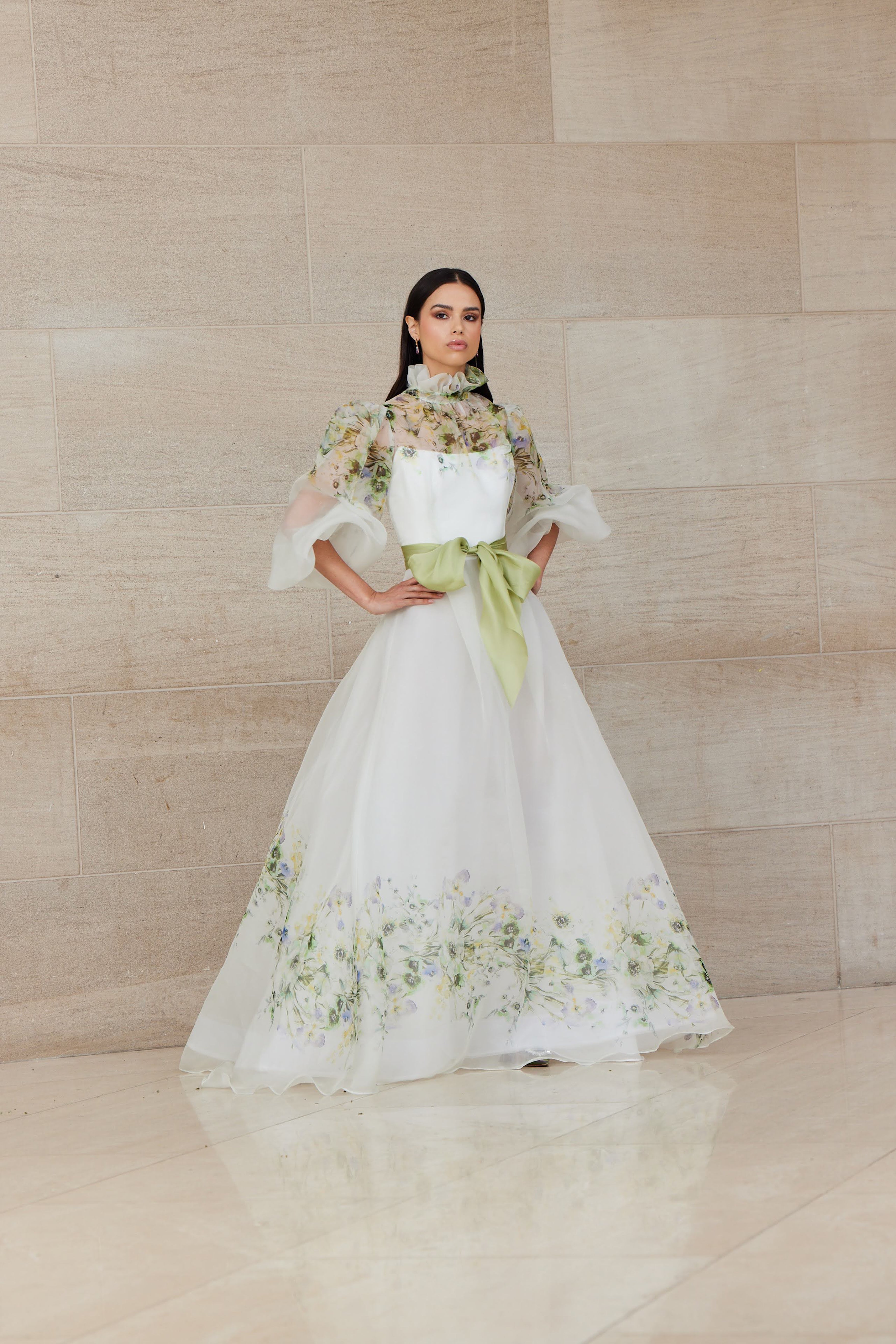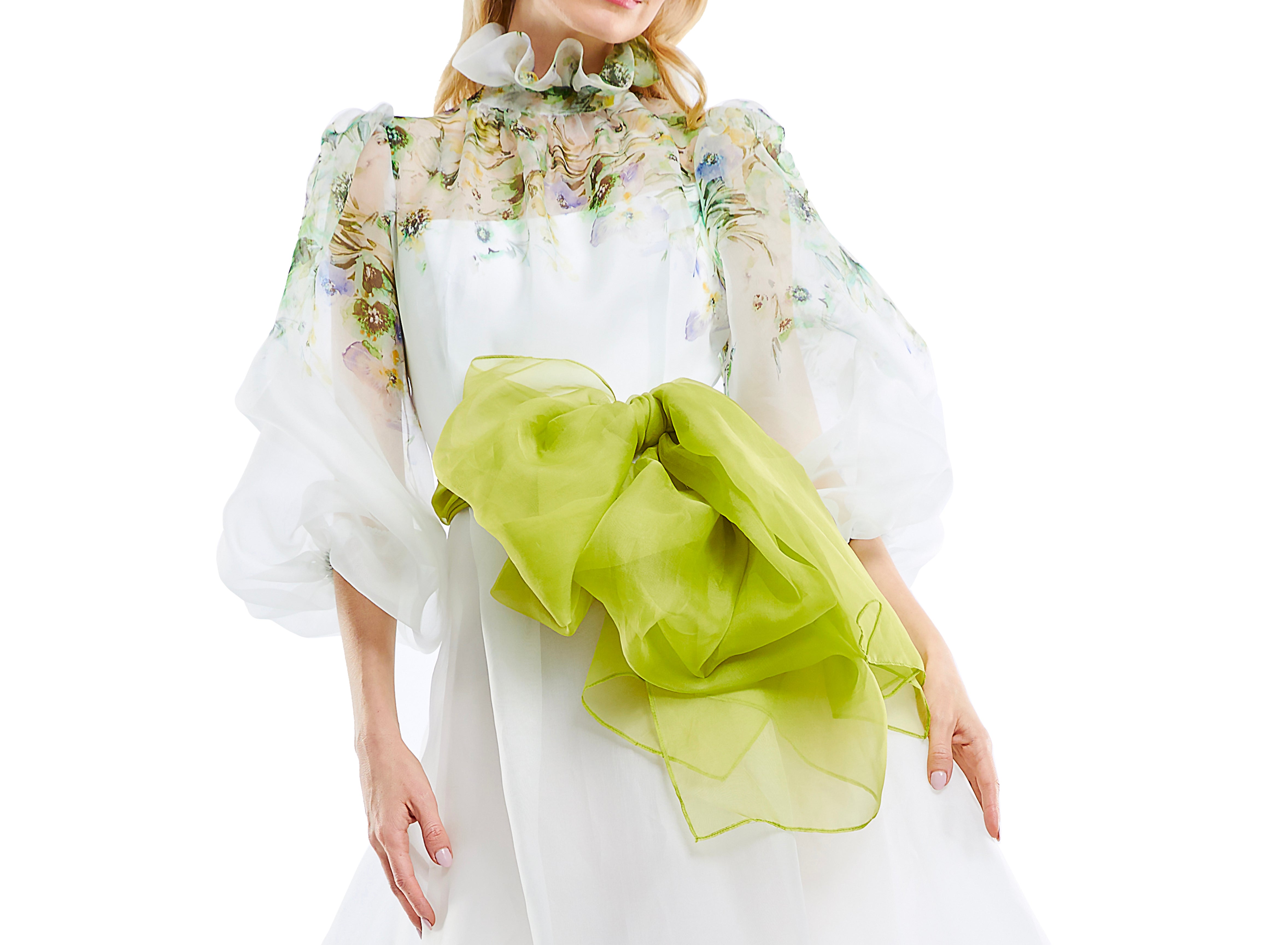High ruffle neck Full length puff-sleeve printed organza gown