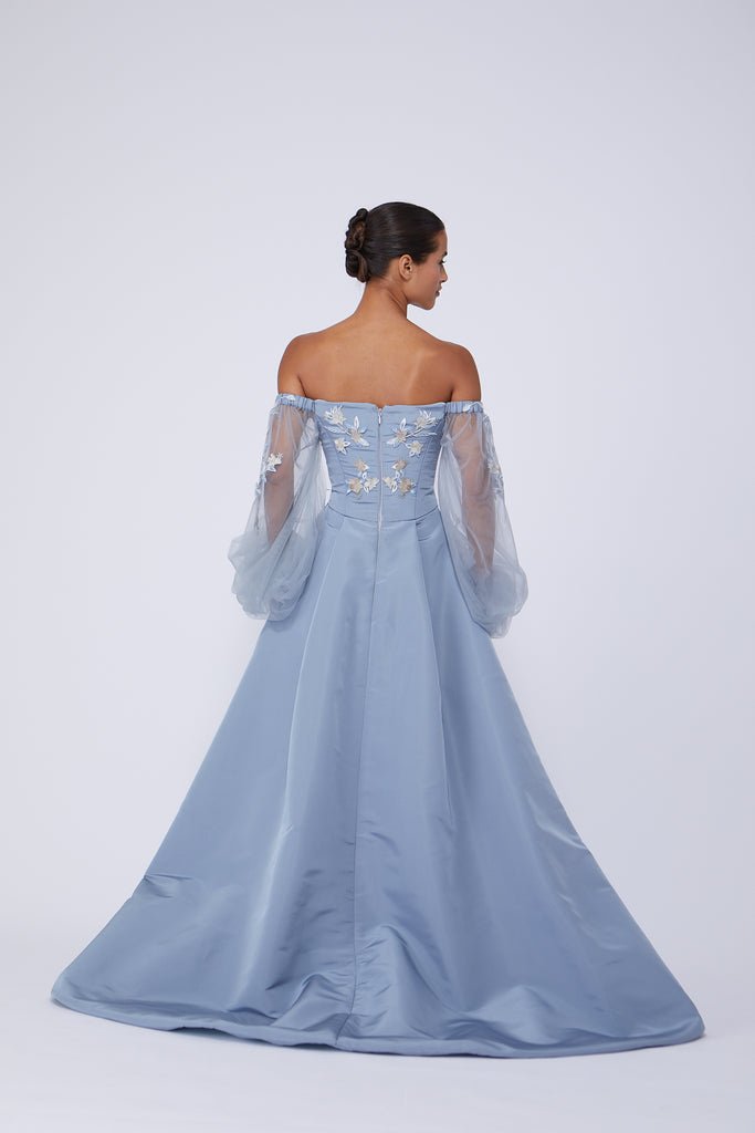 Off the shoulder long blouson sleeve empire waisted gown w/ floral applique