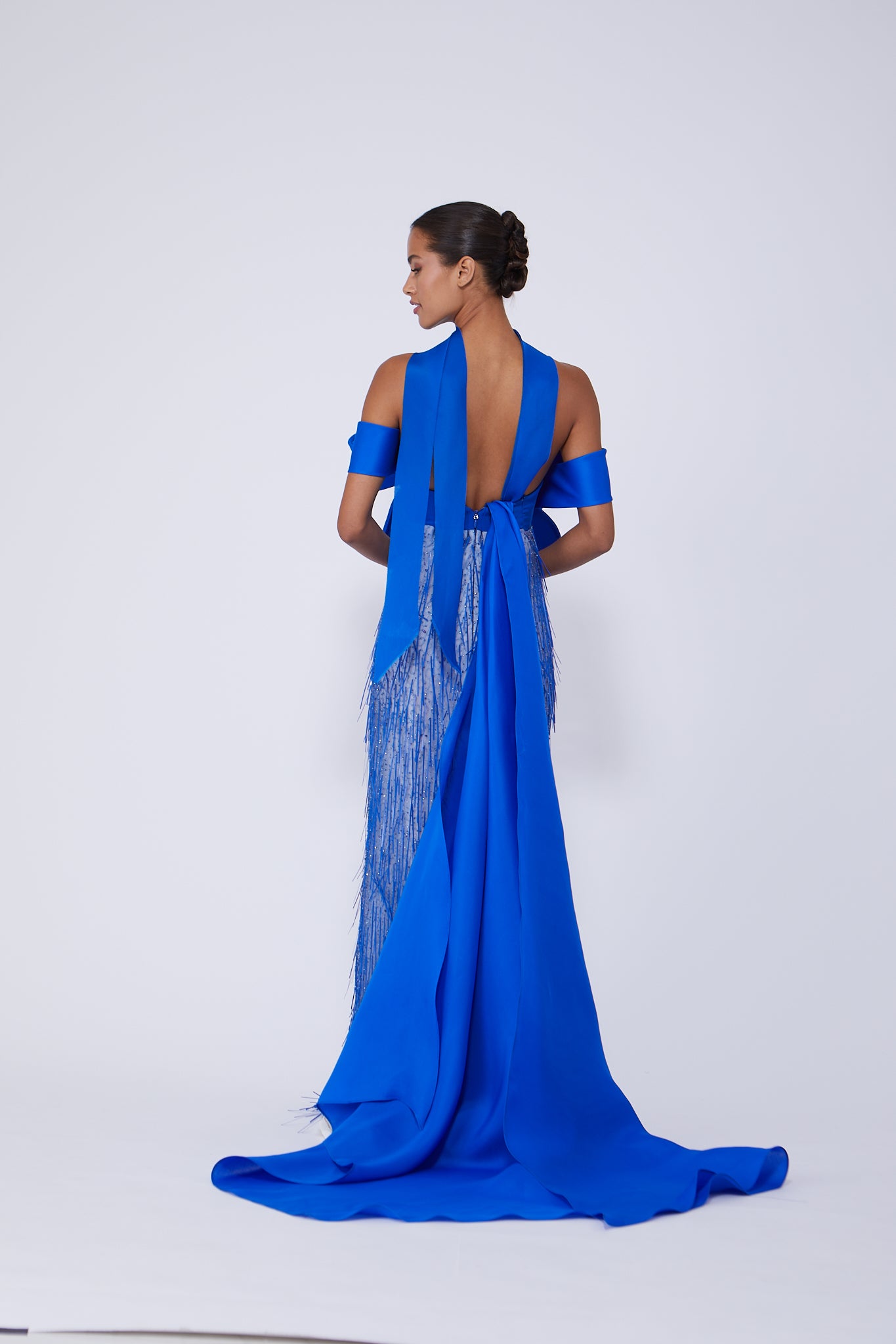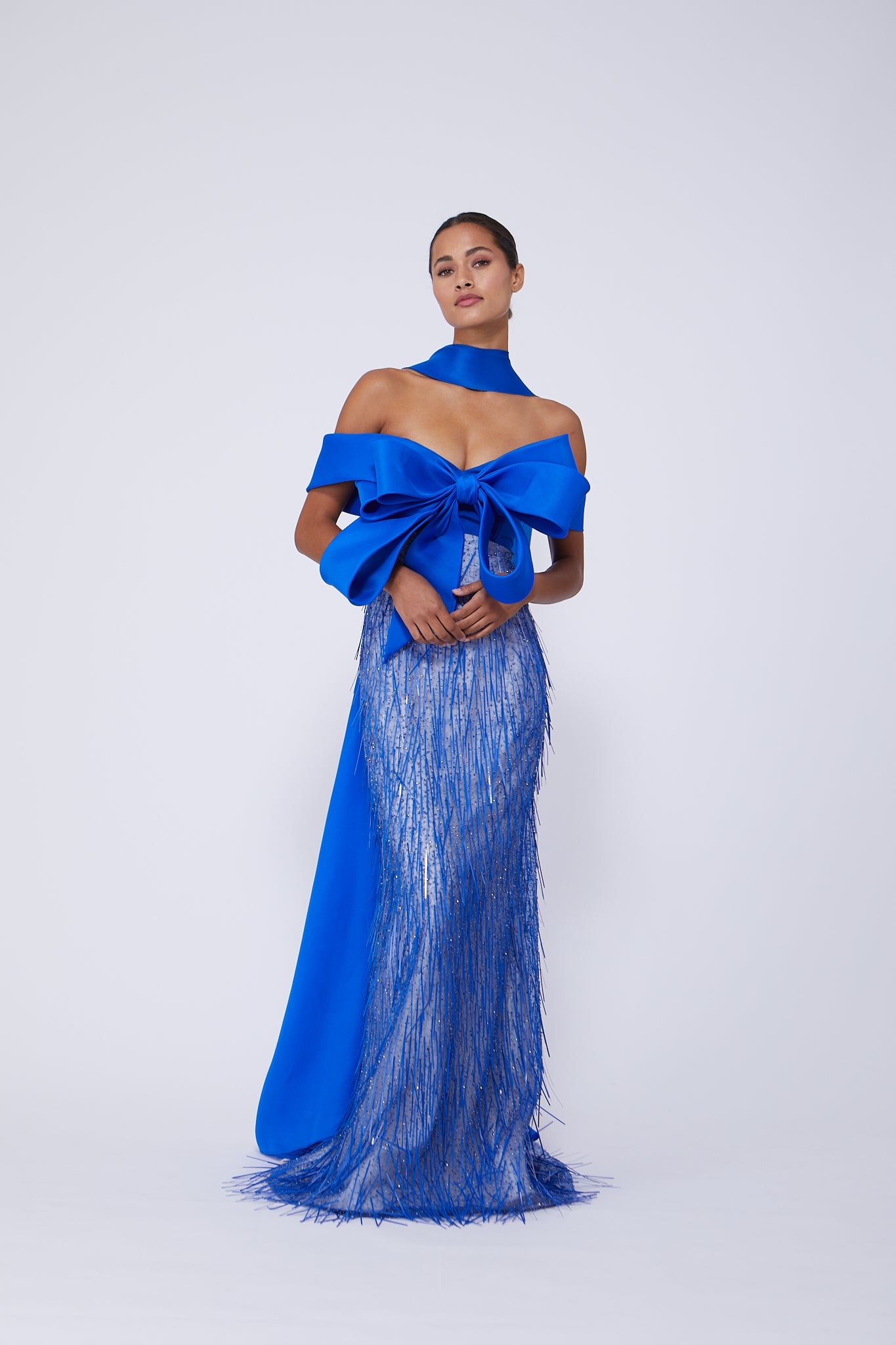 Detachable bow strapless fringe sequin gown