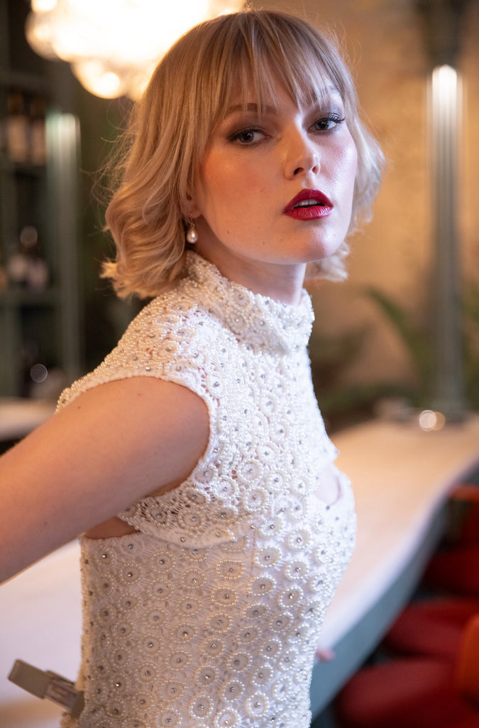 The high neckline and sleeveless topper design add a contemporary touch, perfectly balancing modernity with timeless glamour. Each bead has been meticulously applied to create a shimmering, textured effect that catches the light with every movement. Perfect for a chic, upscale wedding or evening reception, this gown is ideal for brides seeking unparalleled craftsmanship and dazzling appearances.