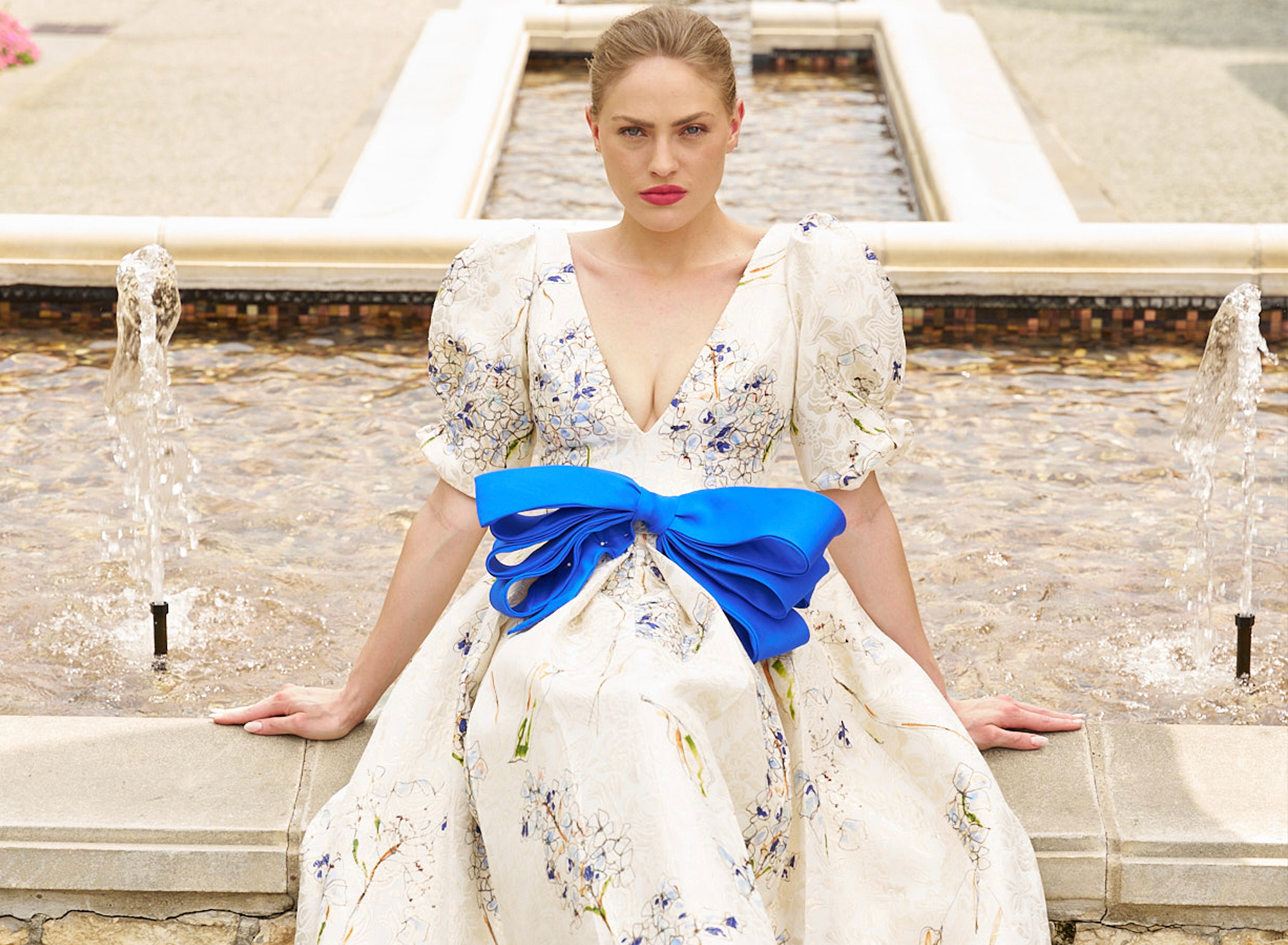 Deep V neck puff sleeve hydrangea jacquard box pleat dress with organza layered bow belt