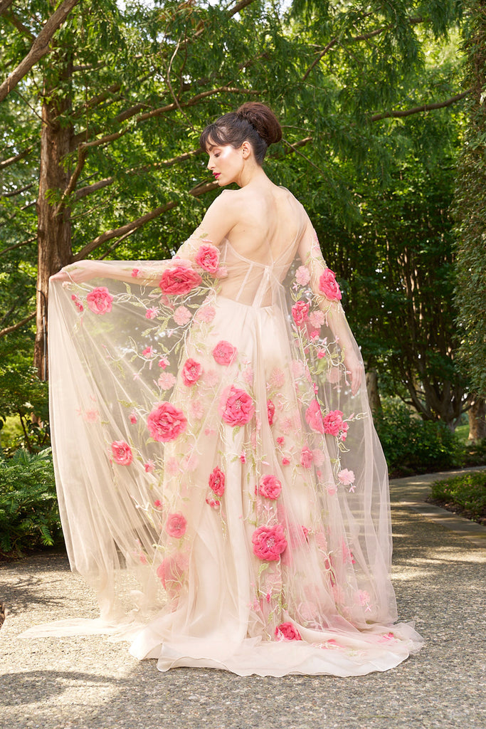Corset rose tulle embroidered gown with rose tulle embroidered cape