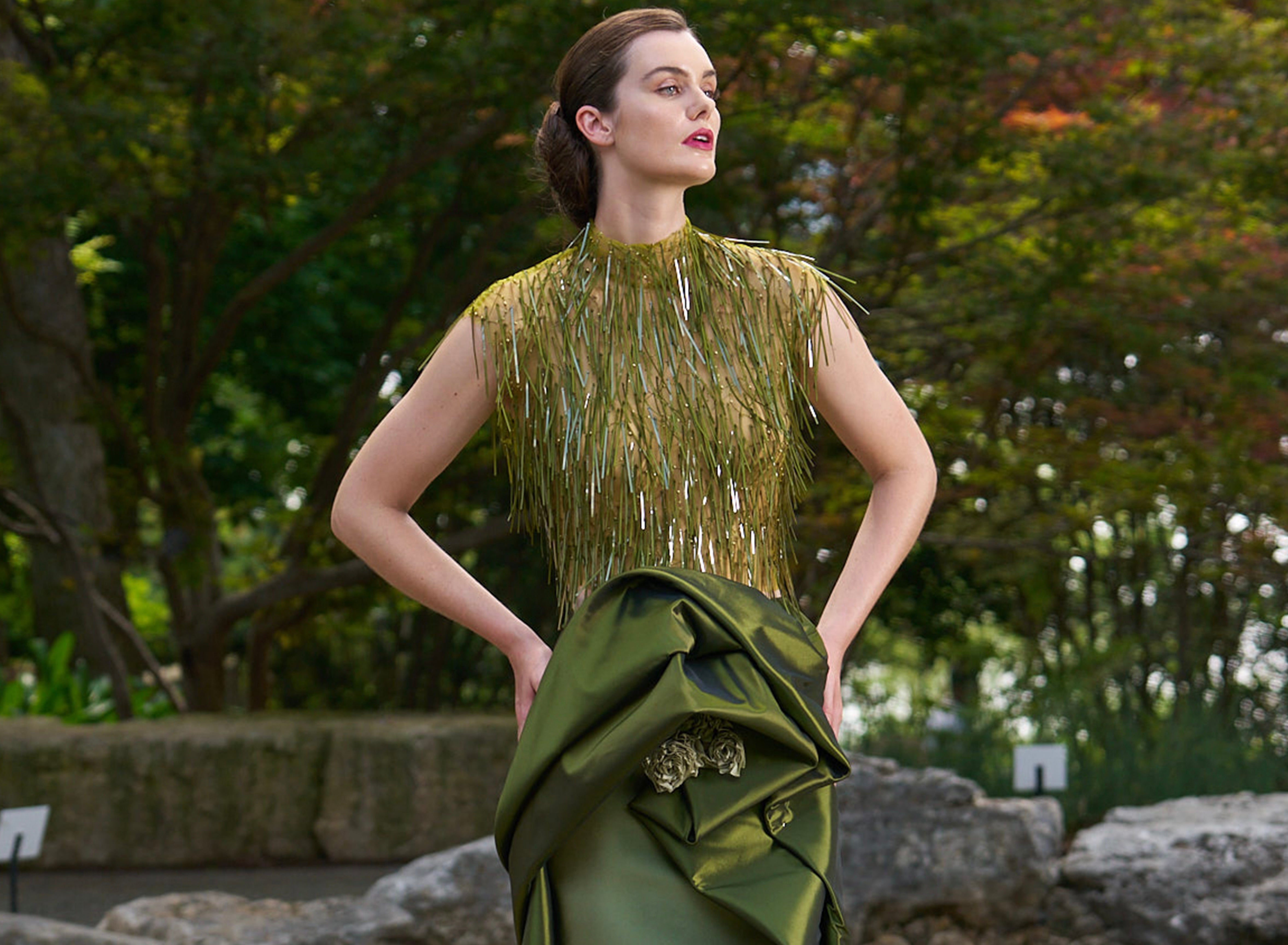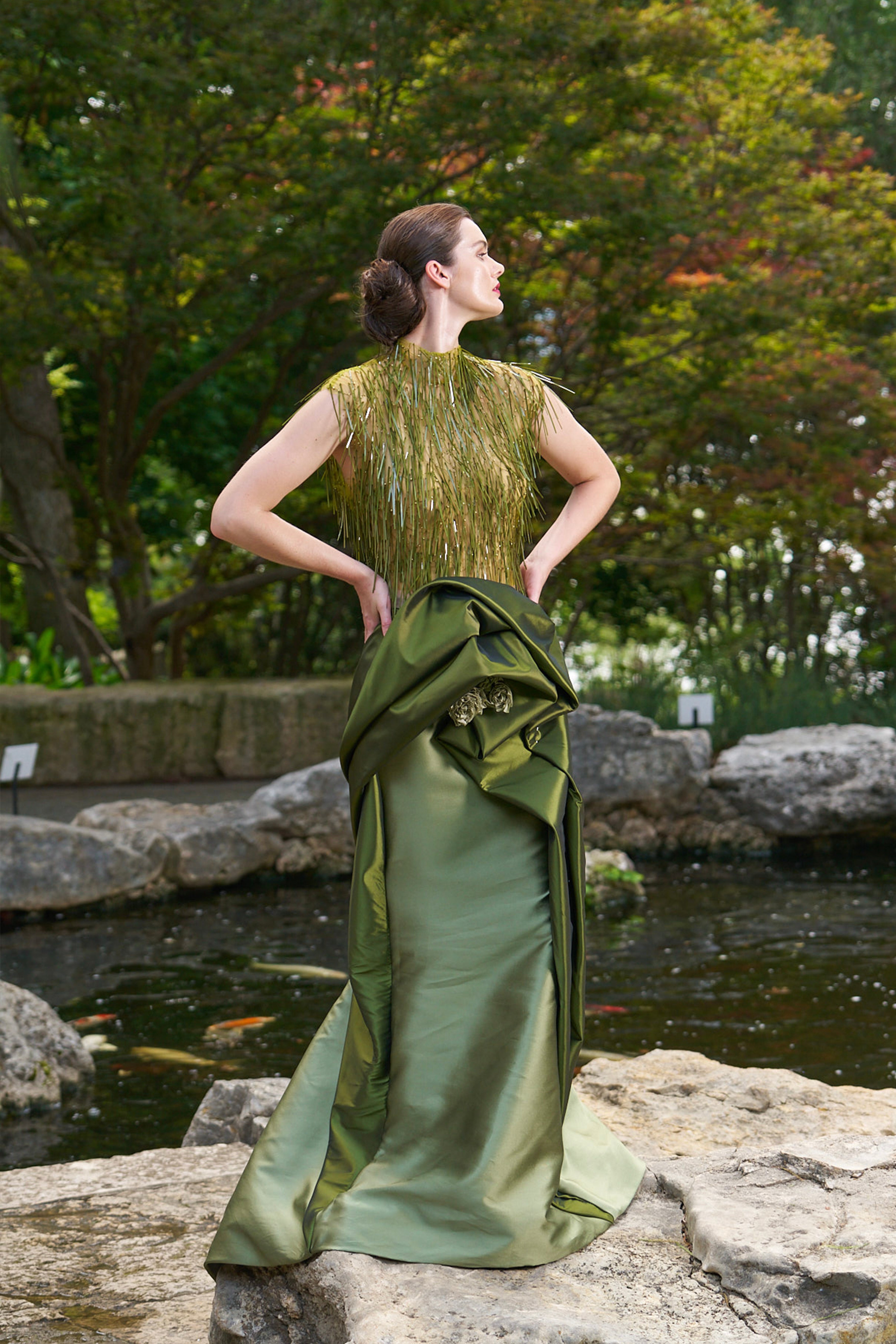 Fringe sequin satin gown with draped skirt and rosette embellishment