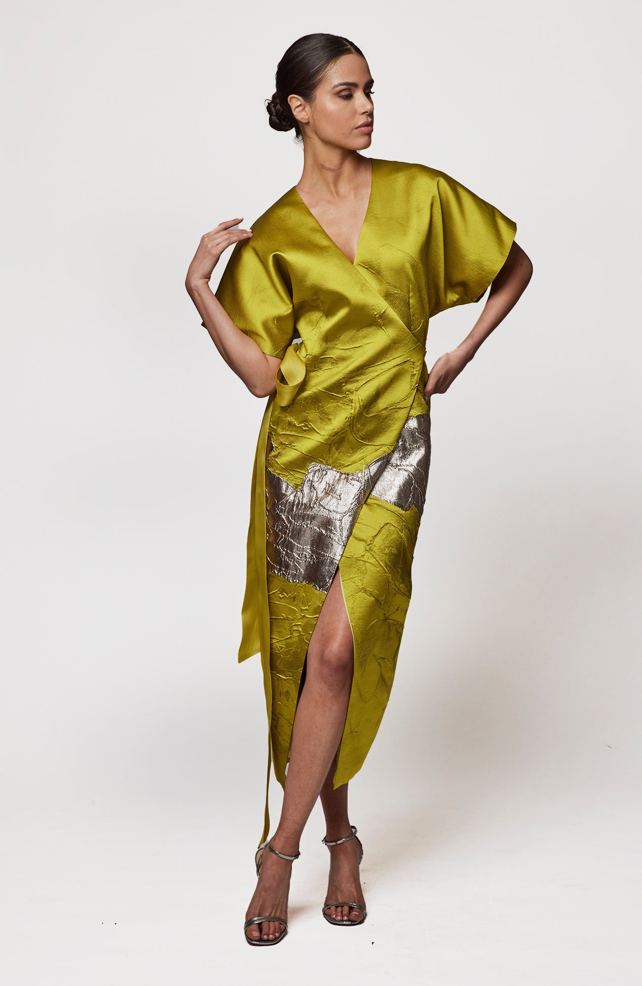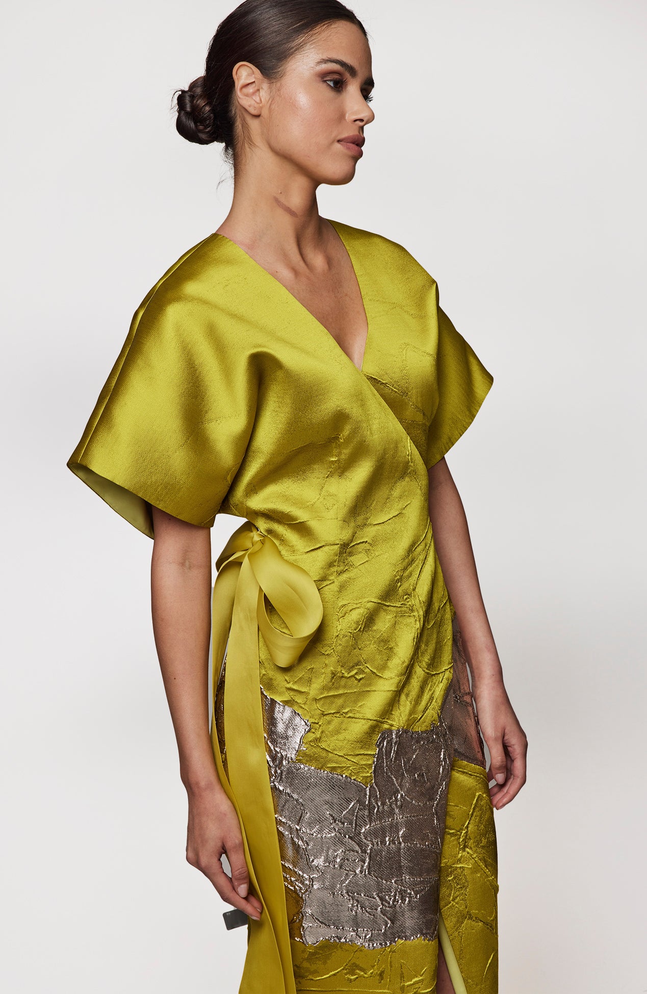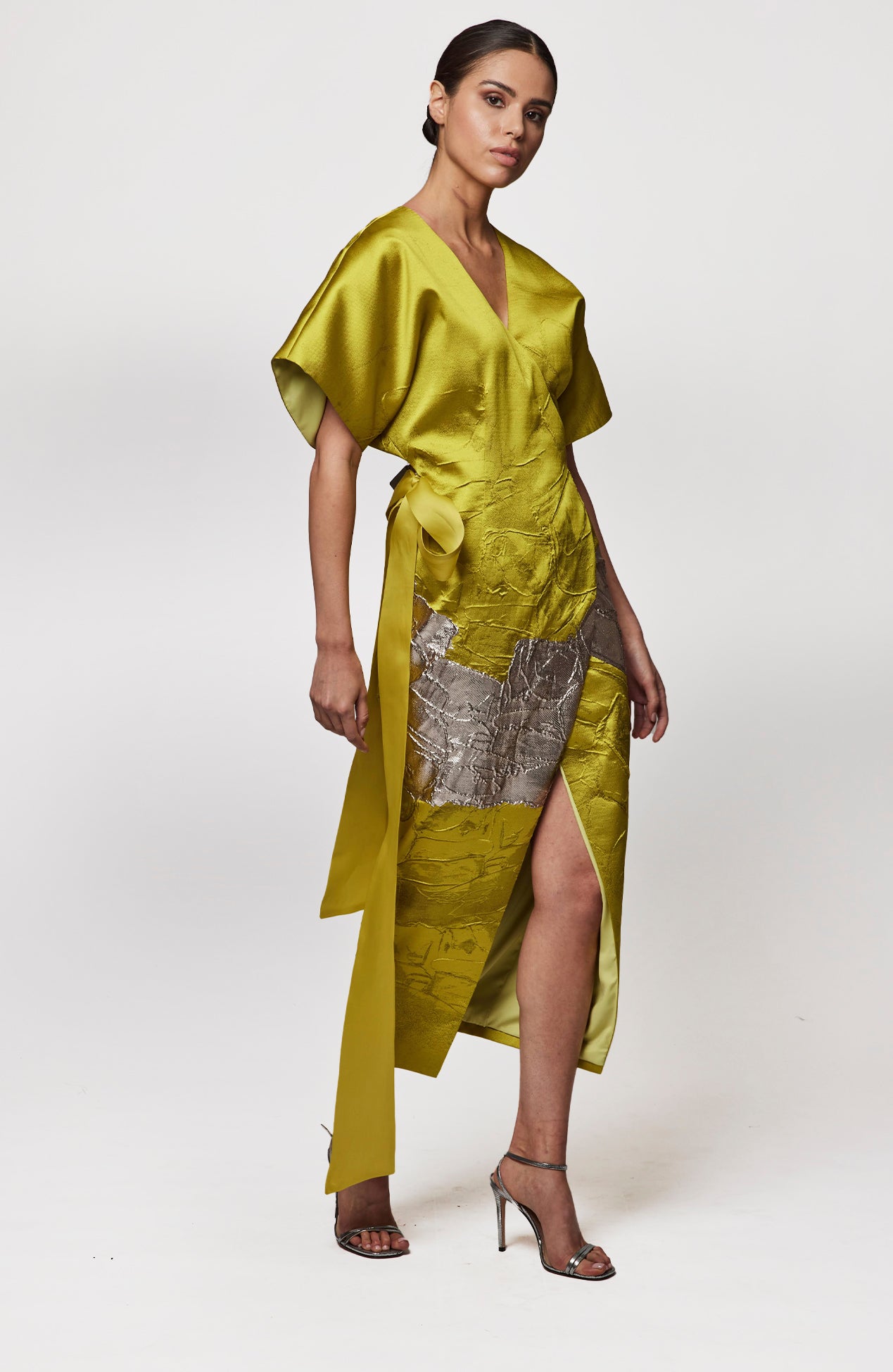 Metallic jacquard wrap dress with organza tie