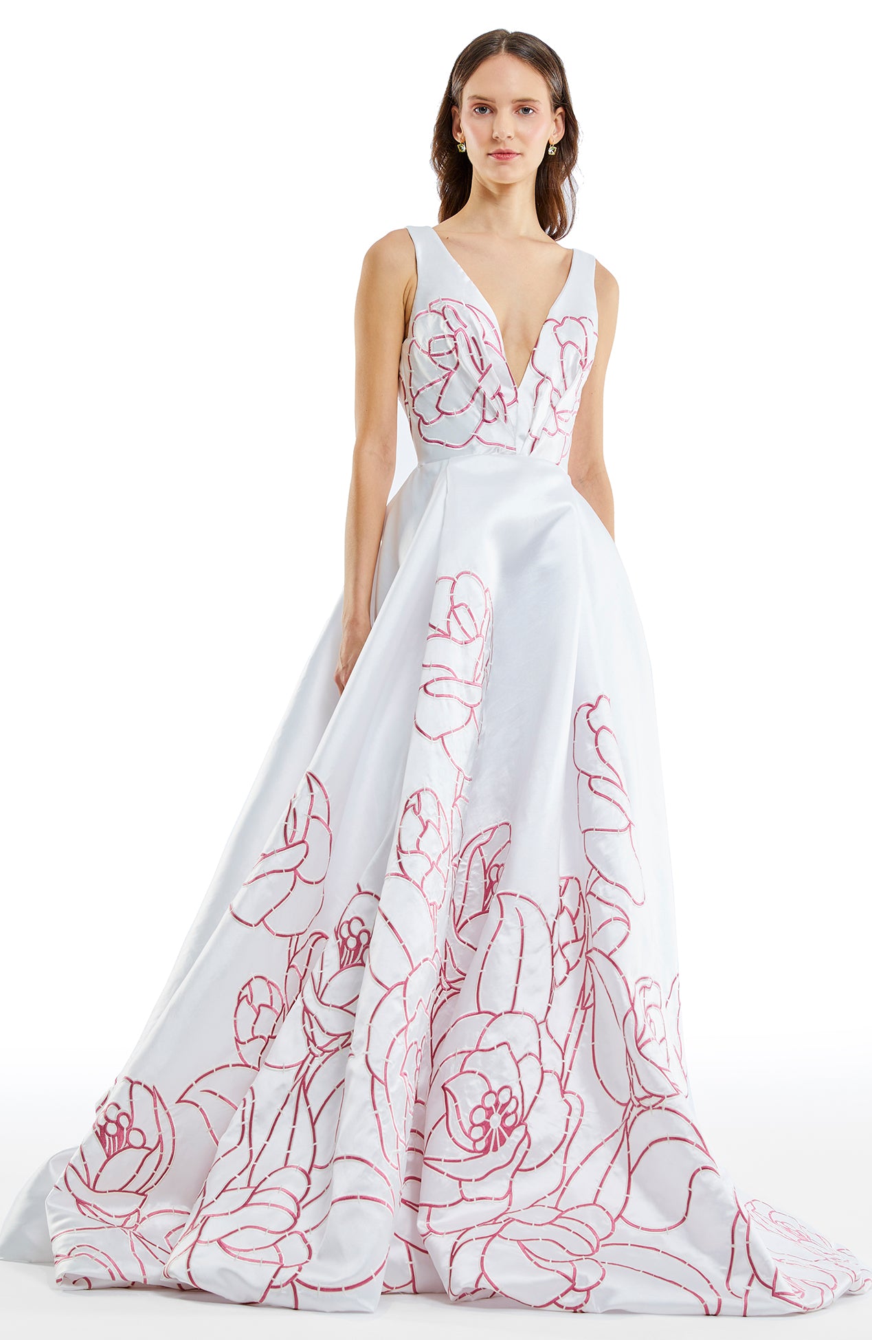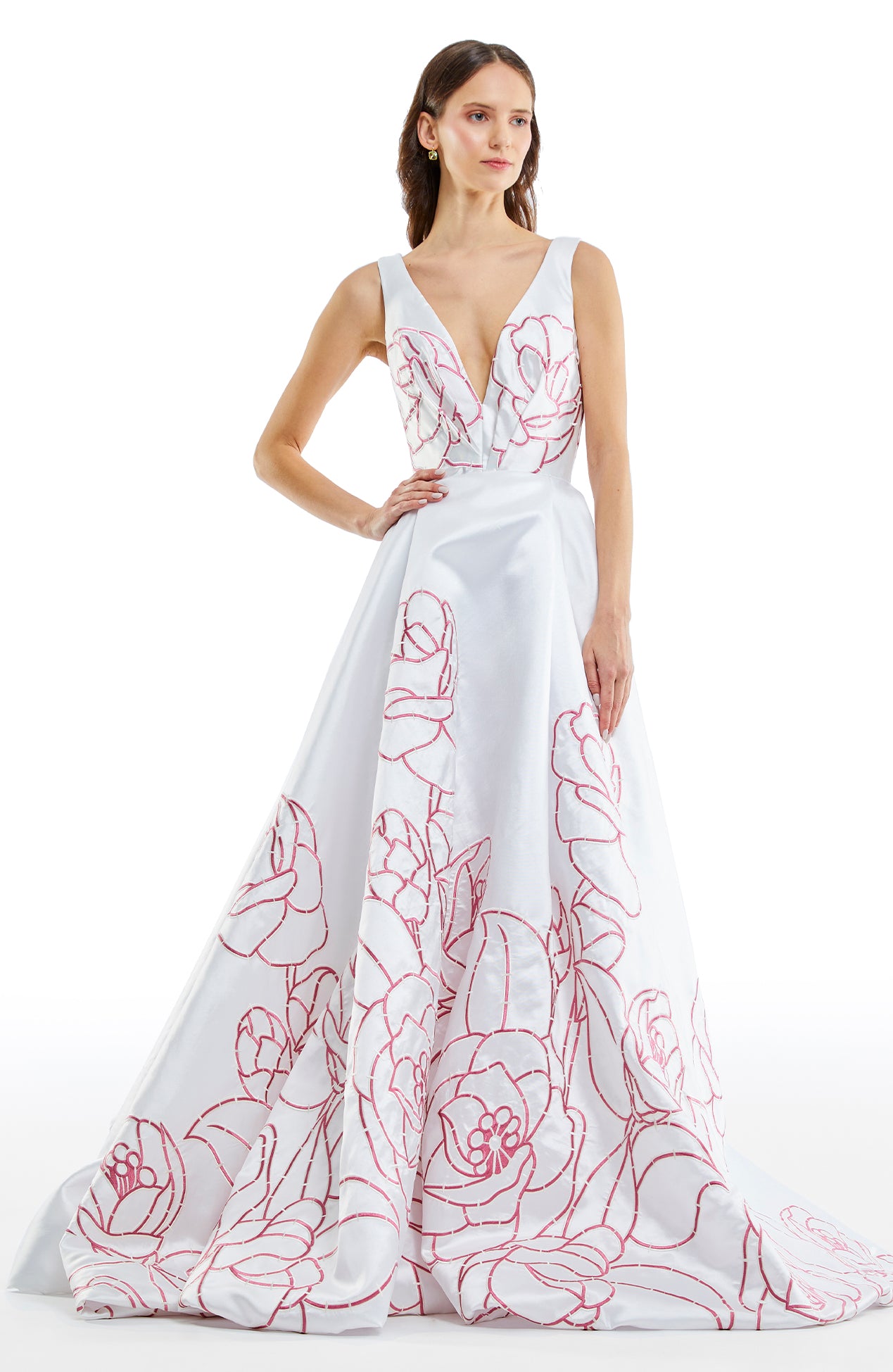 Deep V neck floral trim embroidered a line gown