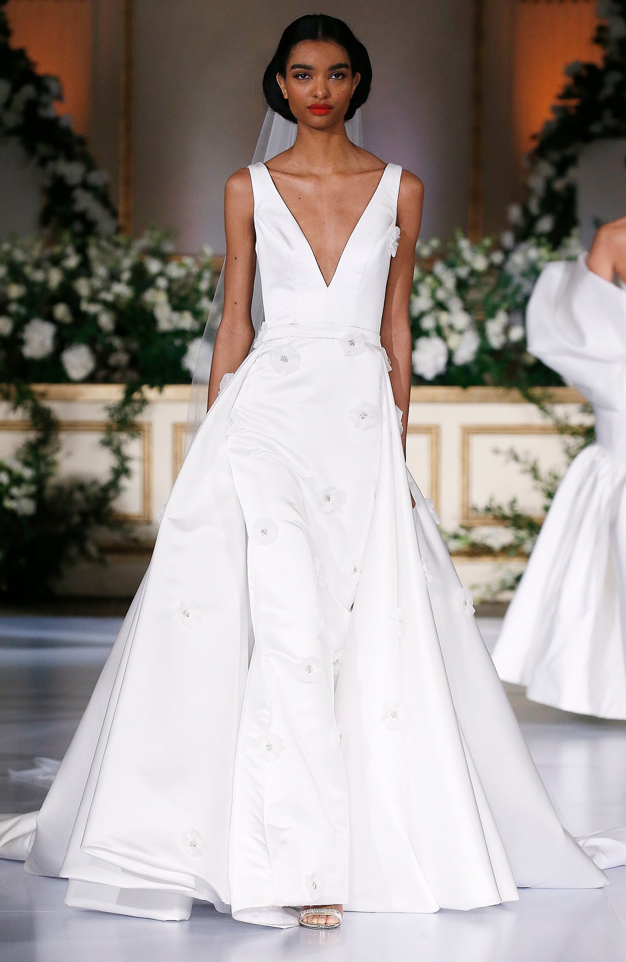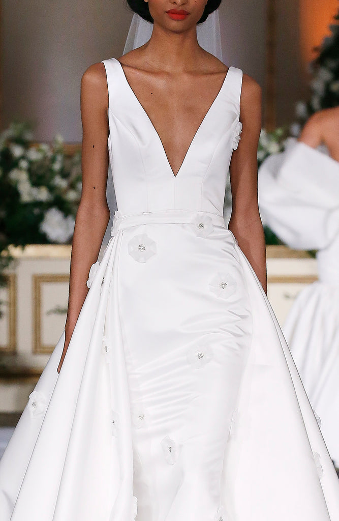 Deep V Neck Satin Gown with 3D flowers and detachable skirt