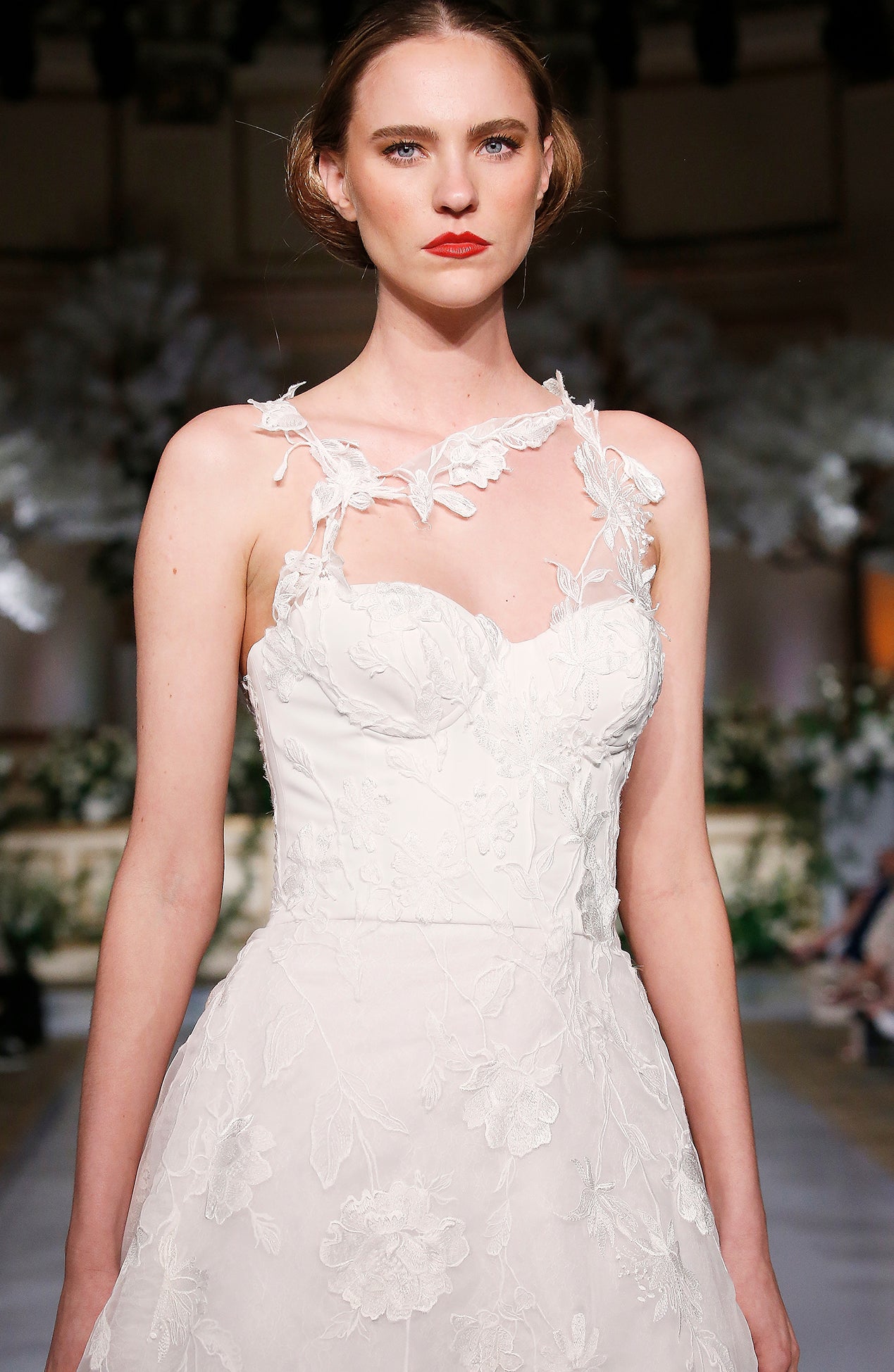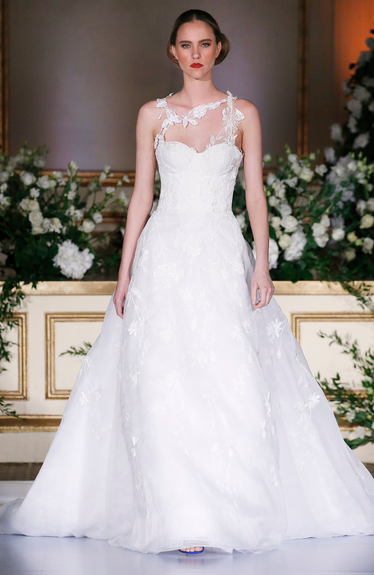 One shoulder floral embroidered bustier gown