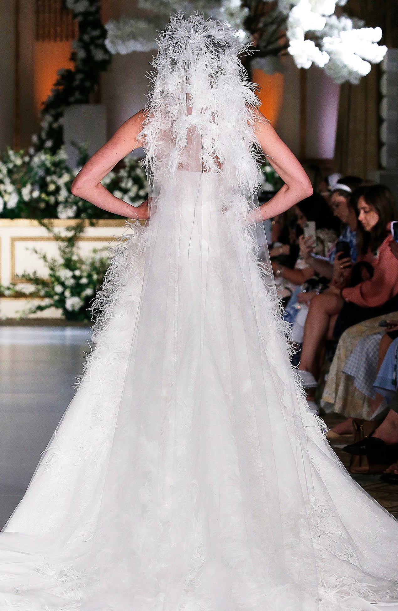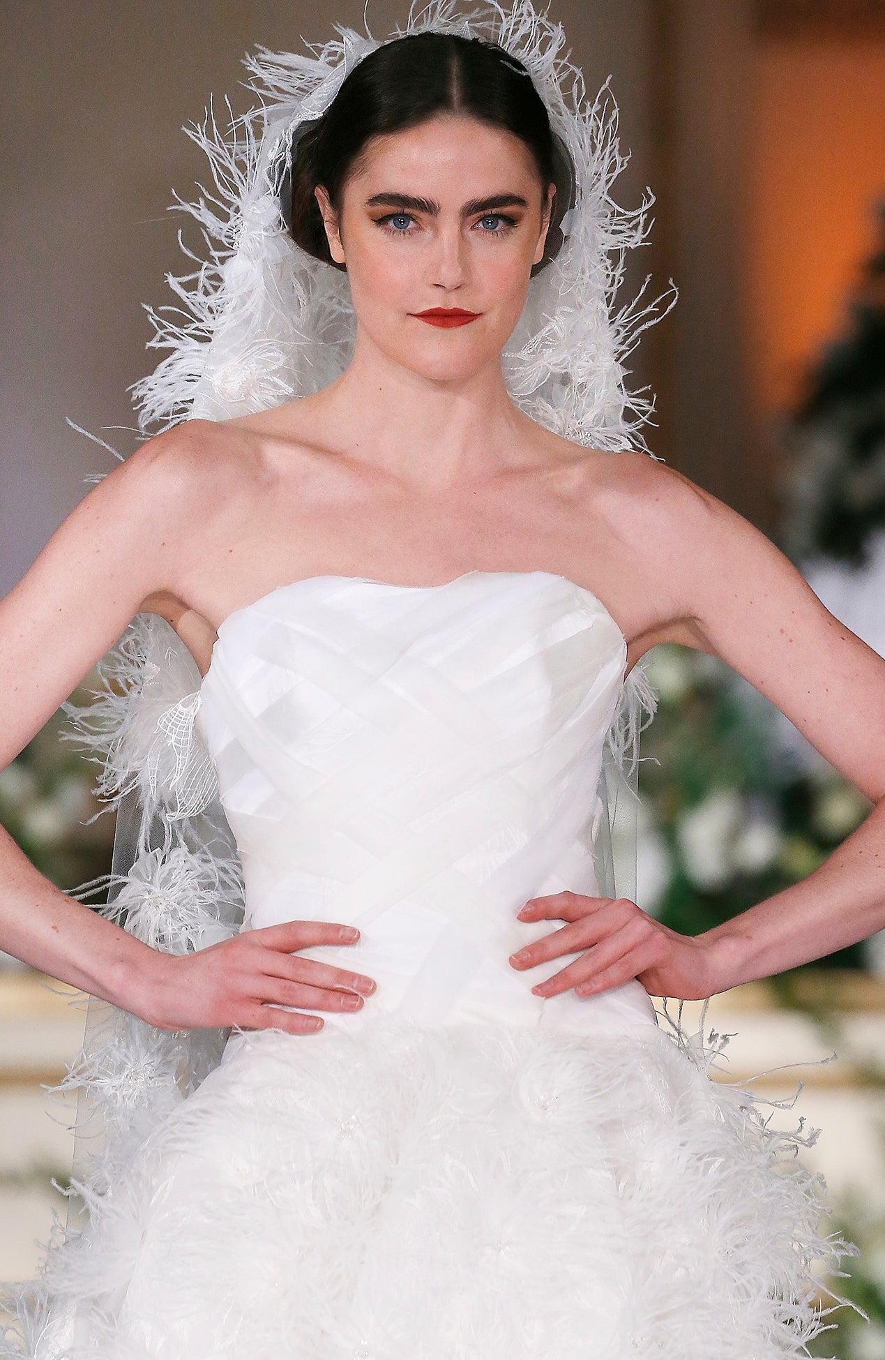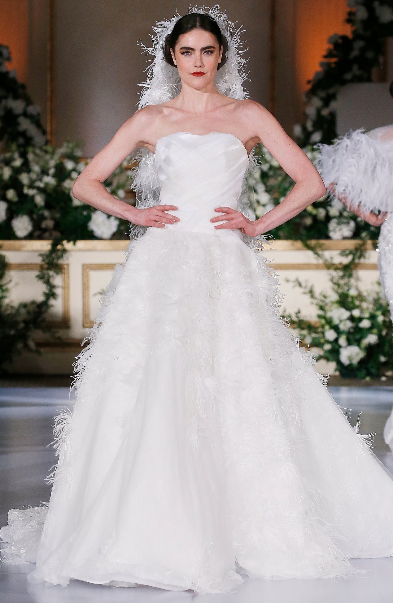 Strapless feather tulle embroidered gown with basket weave organza bodice
