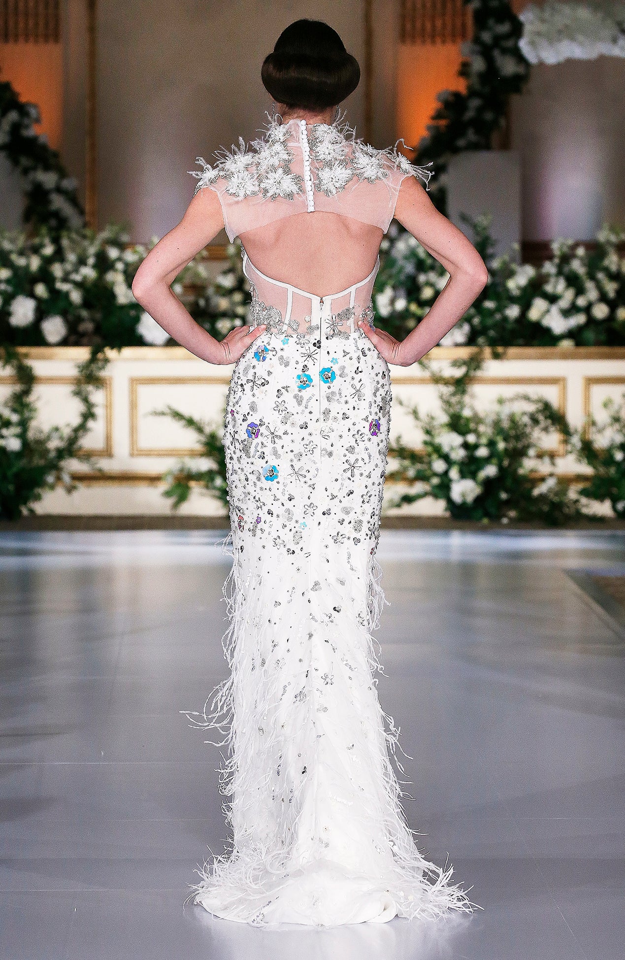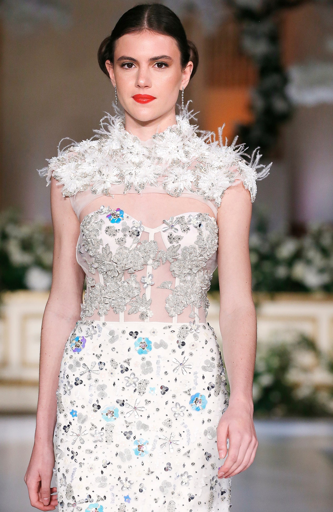Sweetheart beaded corset gown with trickling feathers