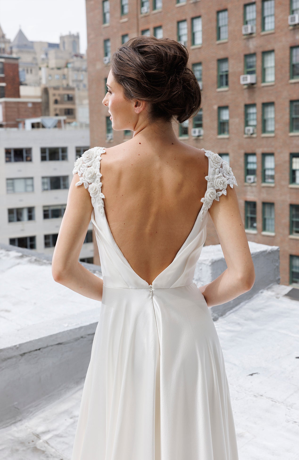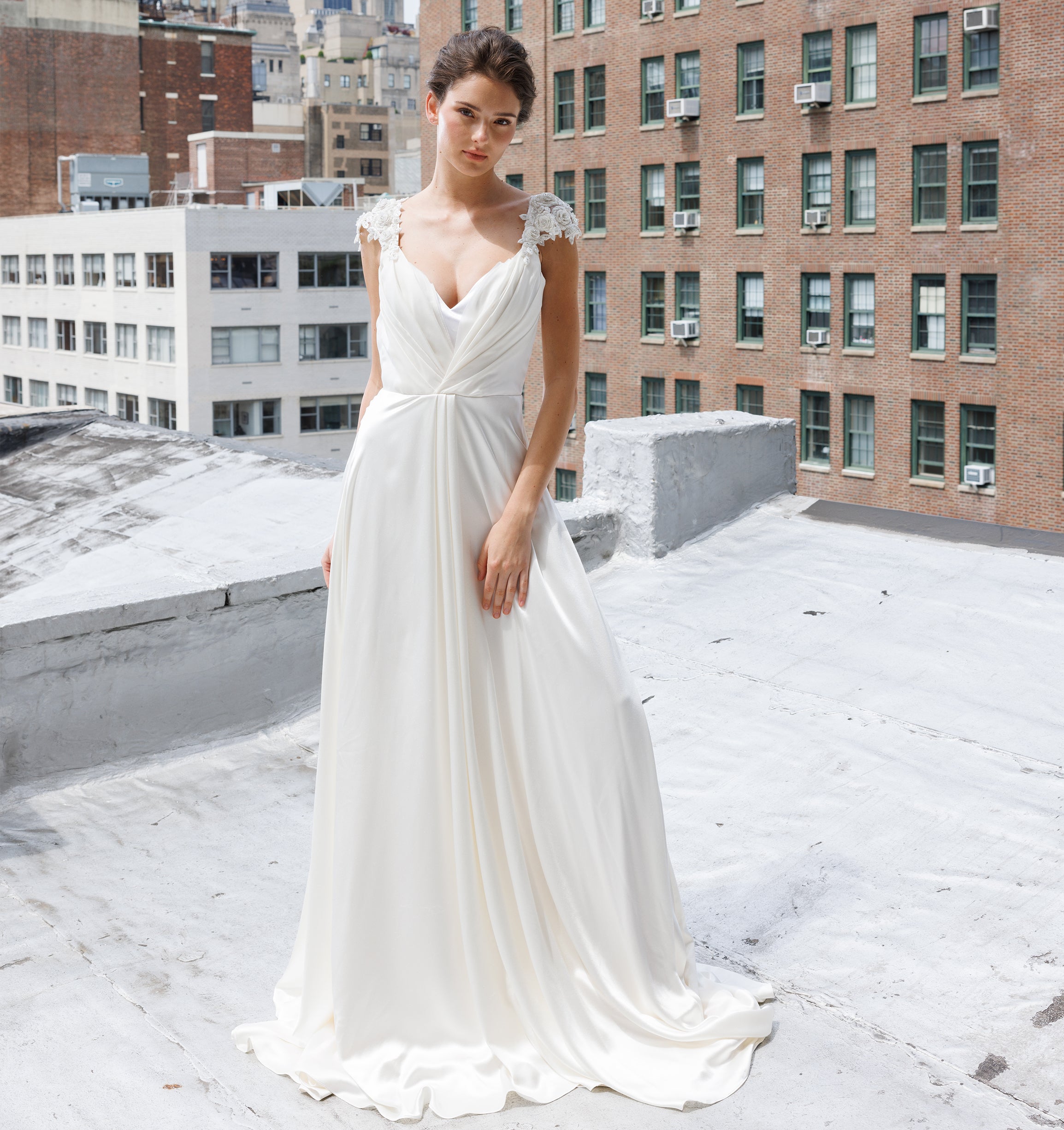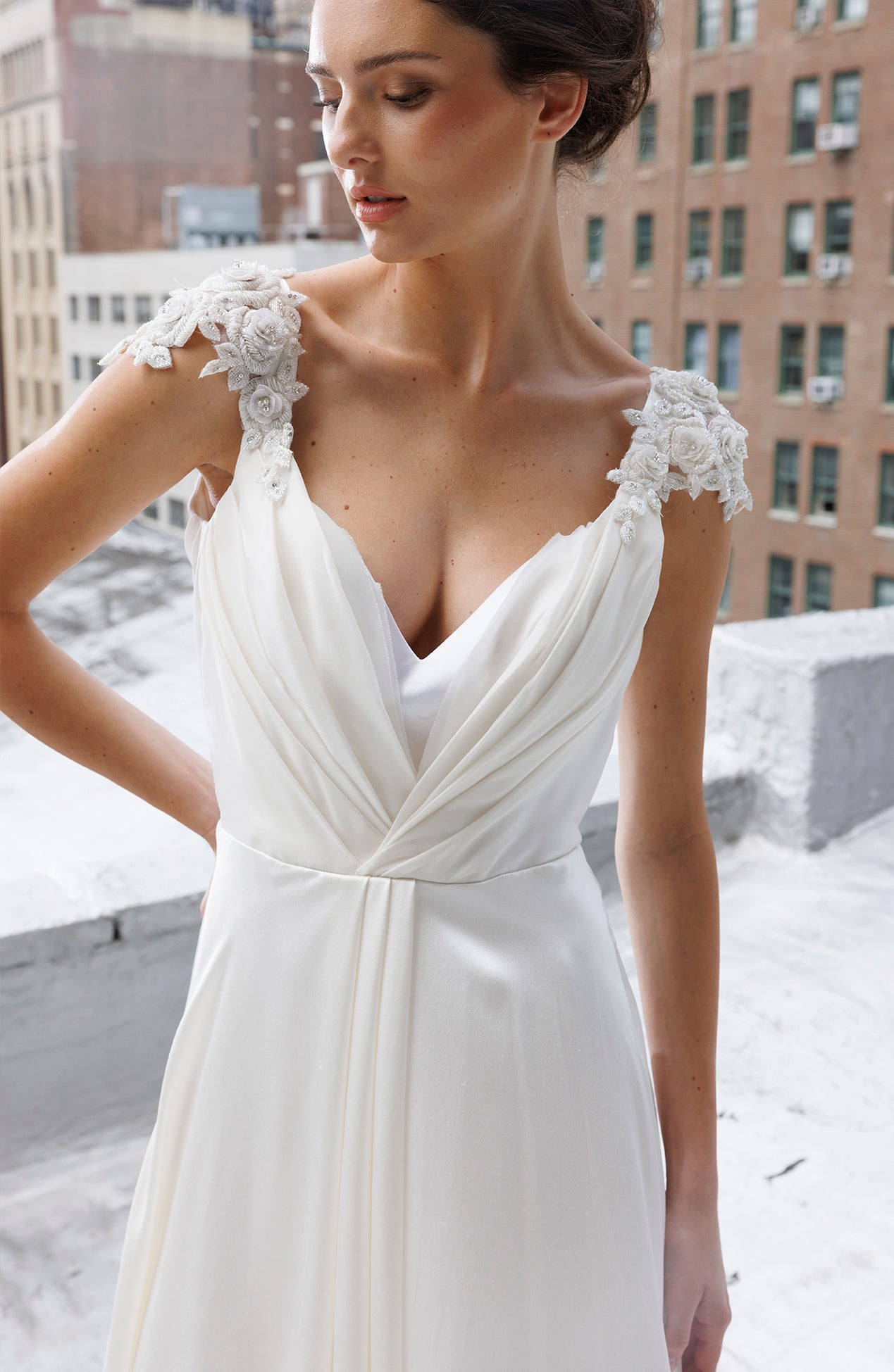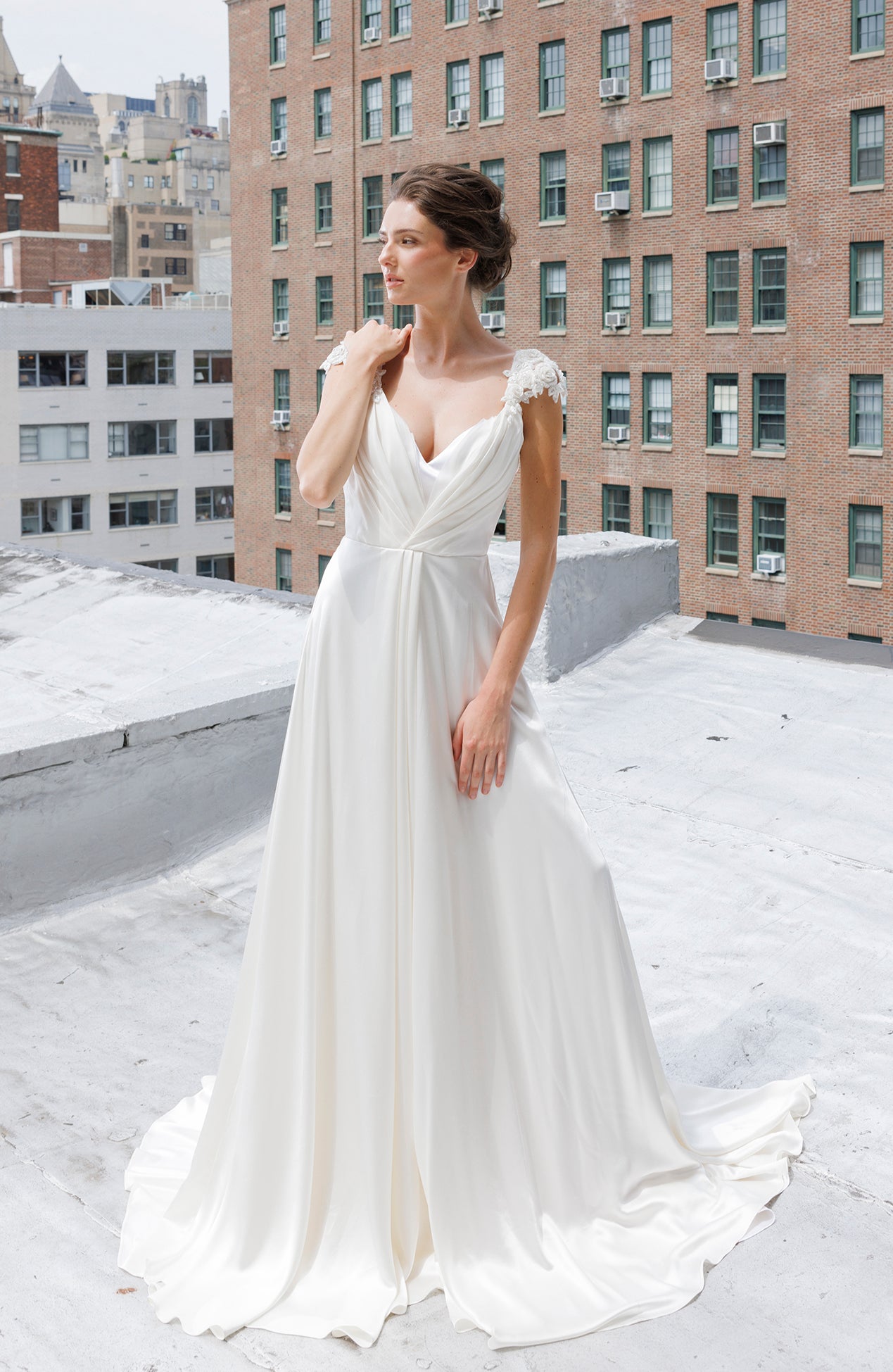 Beaded cap sleeve pleated organza bodice charmeuse gown