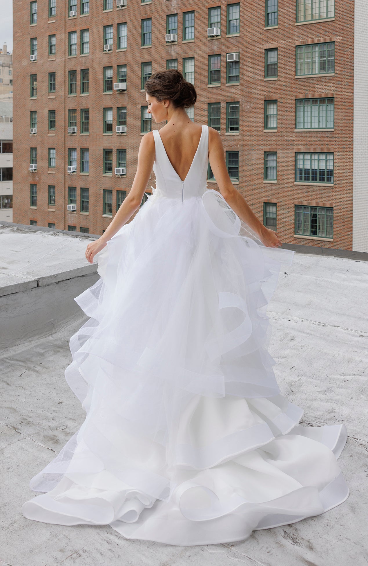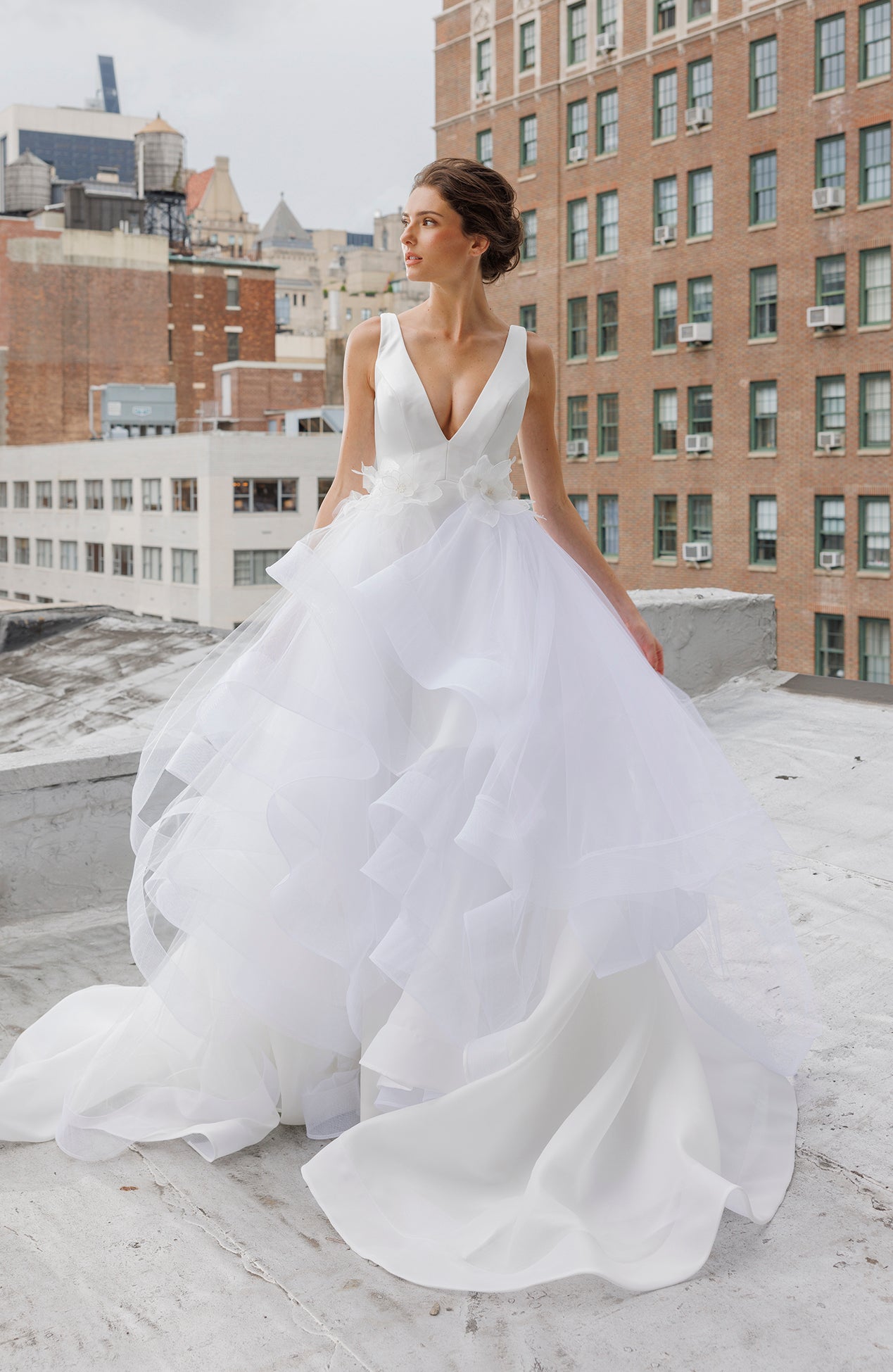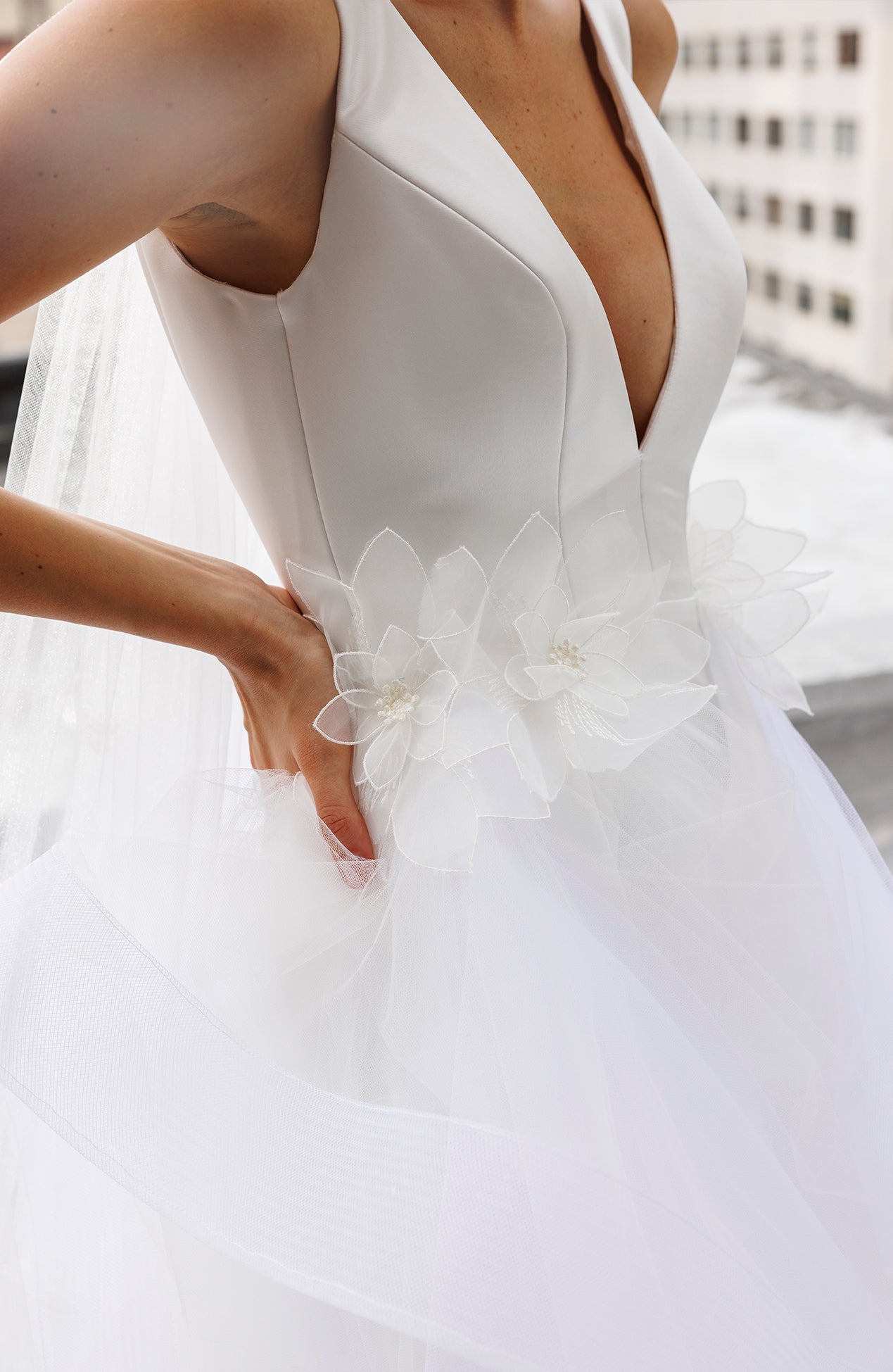 Deep V neck tulle ballgown with 3D floral appliqué