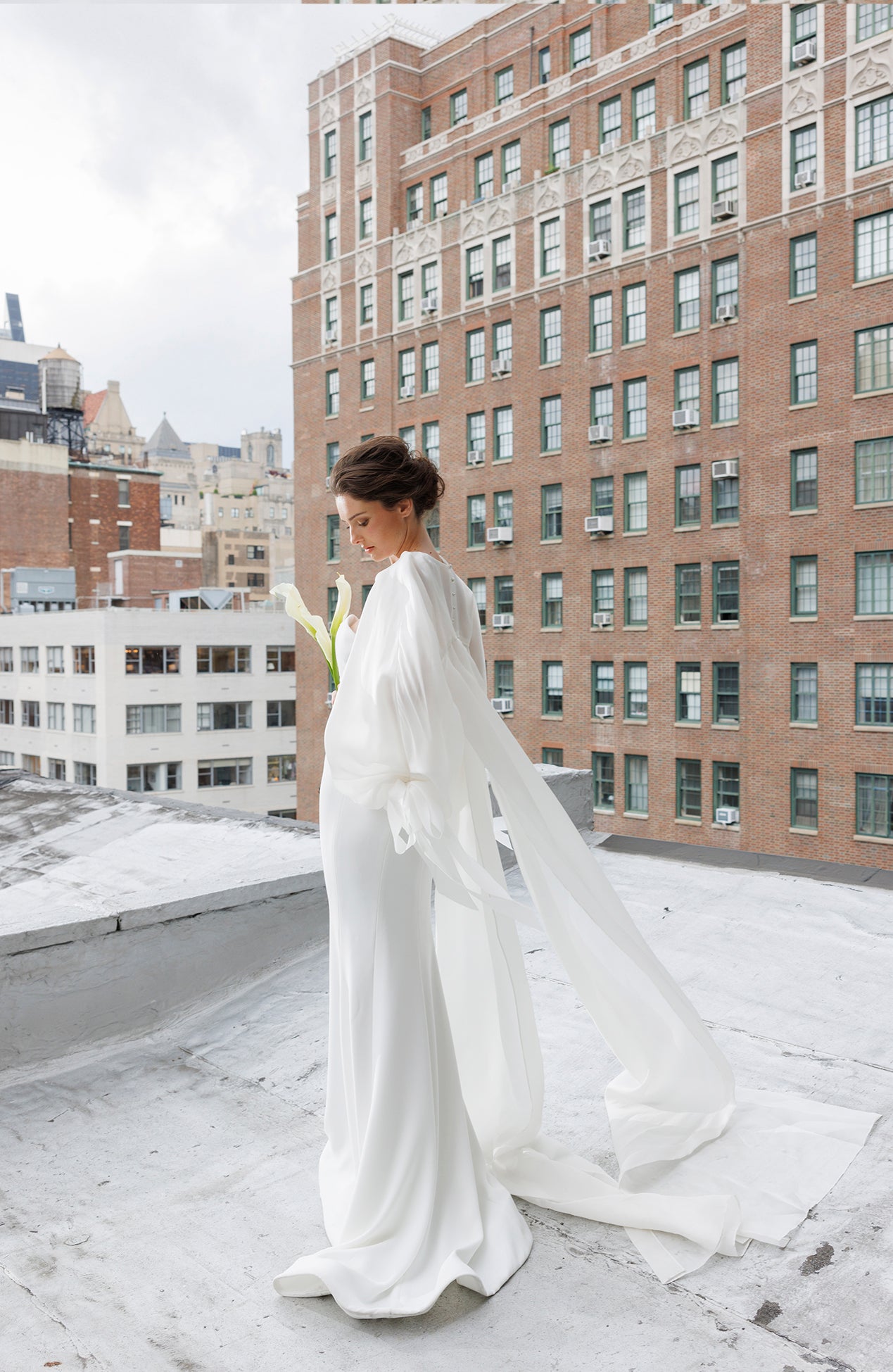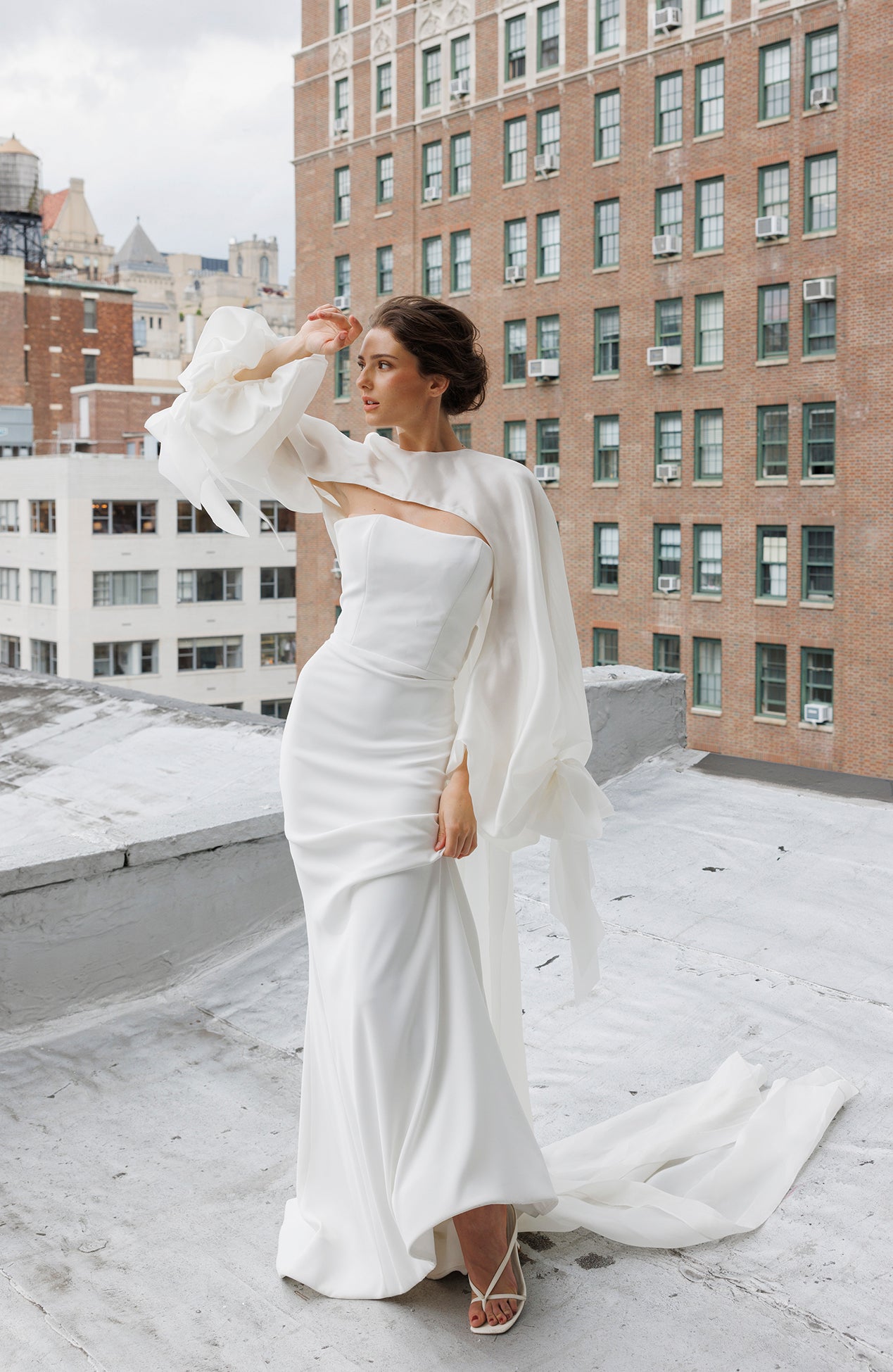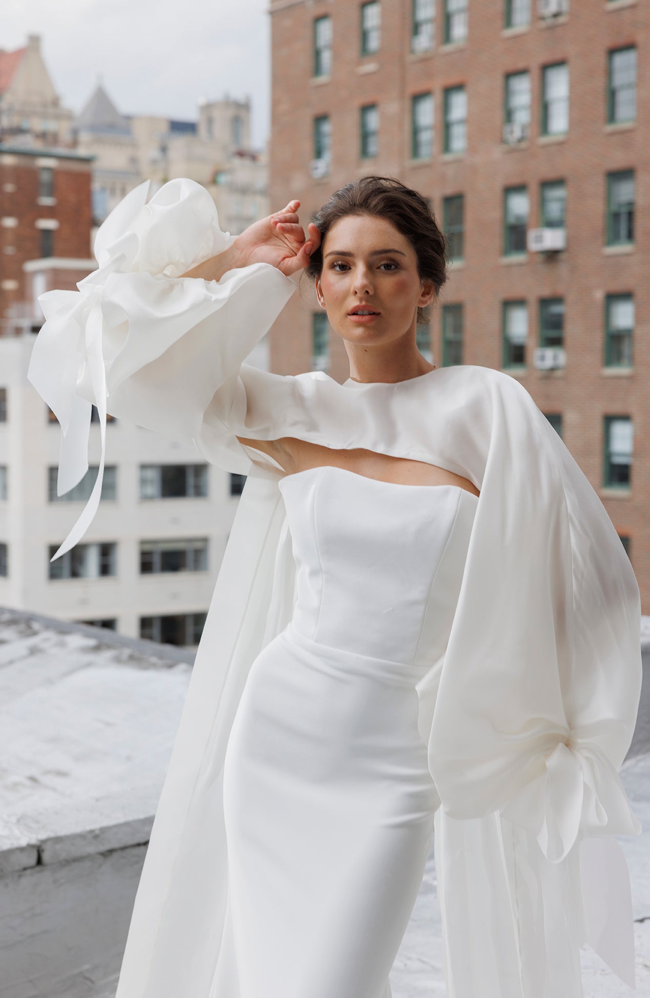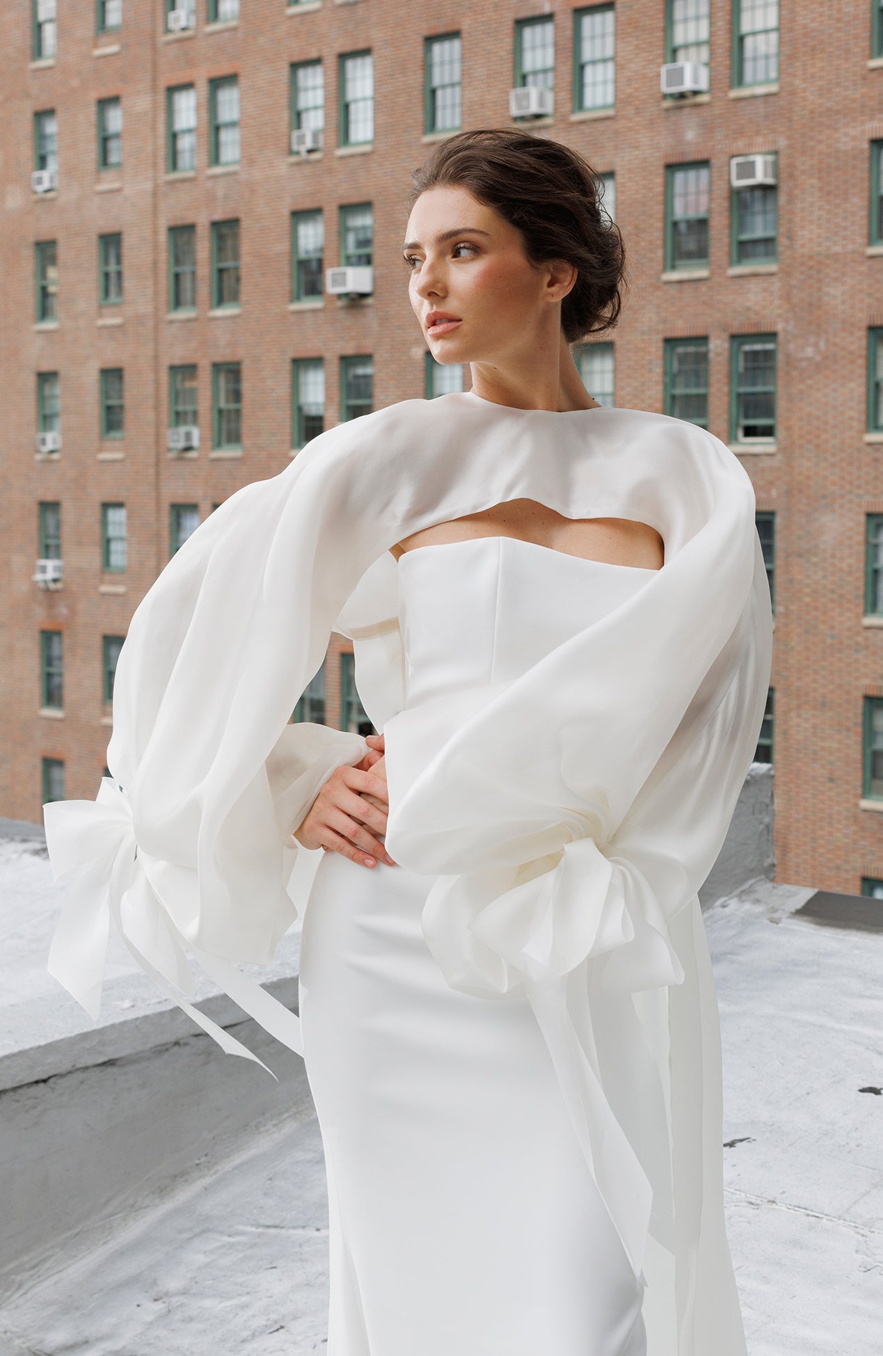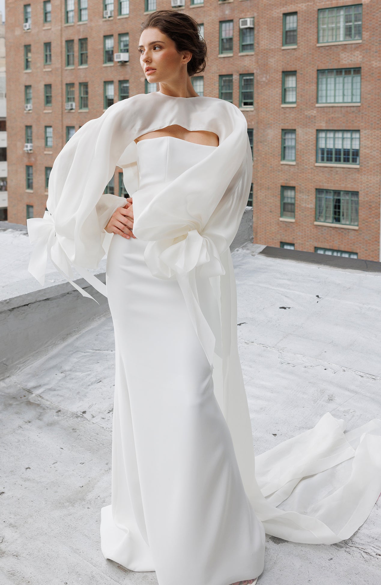 Bishop sleeve organza topper with bow details and long tails paired with strapless crepe gown