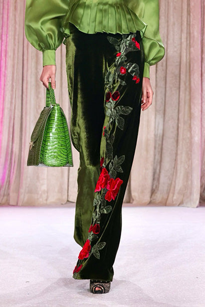 A pairing between luxurious velvet, feminine floral embroidery and tailored organza blouse.