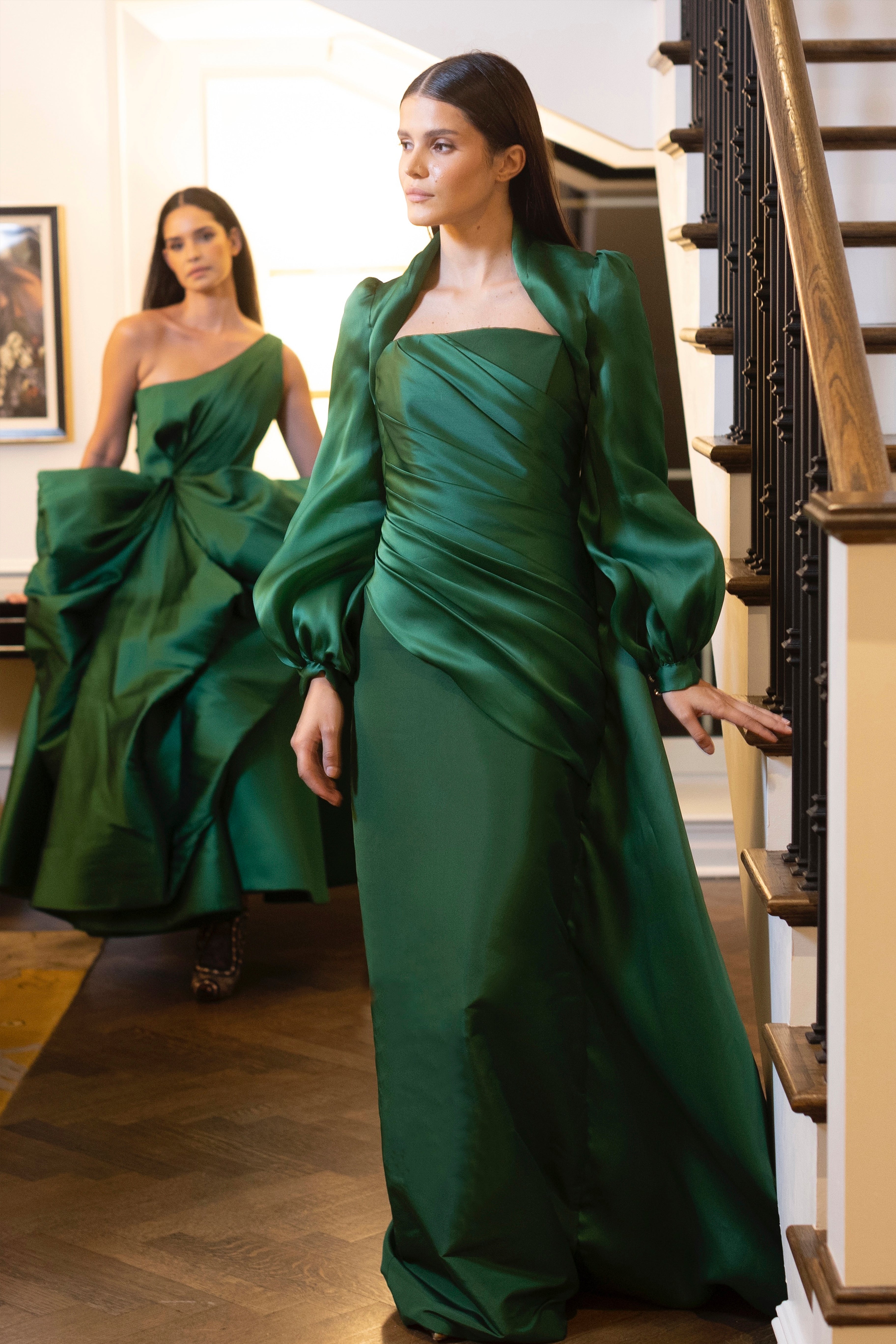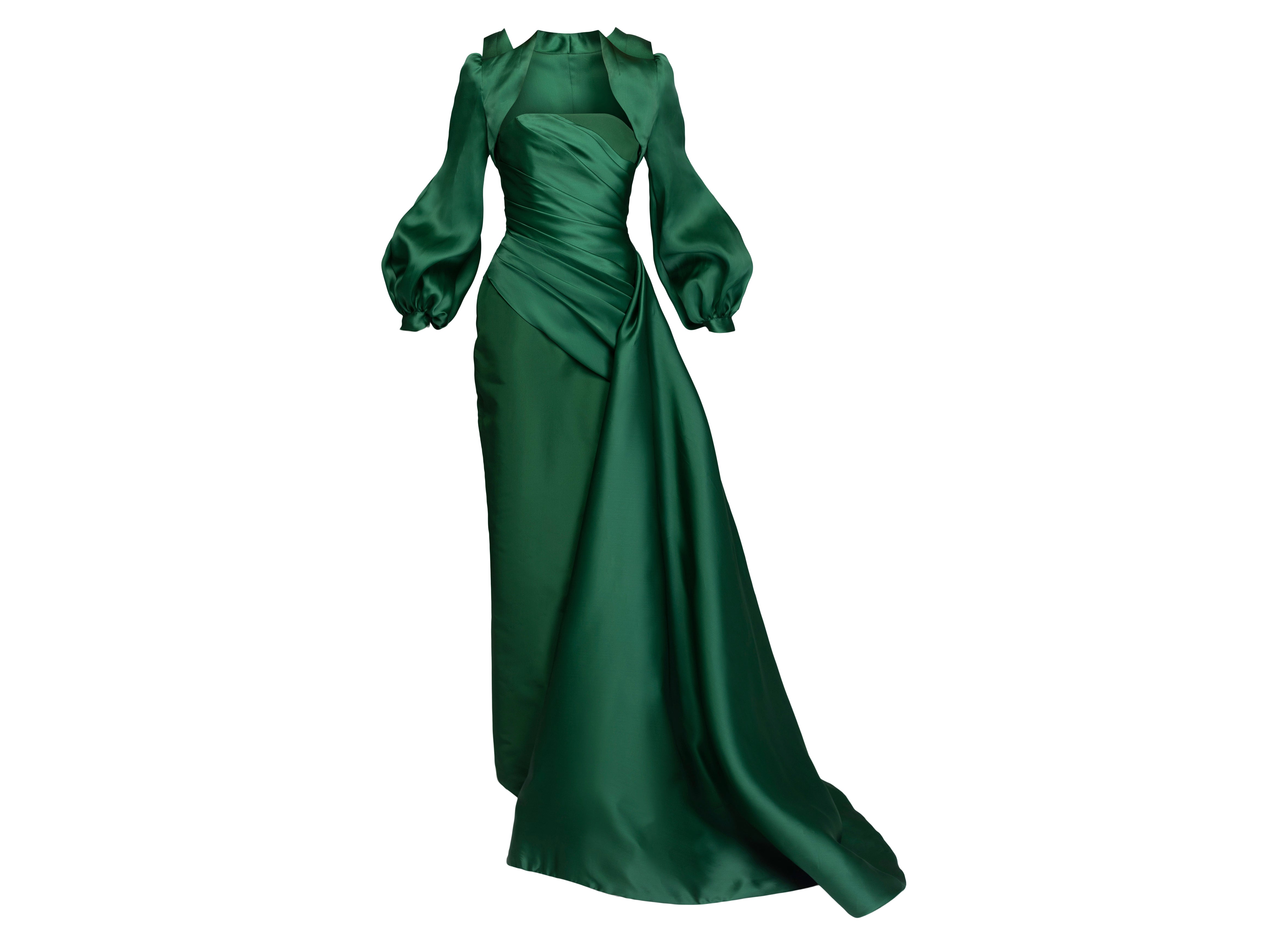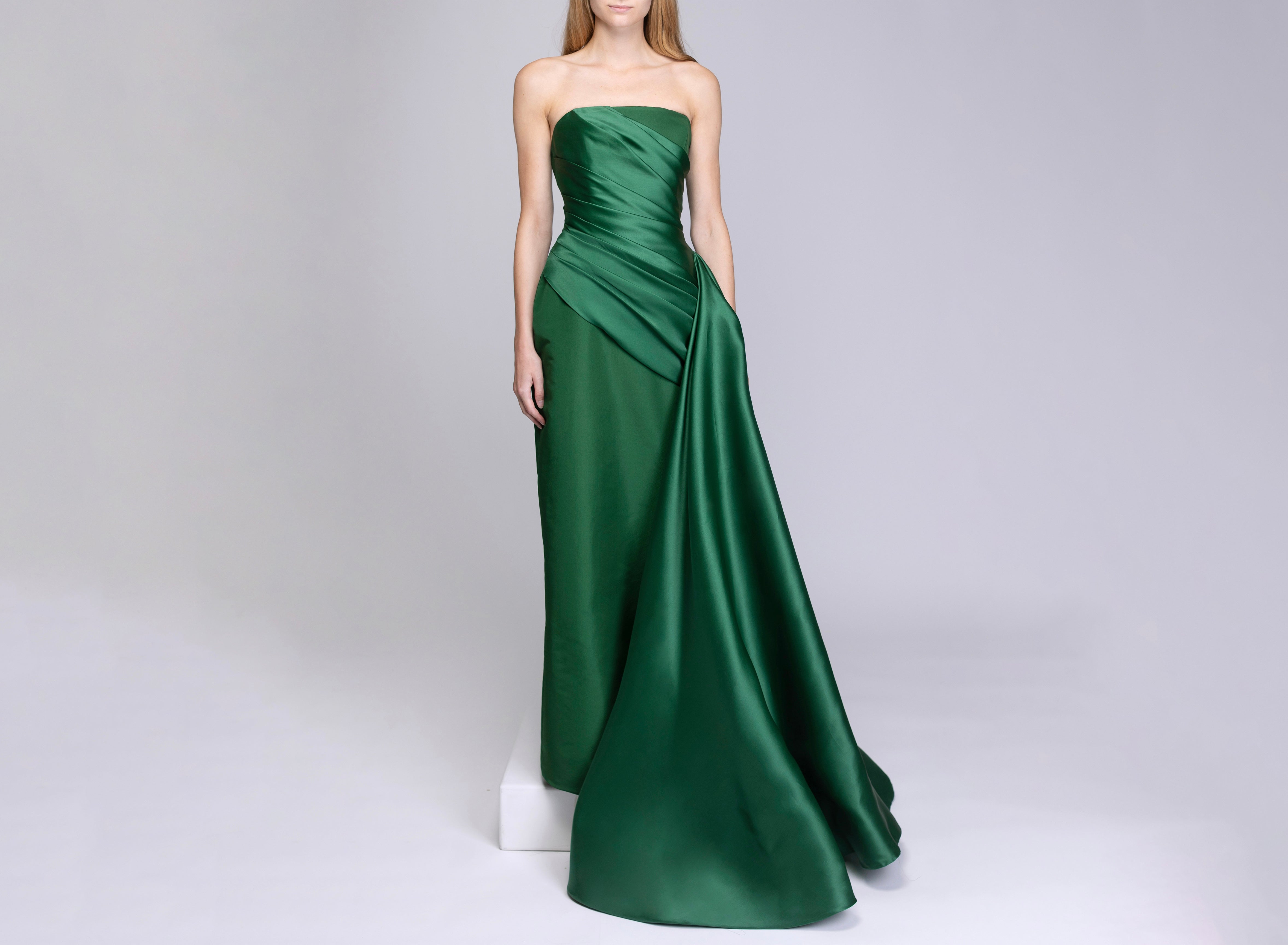 Pleated Strapless Silk Faille Gown with Satin Organza Side Train