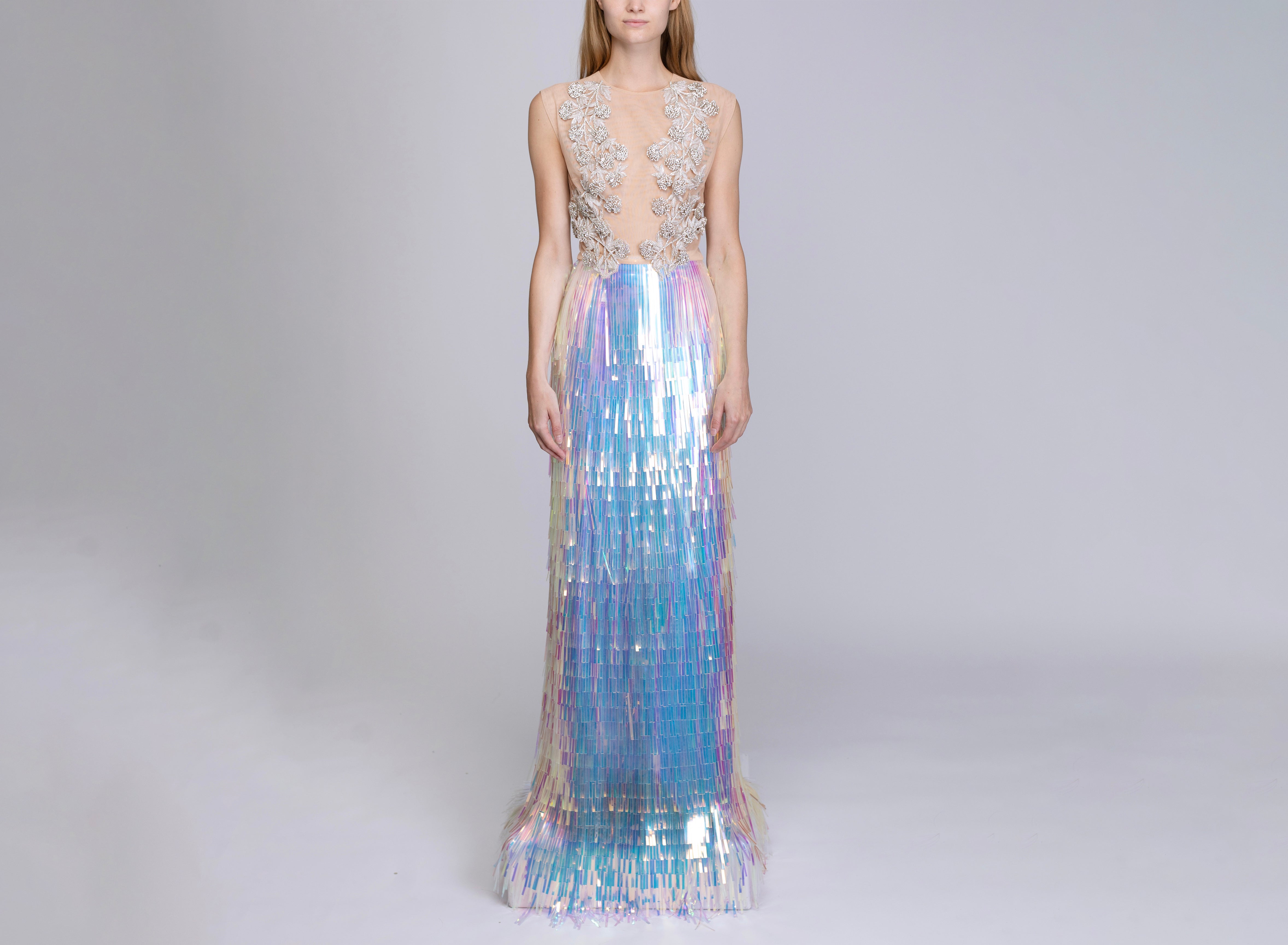 illusion tulle scoop neck with 3d crystal embroidery paired with irridescent fringe full length collumn skirt