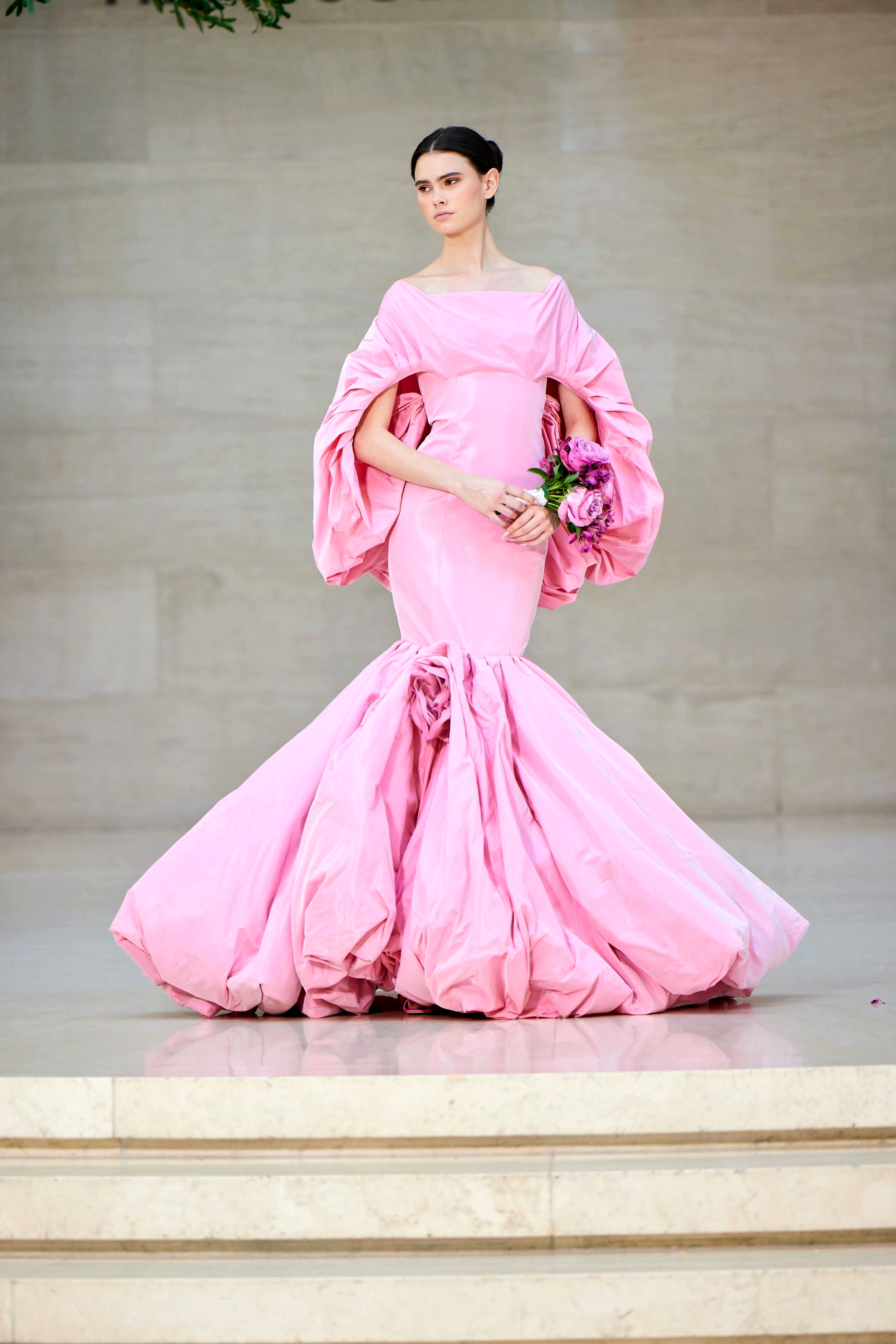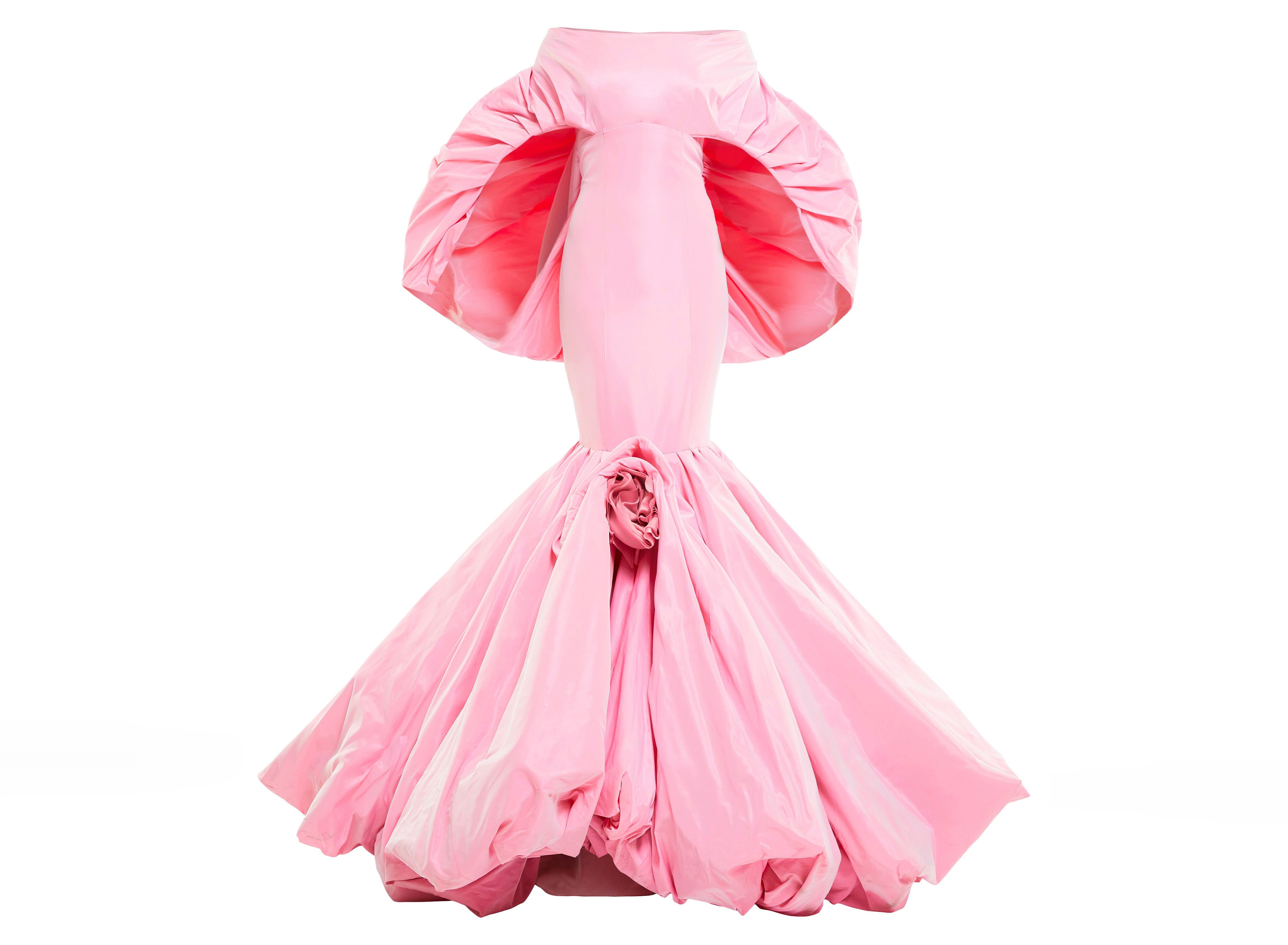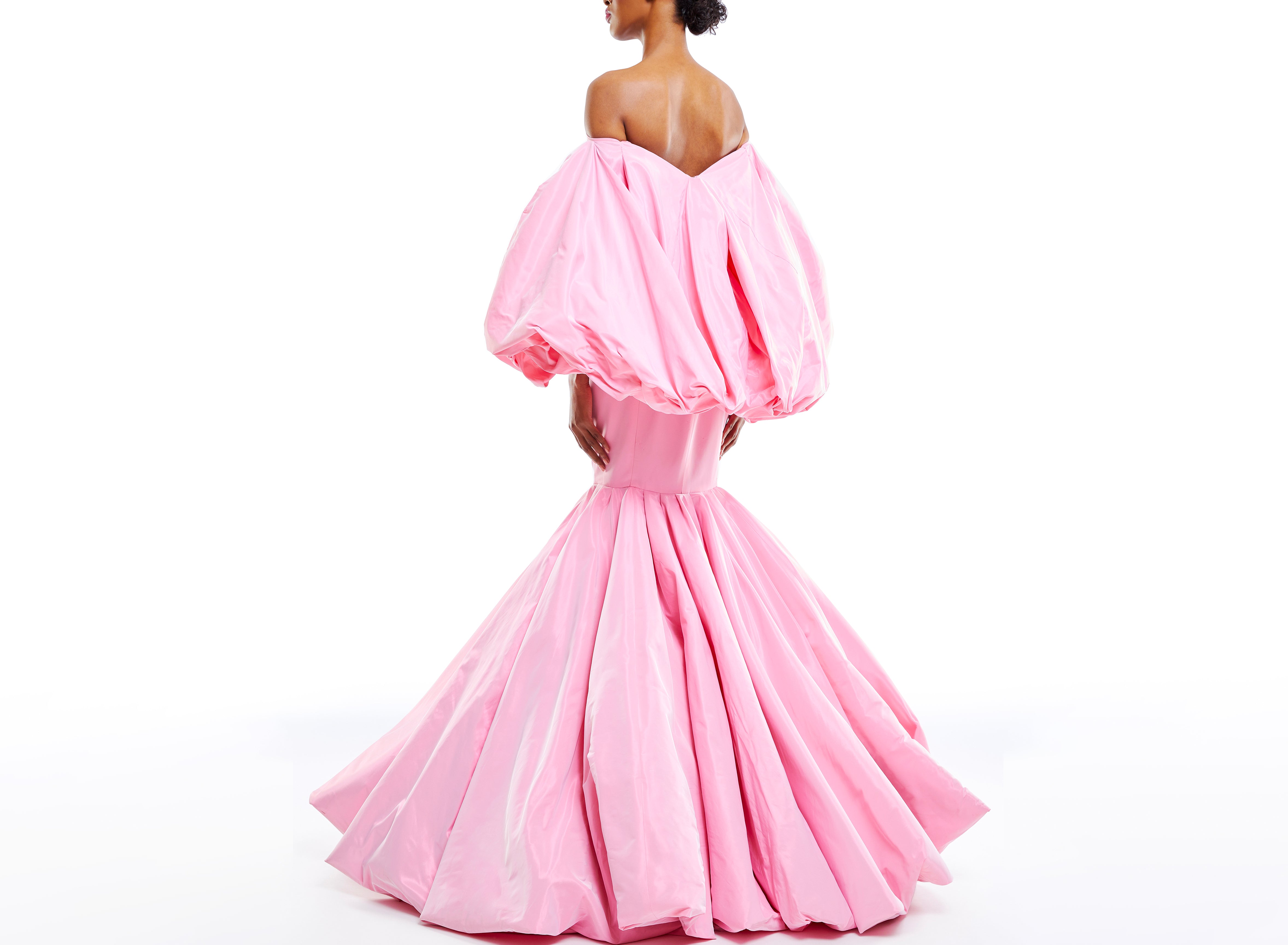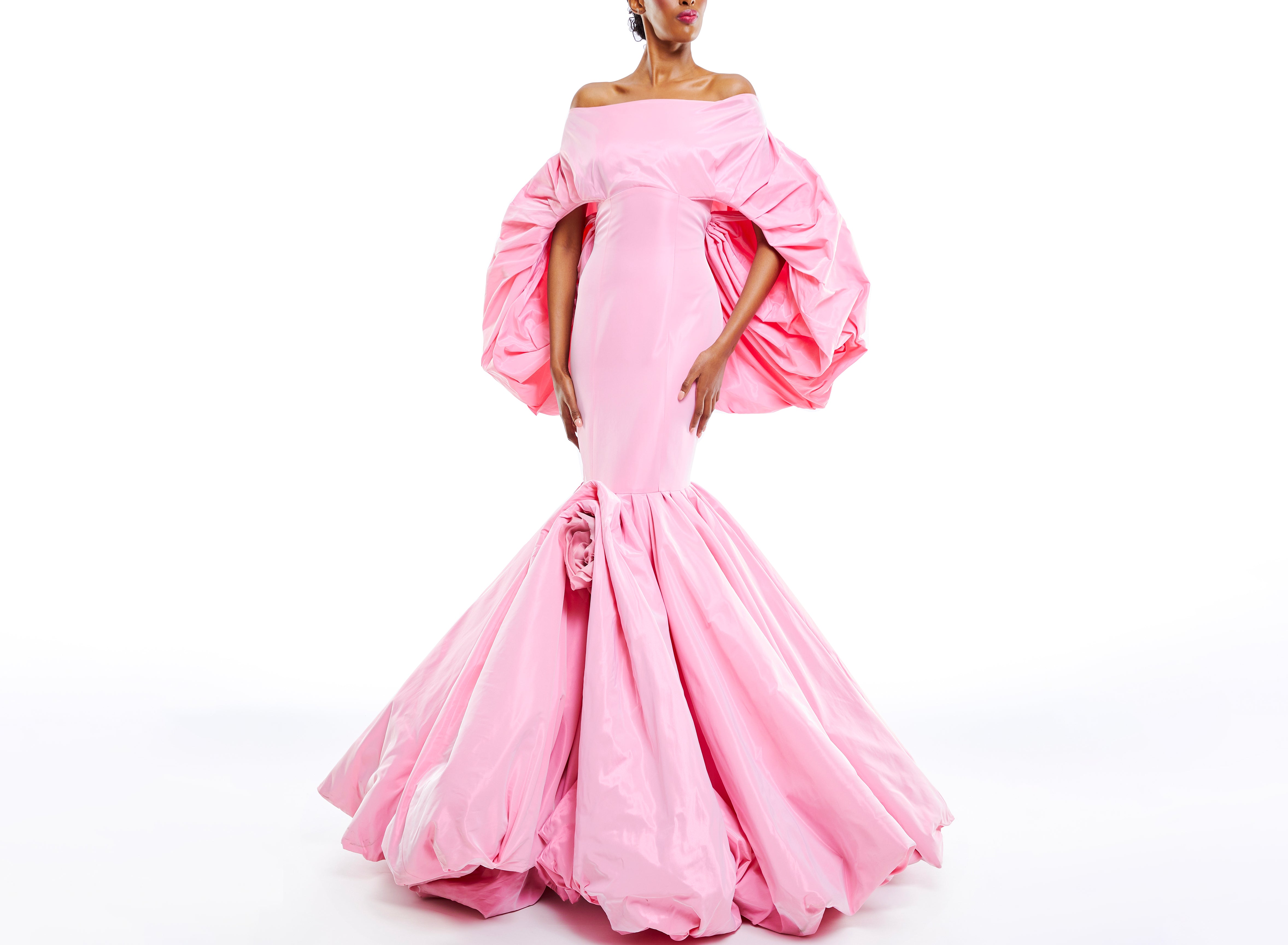 Off the shoulder exaggerated draped sleeve gown in Taffeta fabric with rosette embellishment