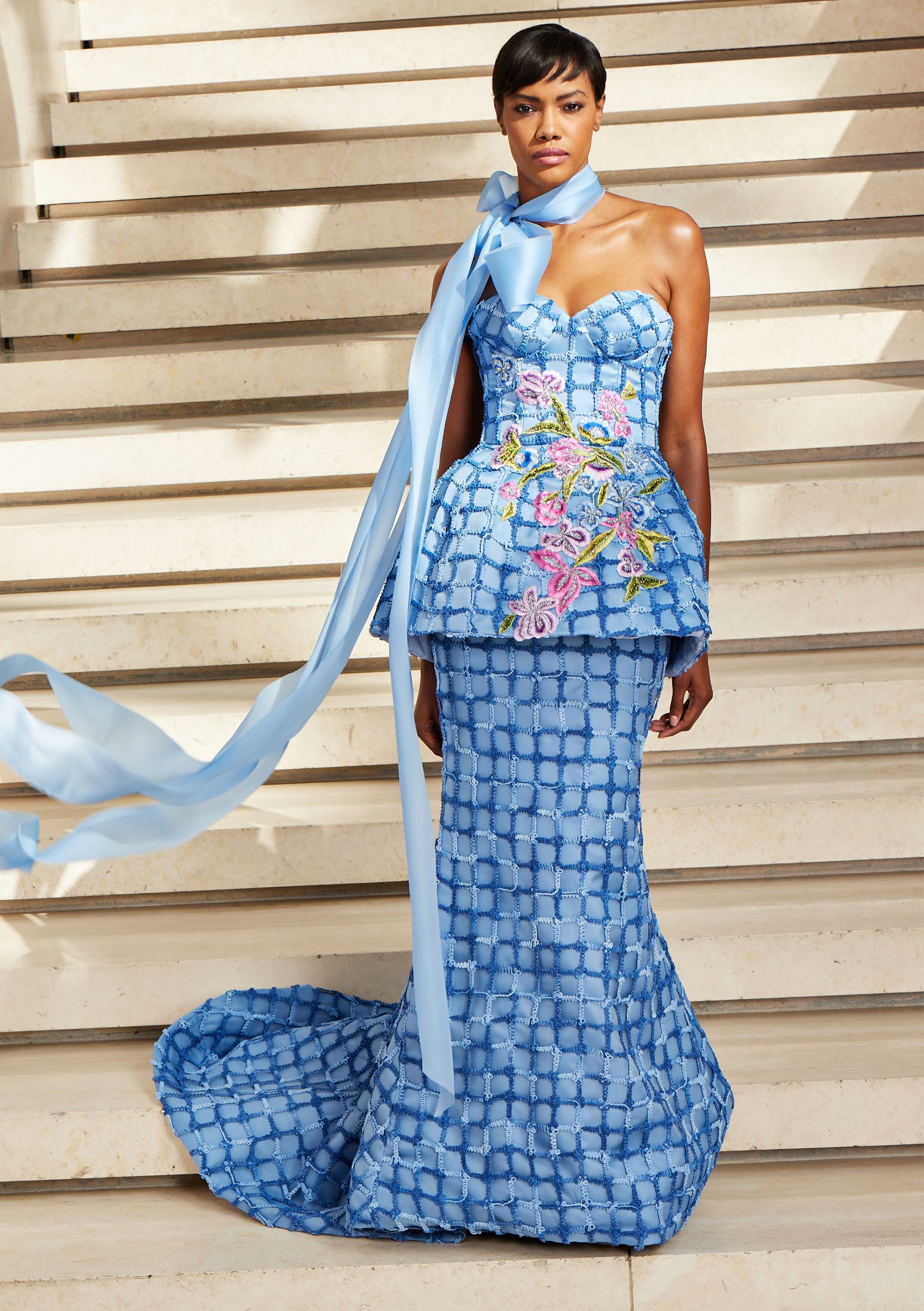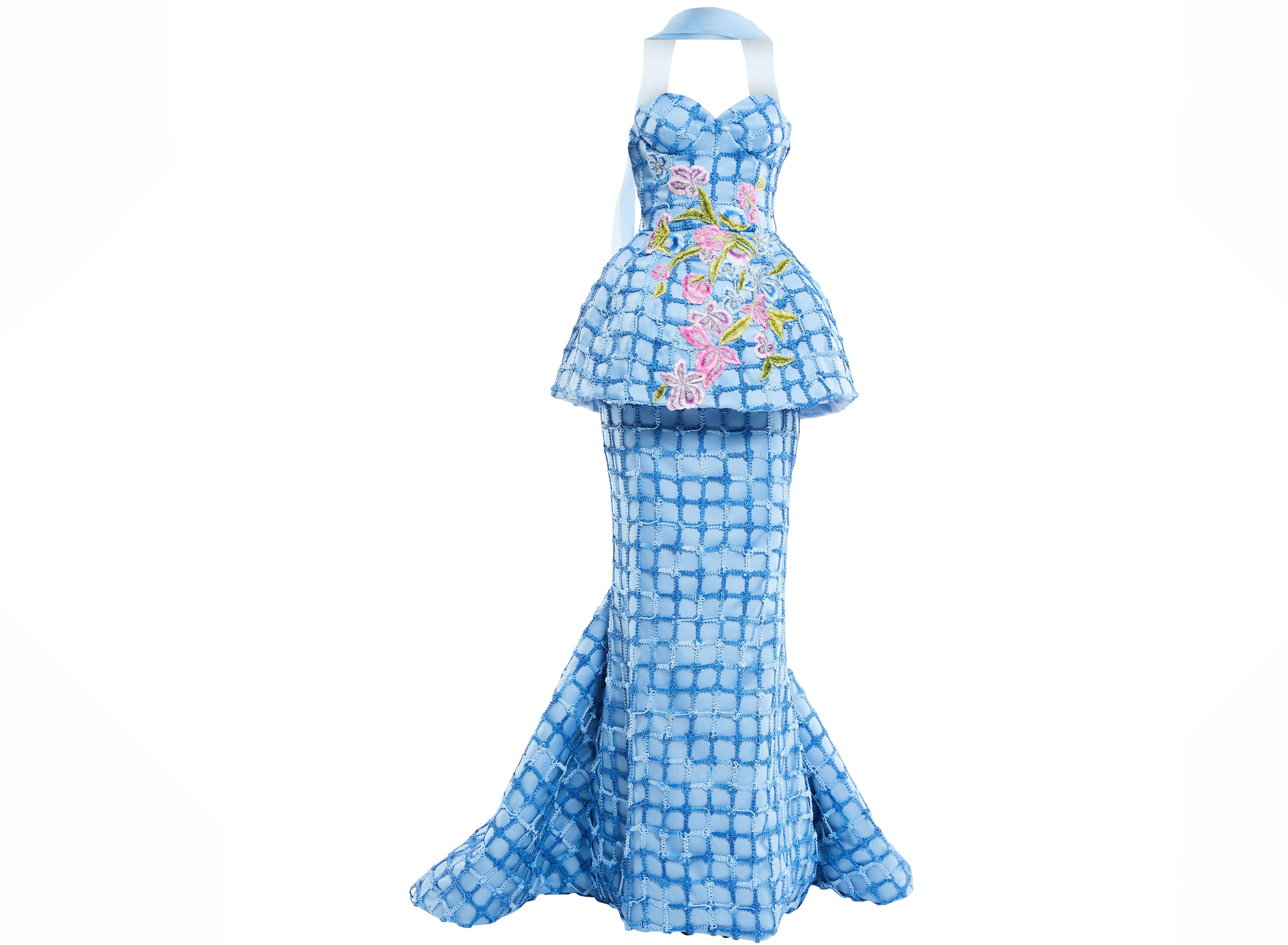 Corset windowpane macrame peplum gown with floral embroidery