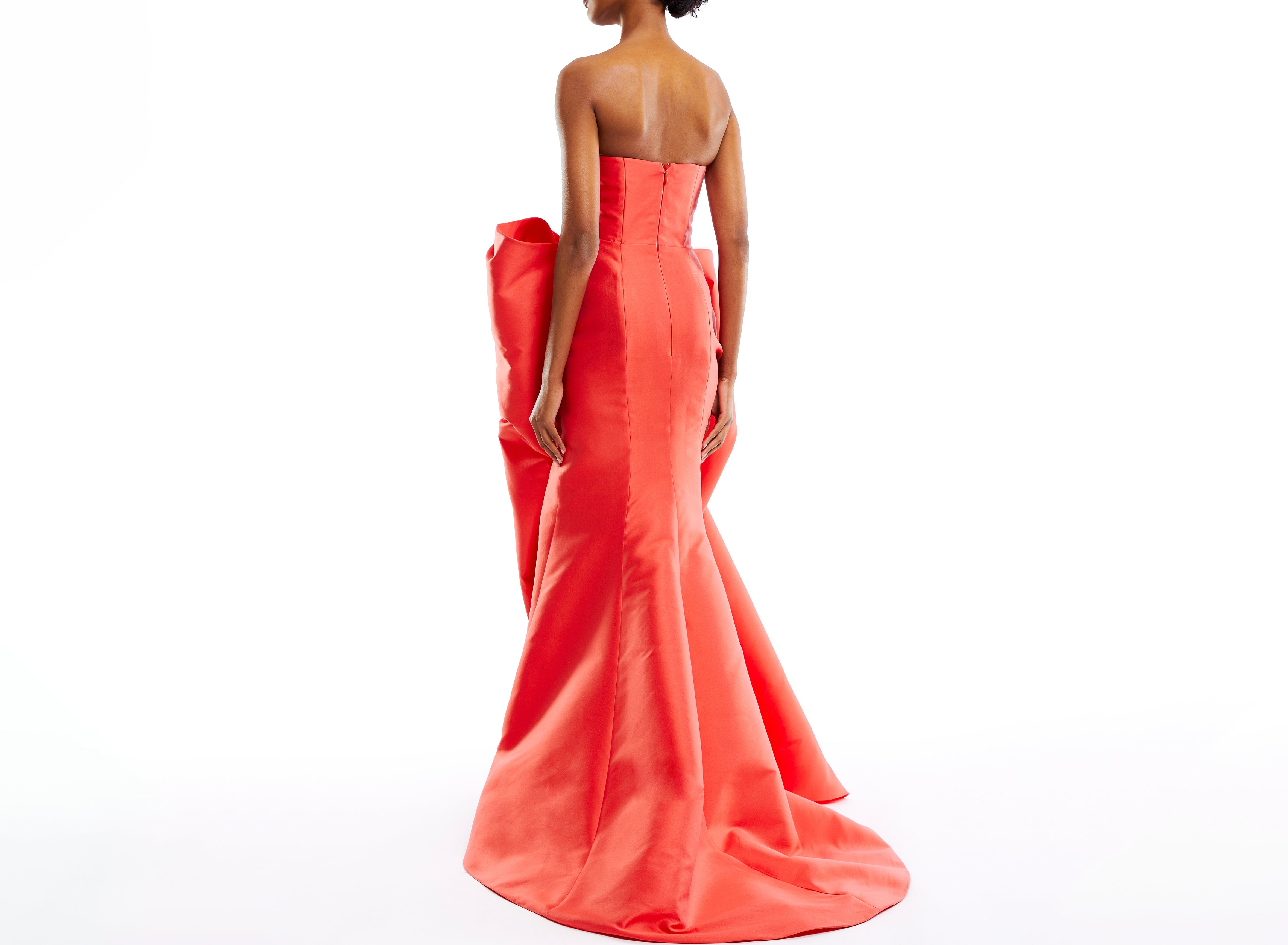 Strapless satin gown with pleated bodice and voluminous bow