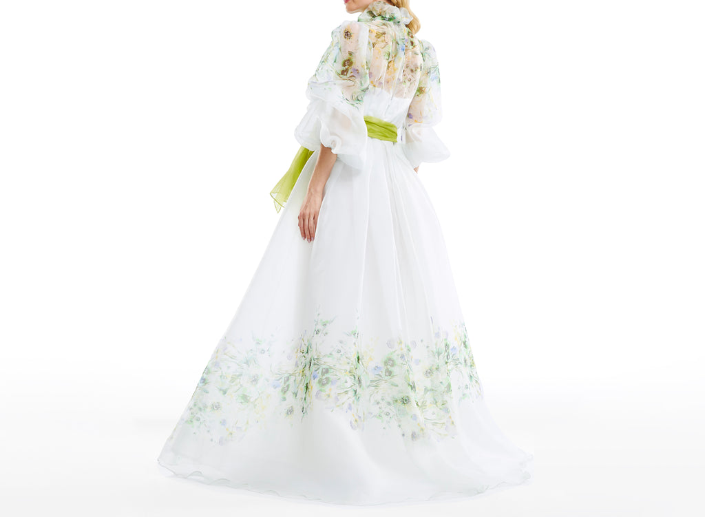 High ruffle neck Full length puff-sleeve printed organza gown