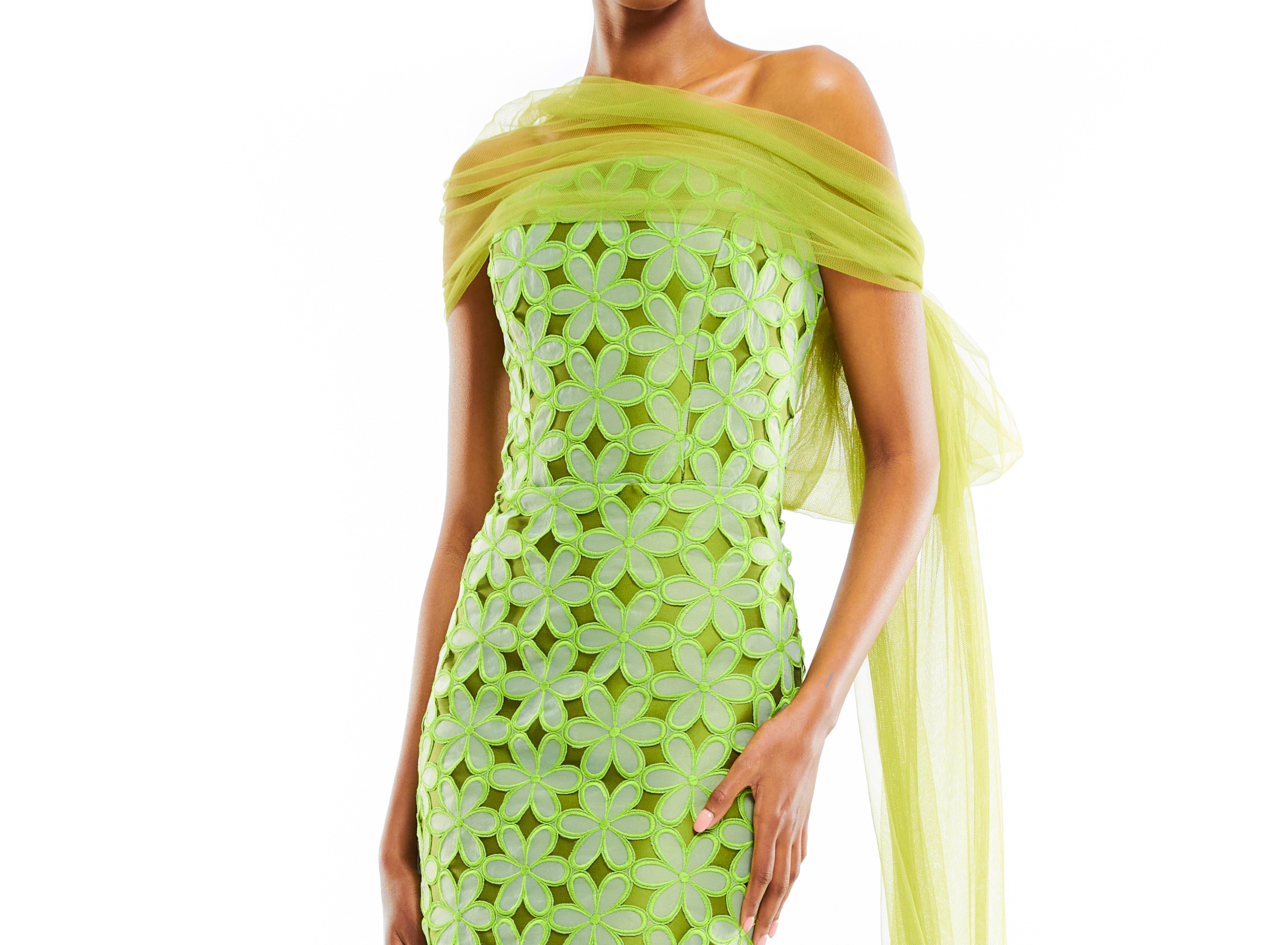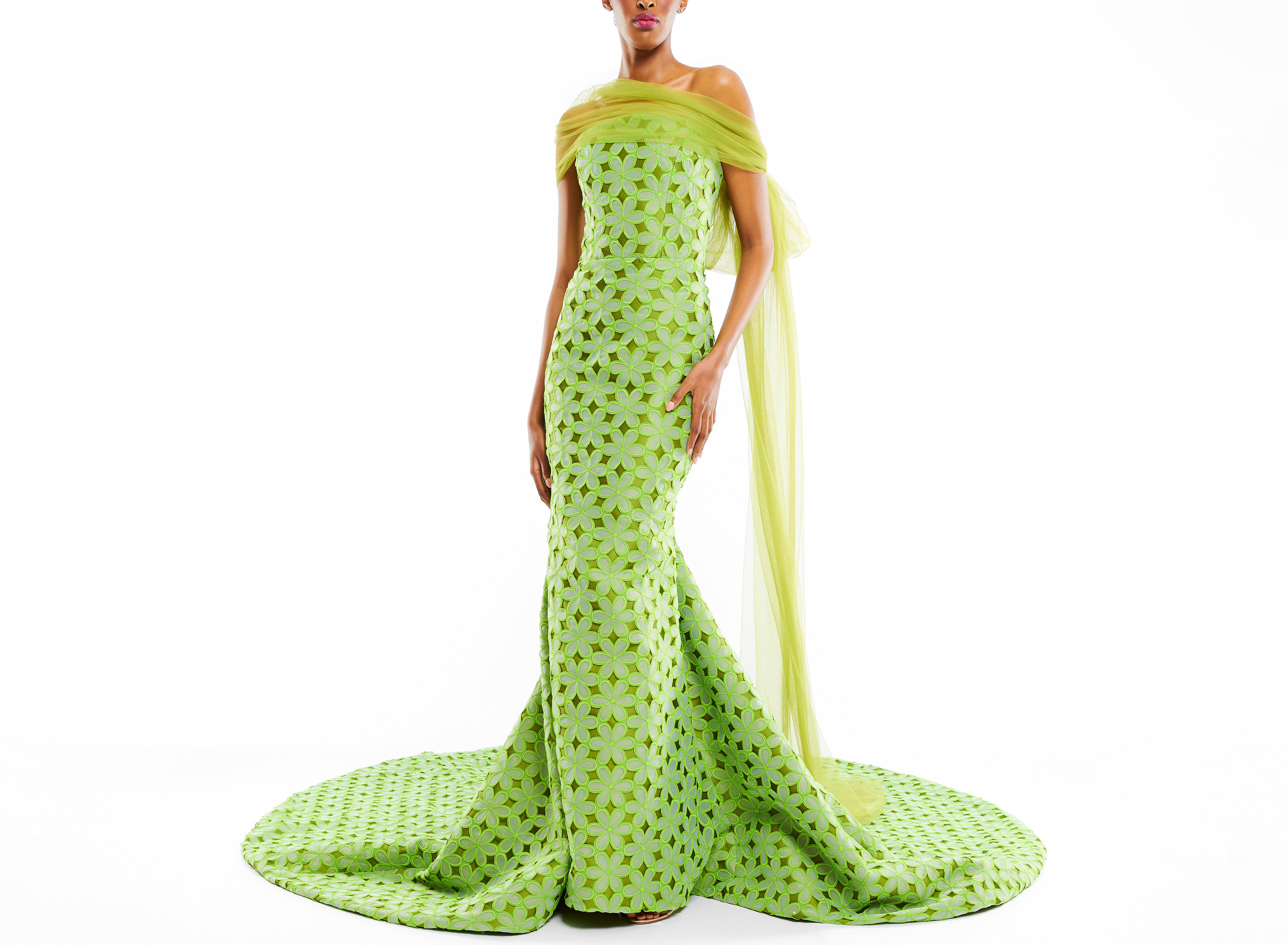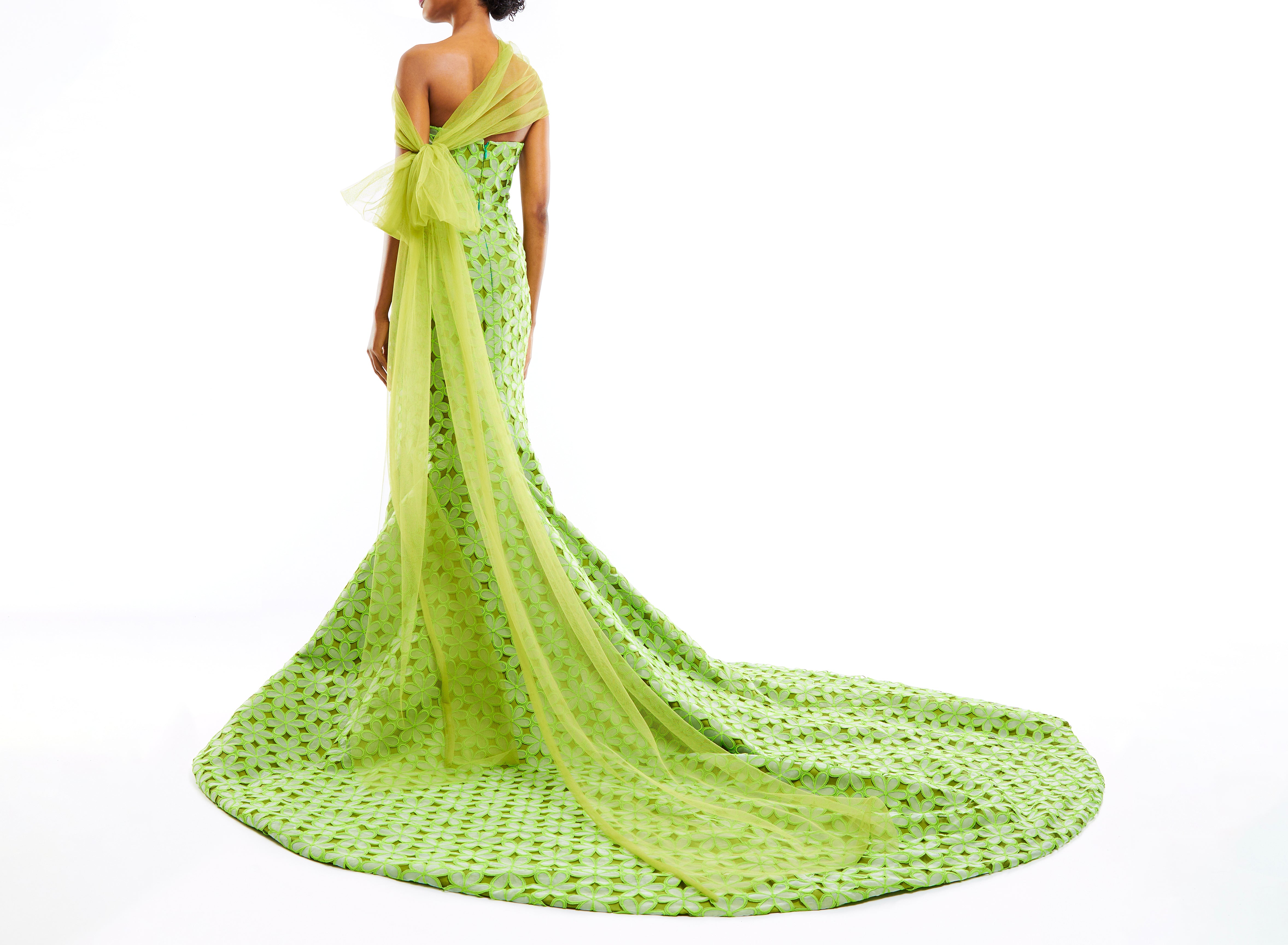 Full length strapless gown with train, embroidered floral pattern, and bow tulle shawl