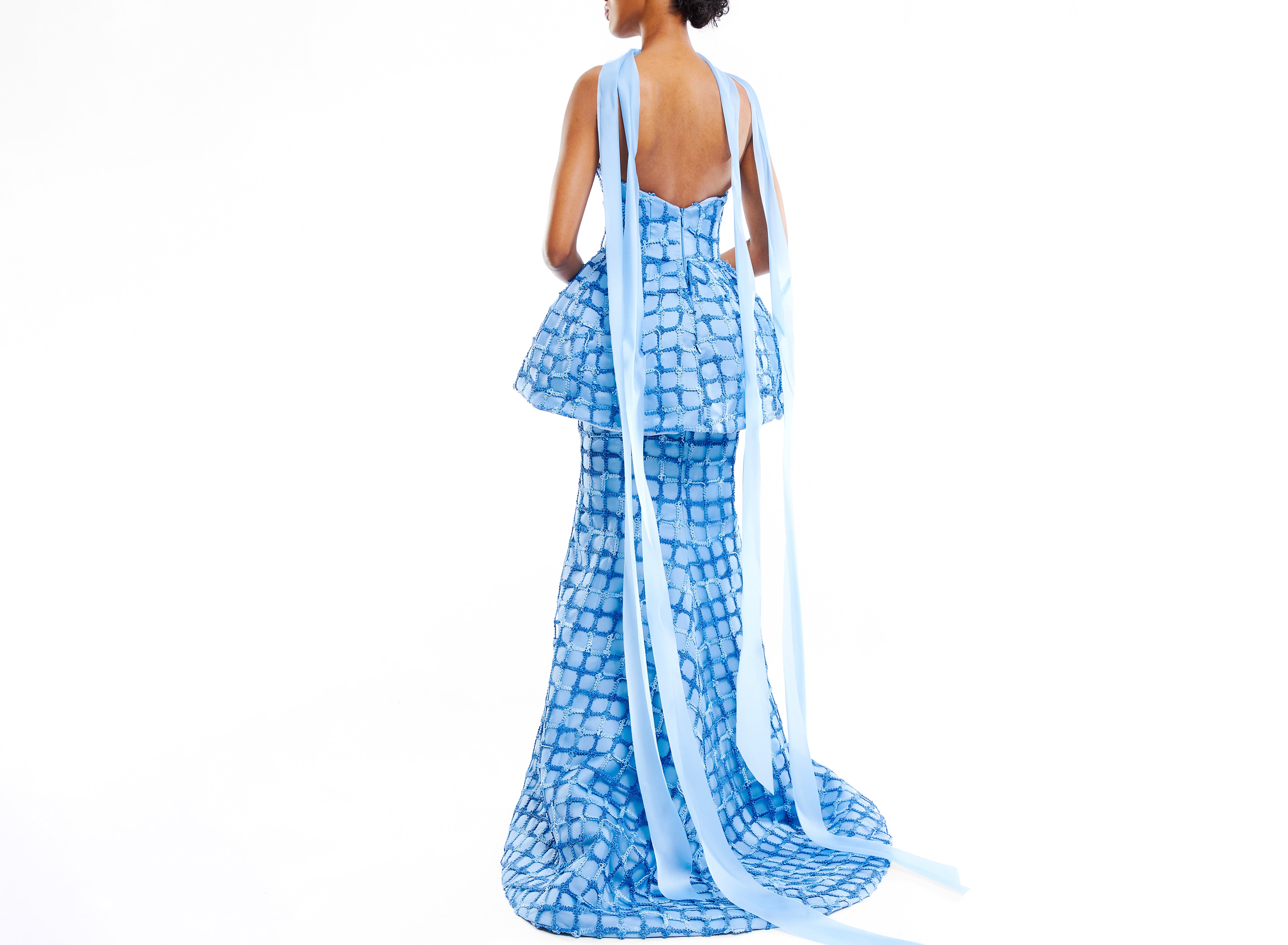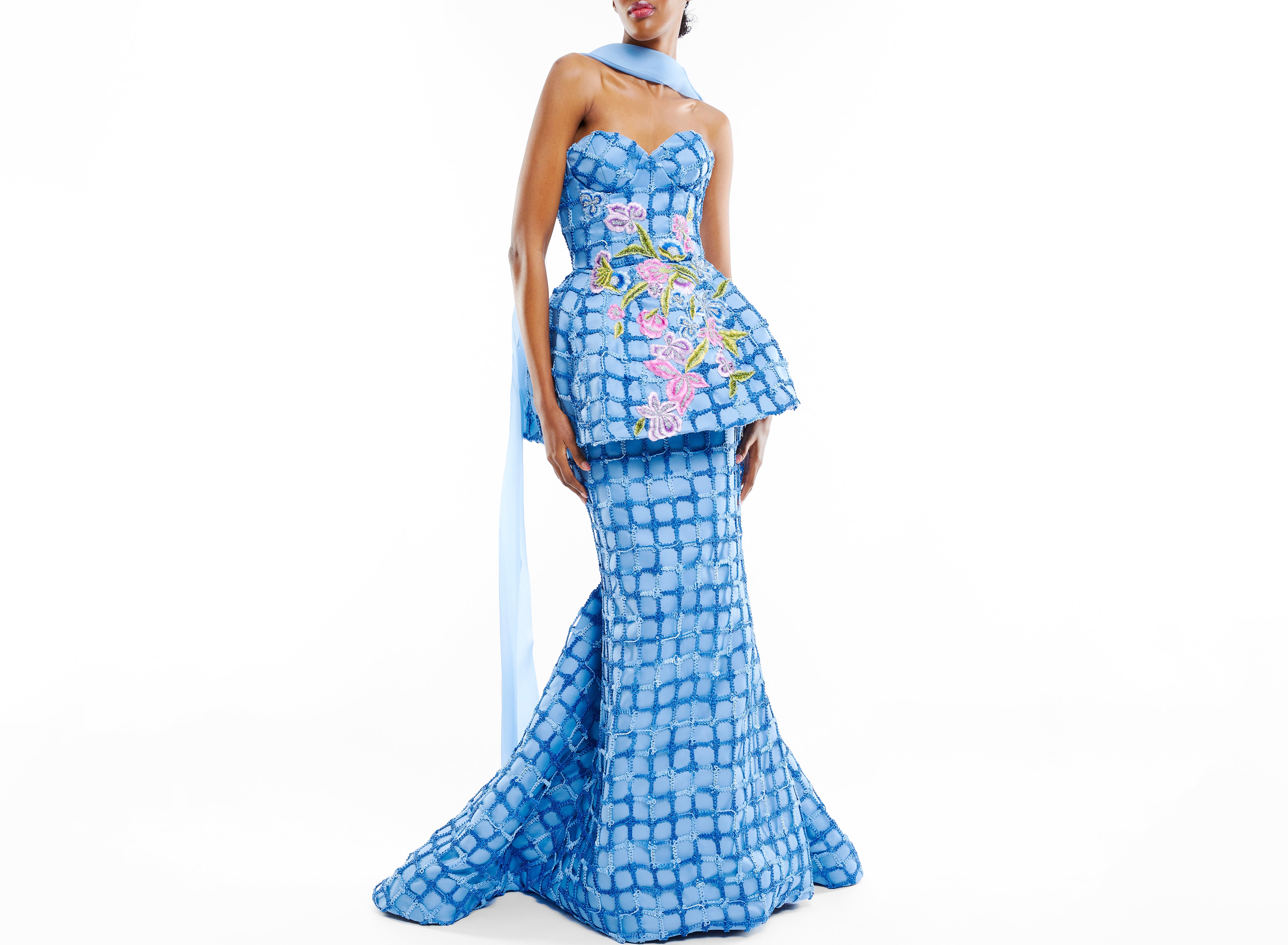 Corset windowpane macrame peplum gown with floral embroidery