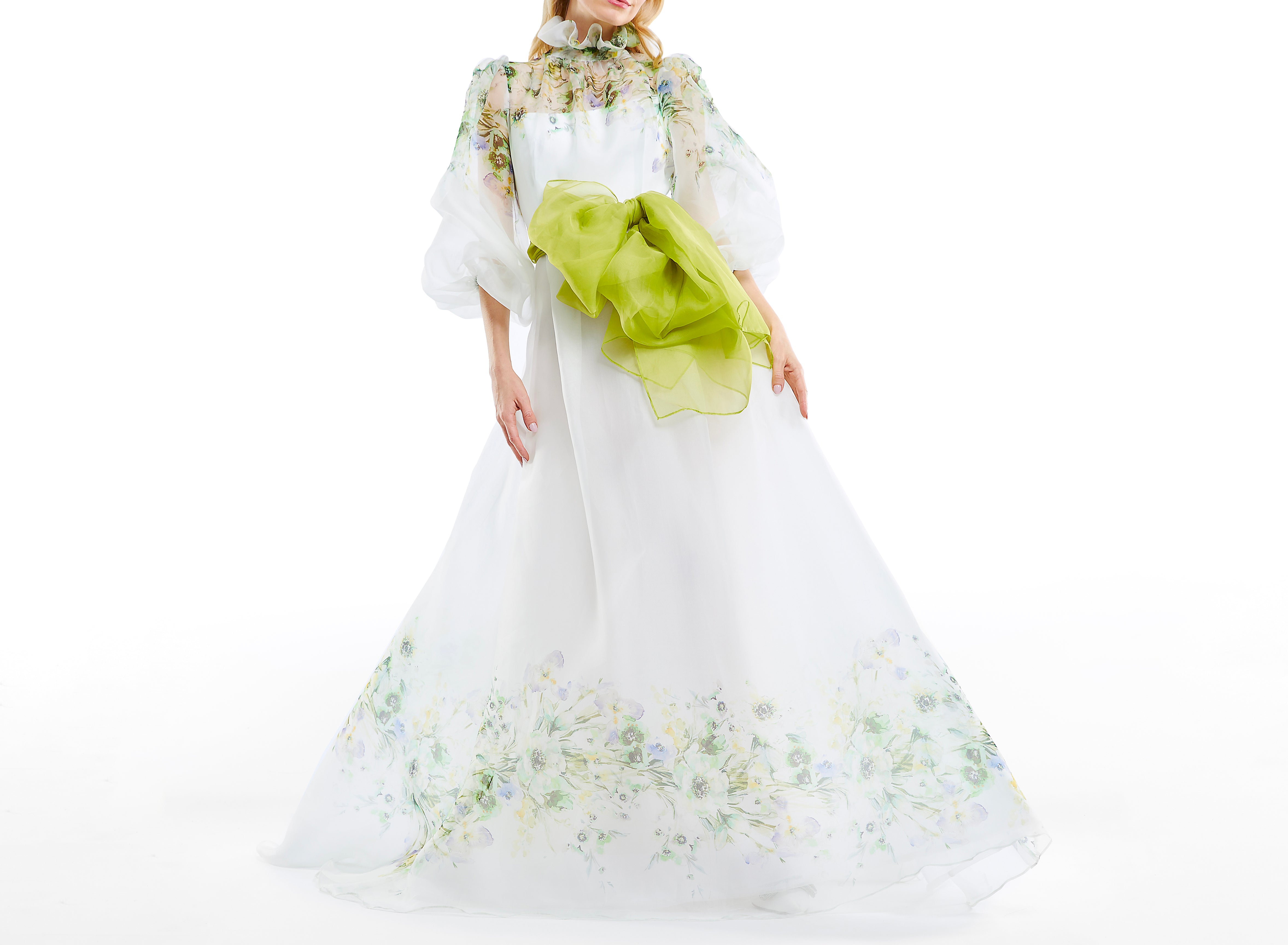 High ruffle neck Full length puff-sleeve printed organza gown
