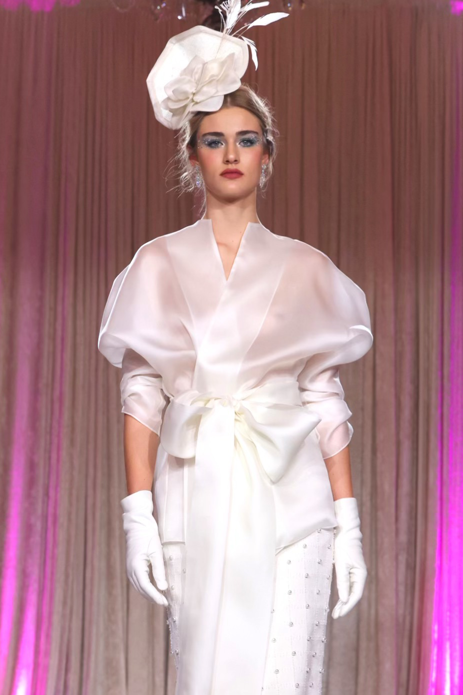 Combination of organza wrap with a bow and pearl embroidered skirt.