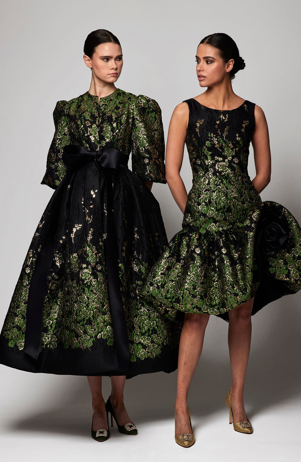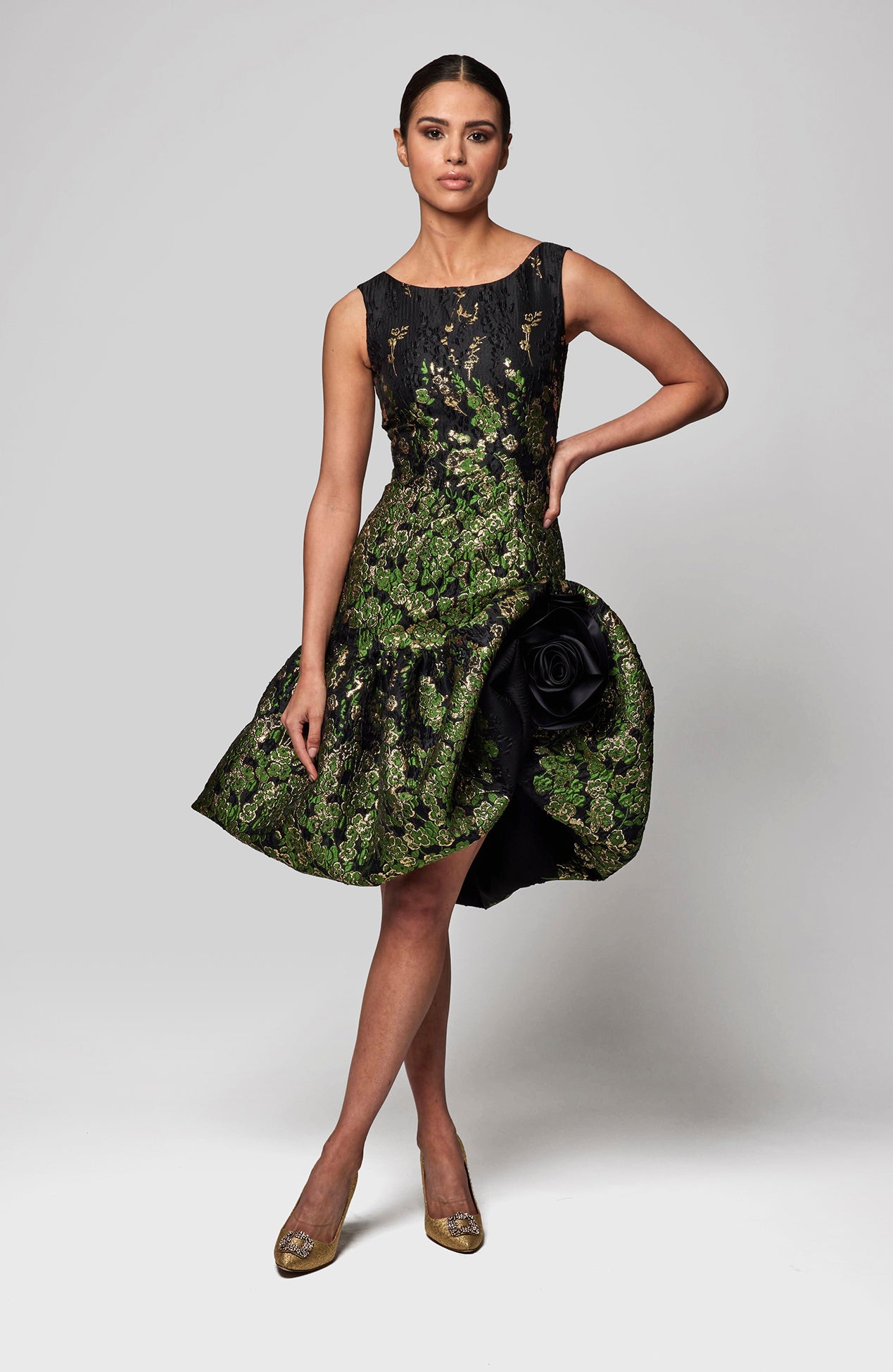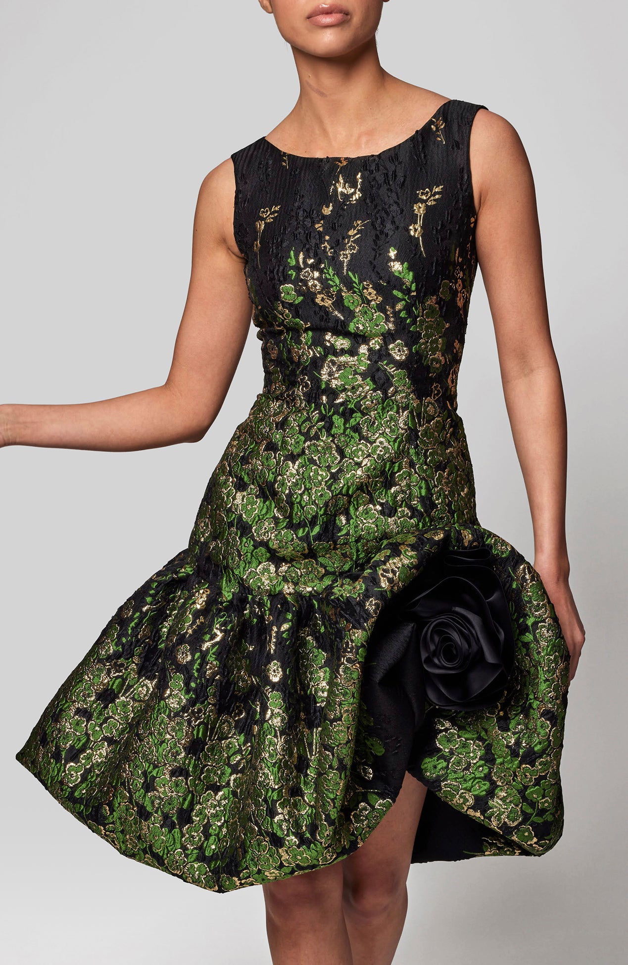 Metallic floral fil coupe dress with rosette detail
