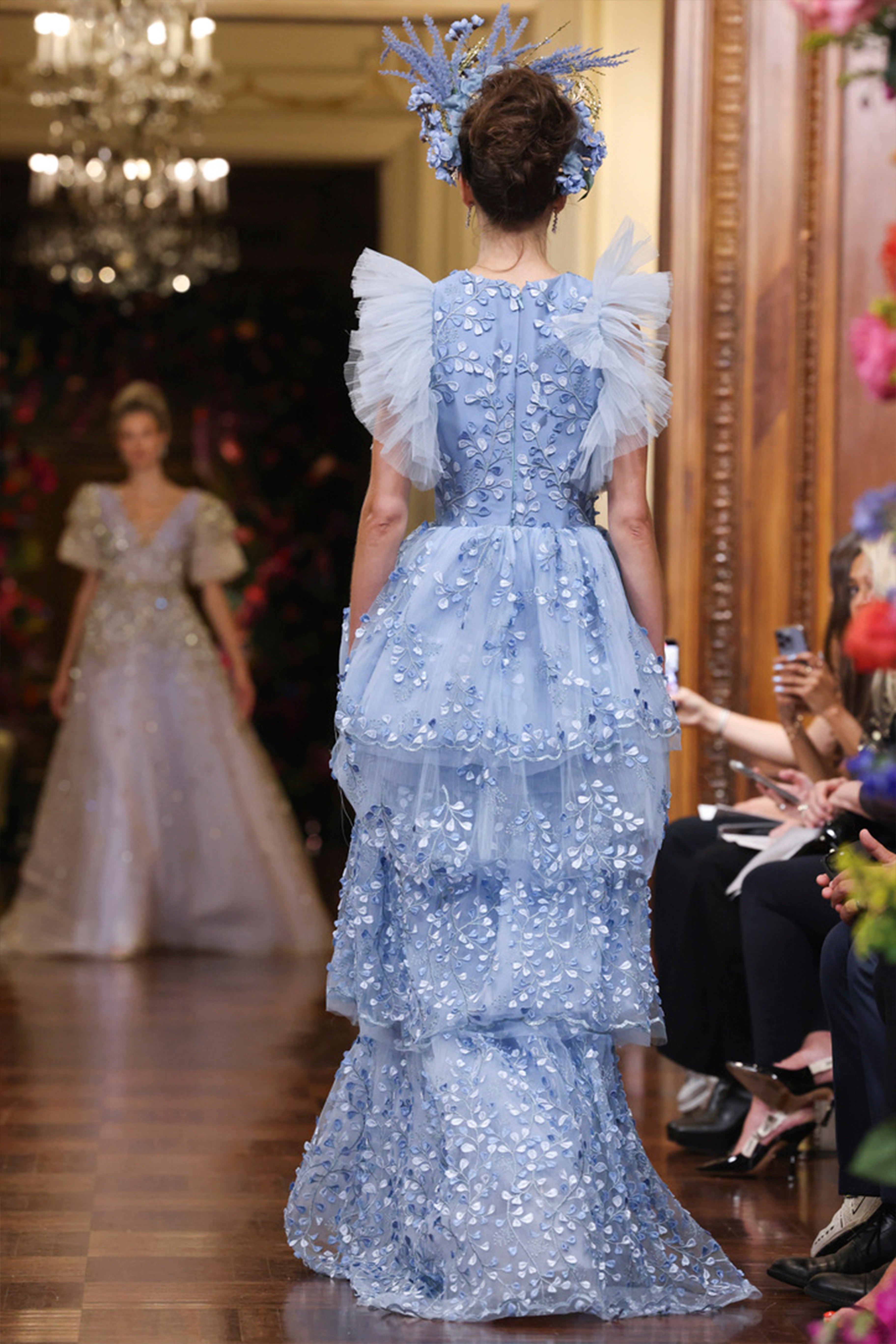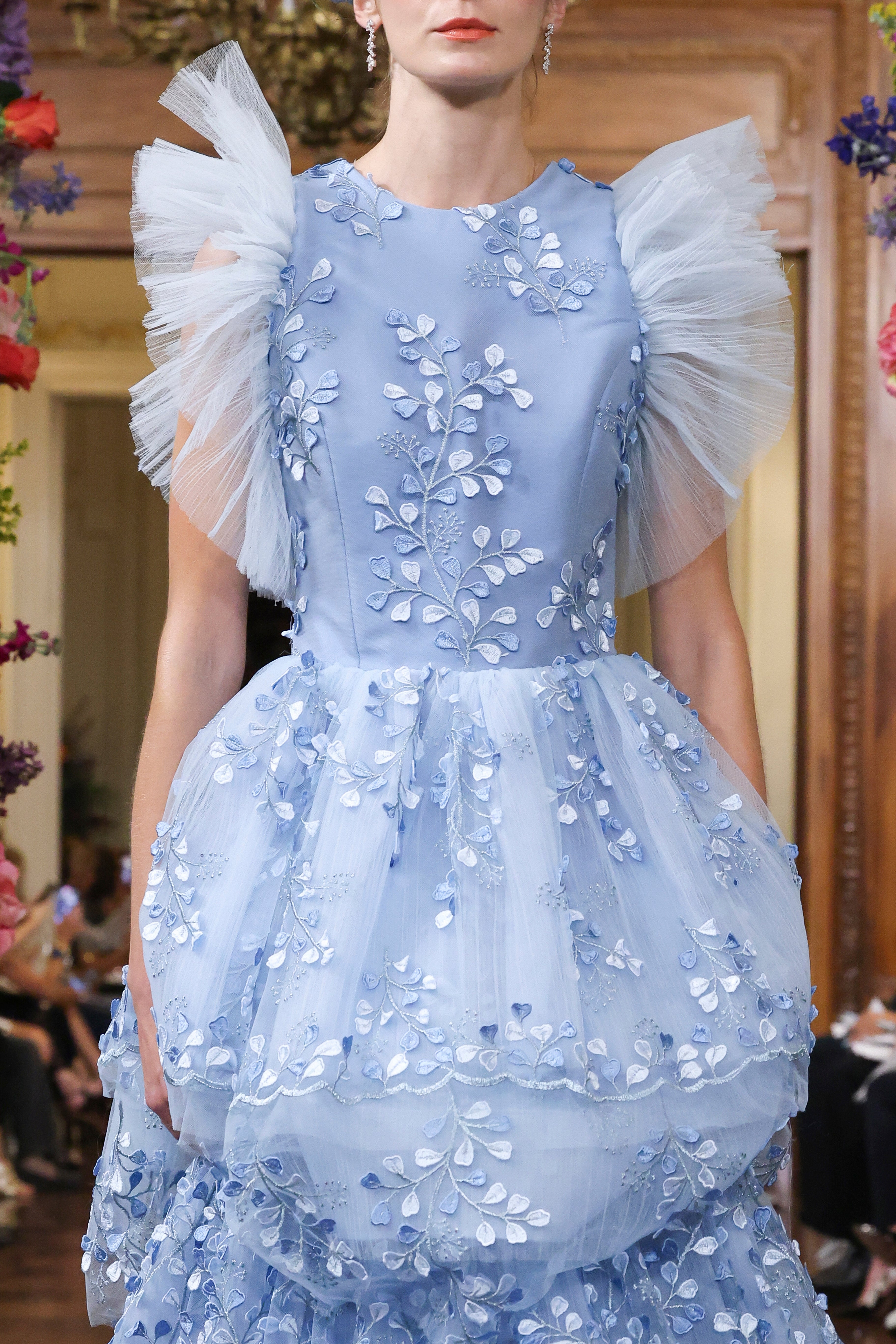 Pleated tulle sleeve floral branch embroidered tiered gown
