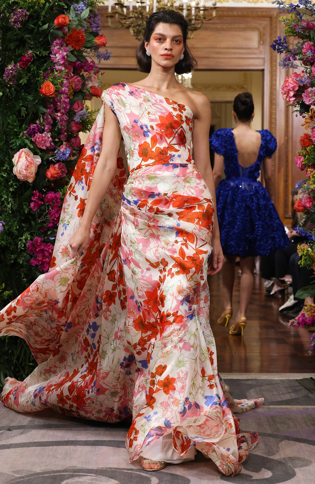 One shoulder chinoiserie print organza draped gown with exaggerated sleeve train