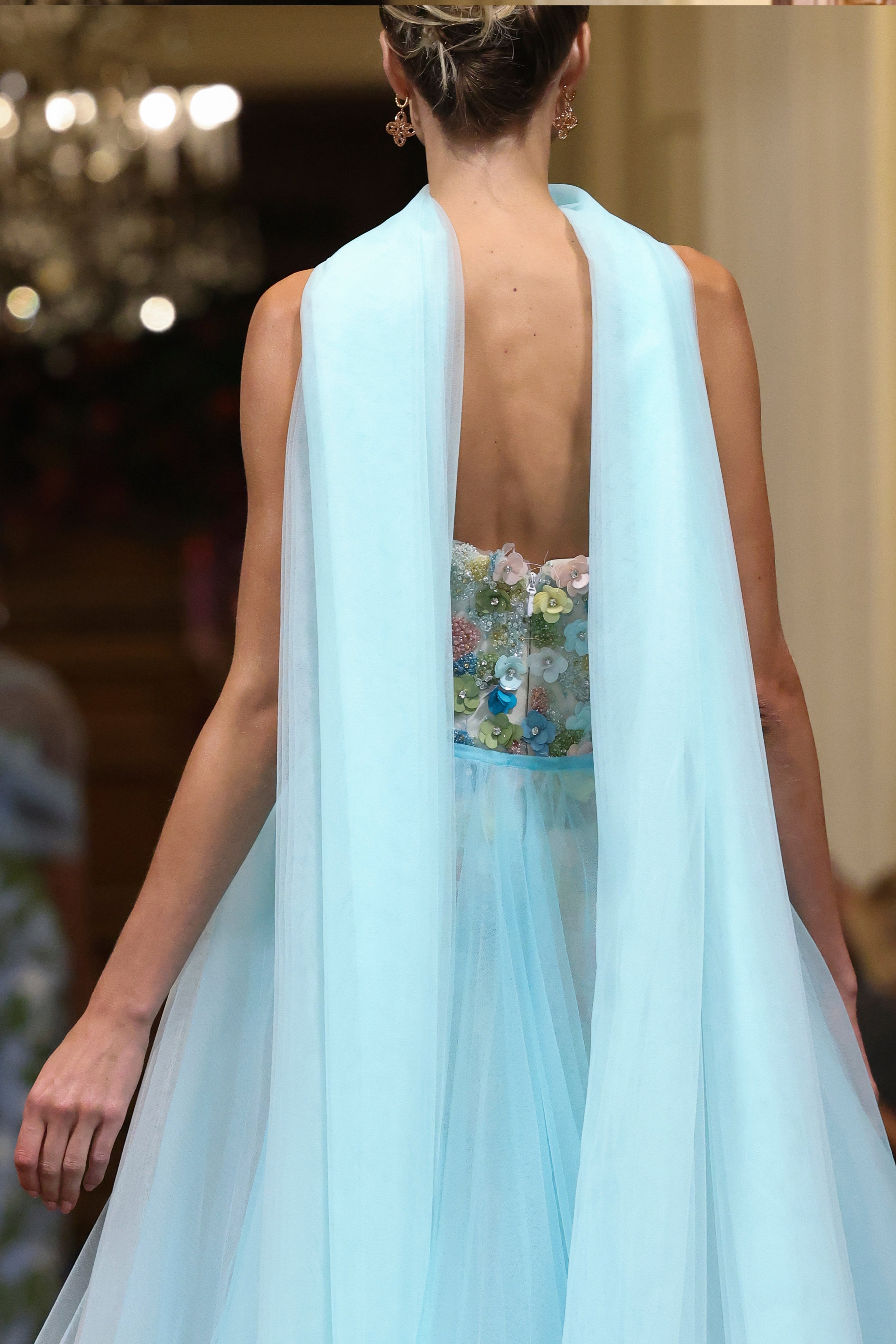 Strapless beaded mini dress with tulle overskirt and neck piece