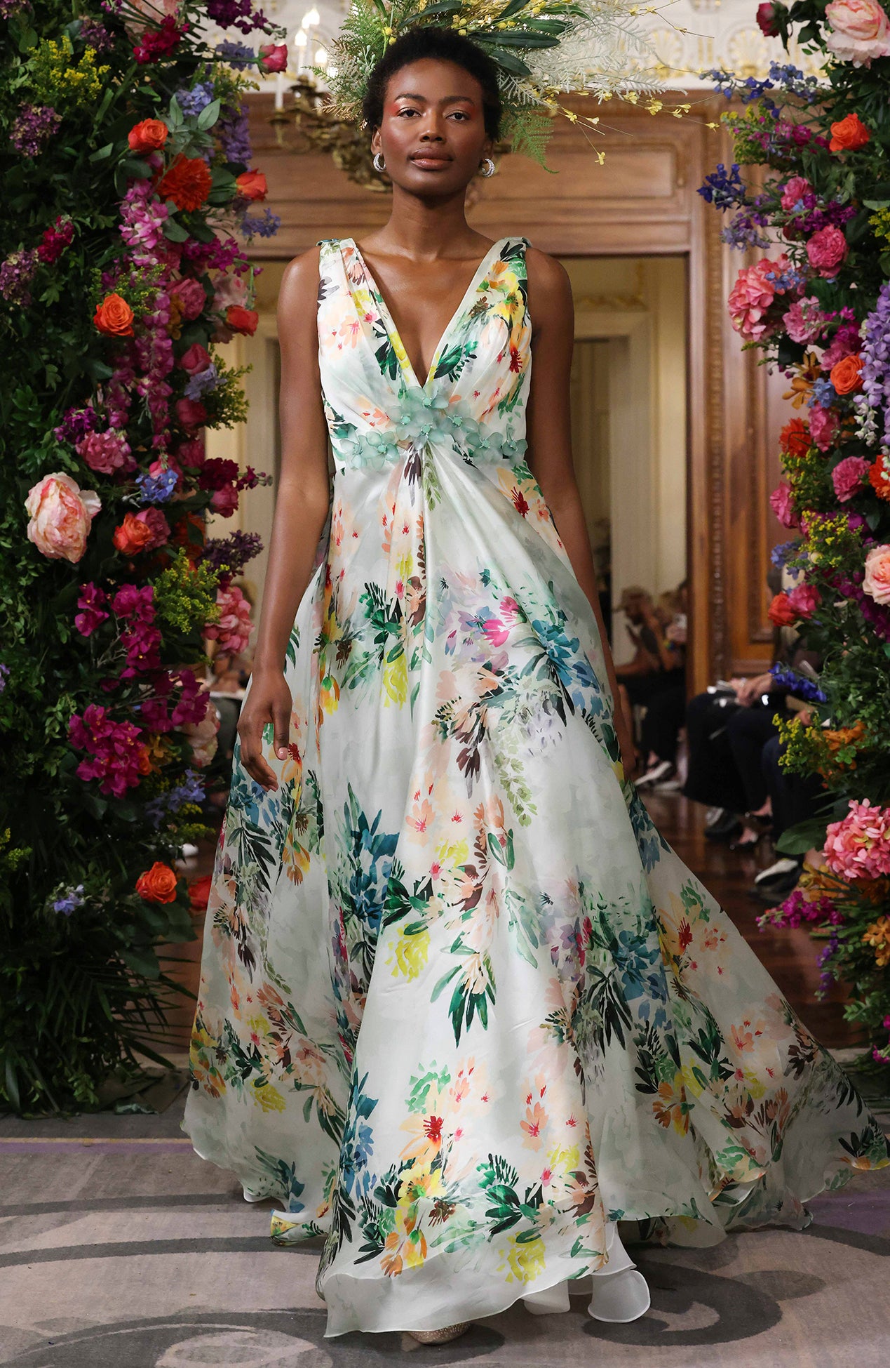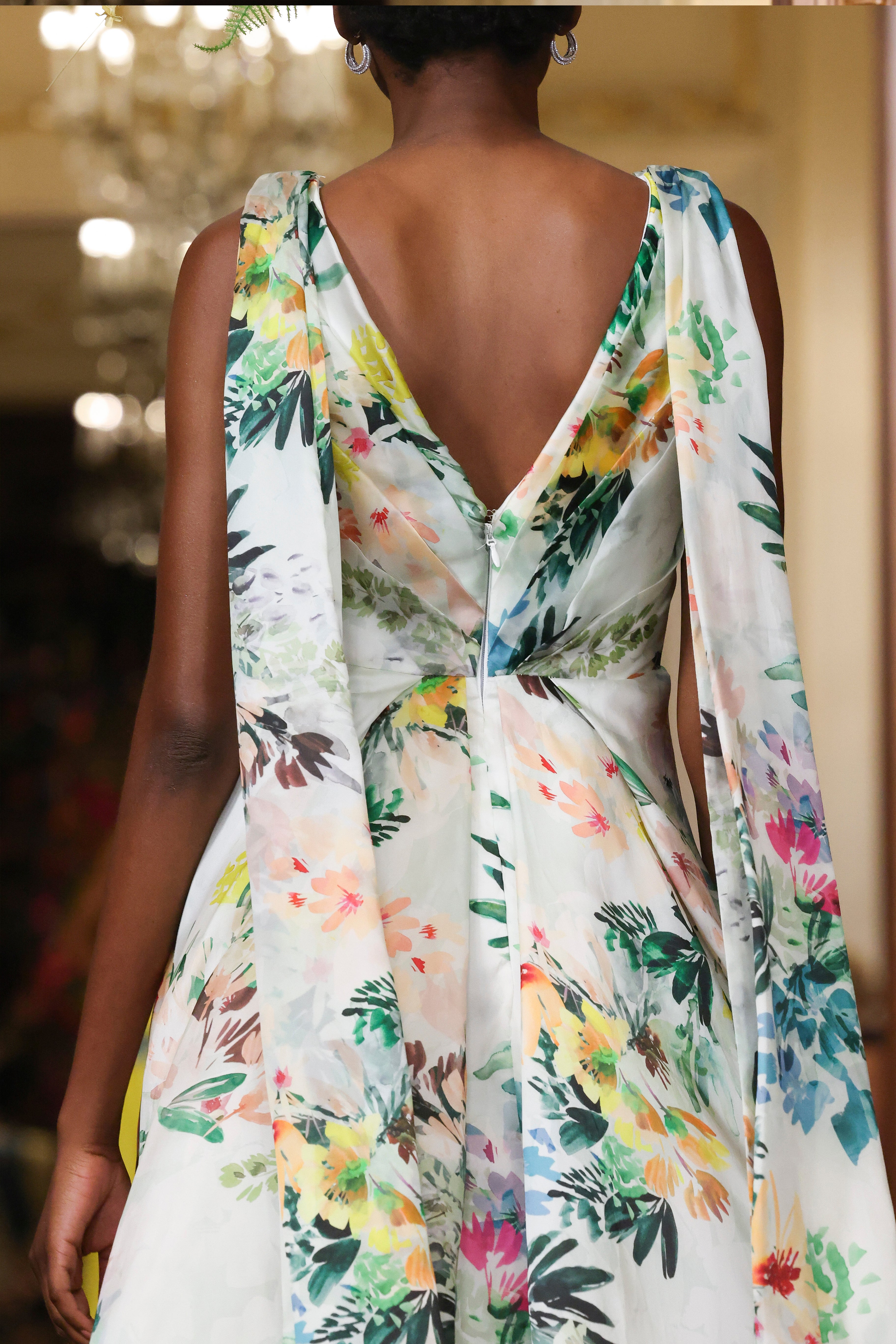 V neck draped silk satin organza floral print with 3d glass floral applique
