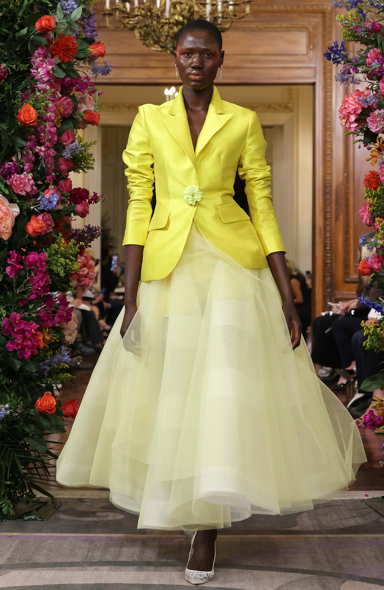 Satin Blazer with floral button paired with satin shorts and tulle a line skirt