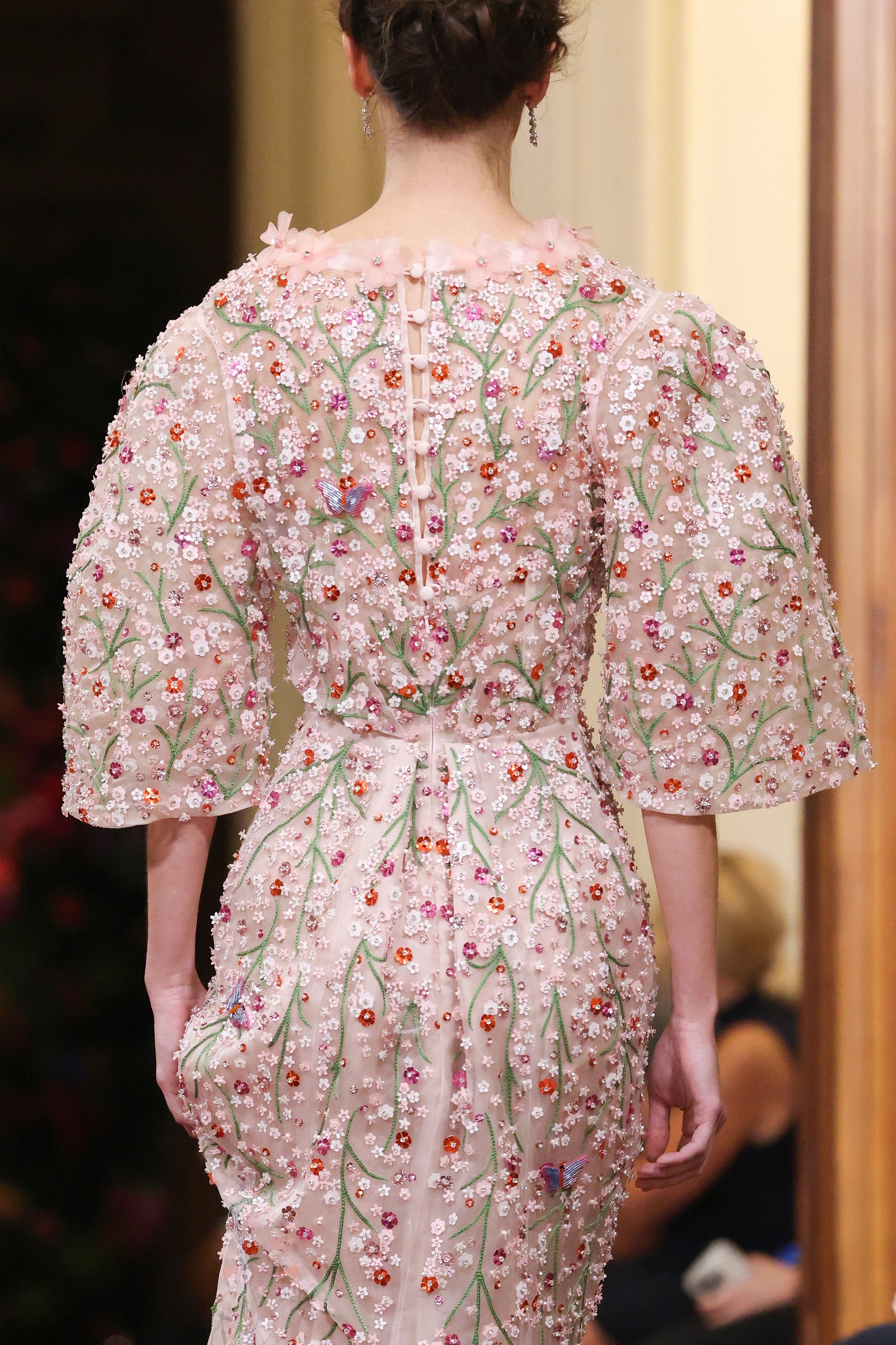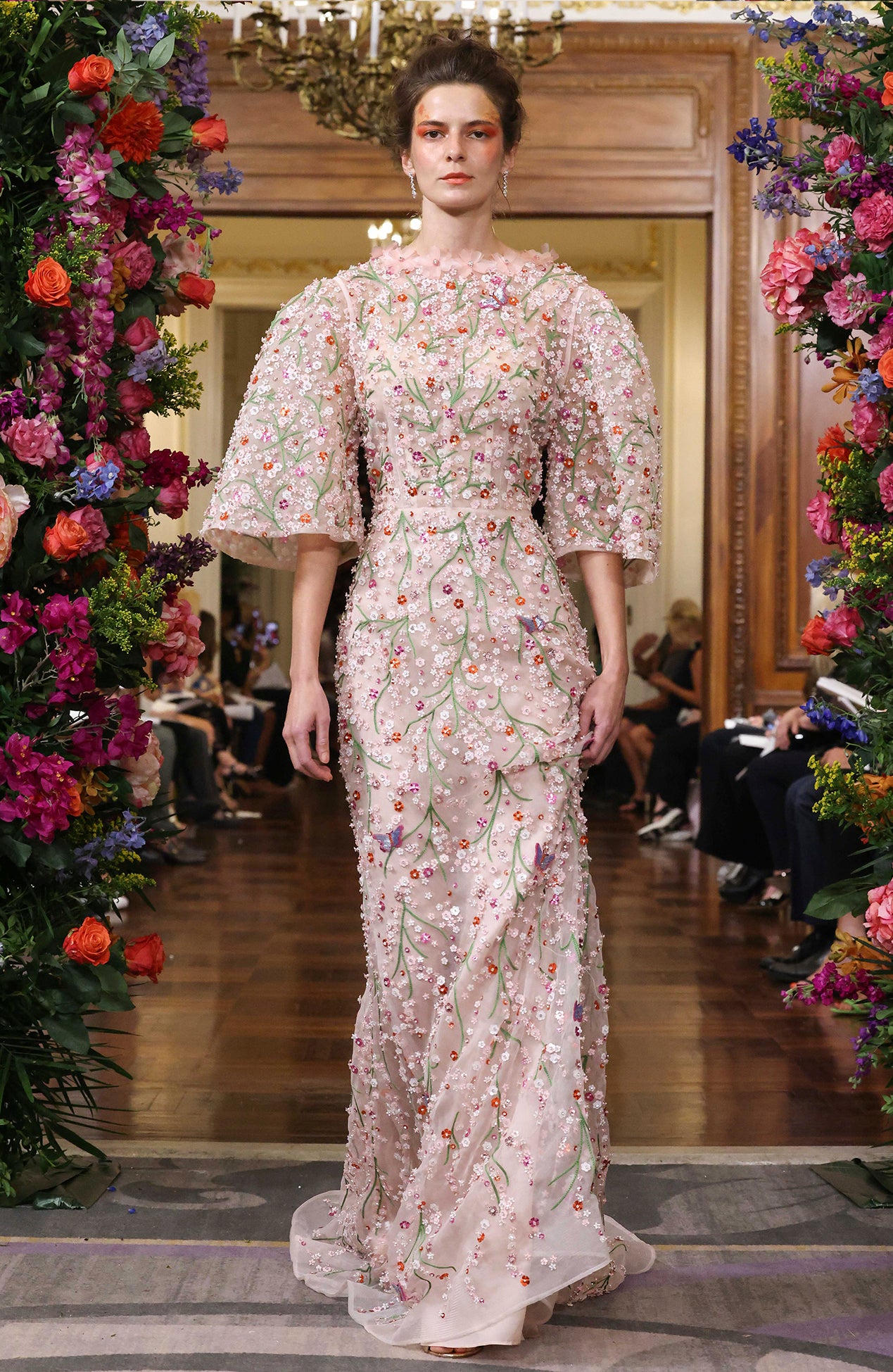 Three quarter bell sleeve butterfly branch beaded gown with 3d floral embellishment along the neckline