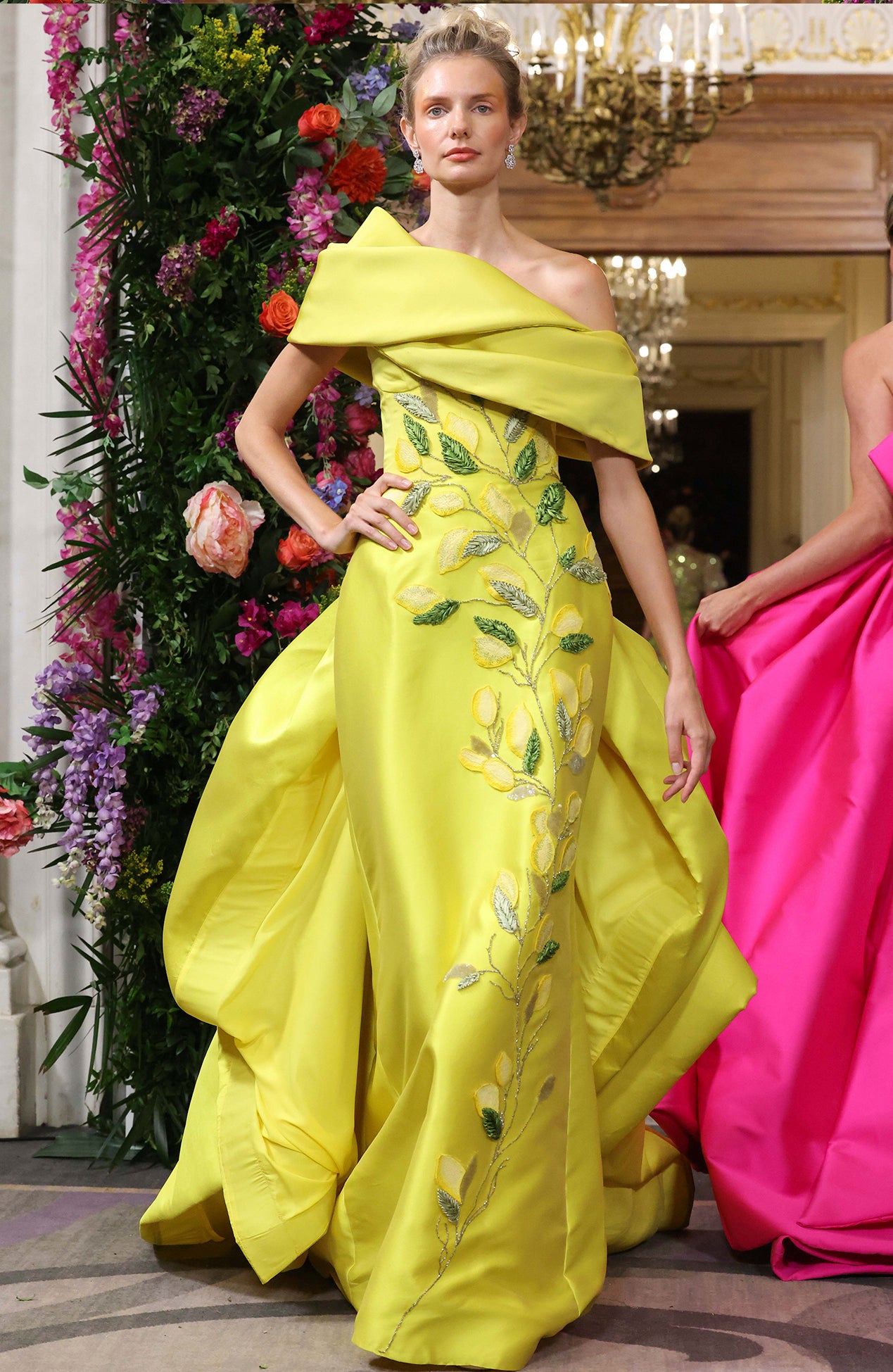 Corset Mikado gown with lemon embroidery and draped train paired with silk faille shawl