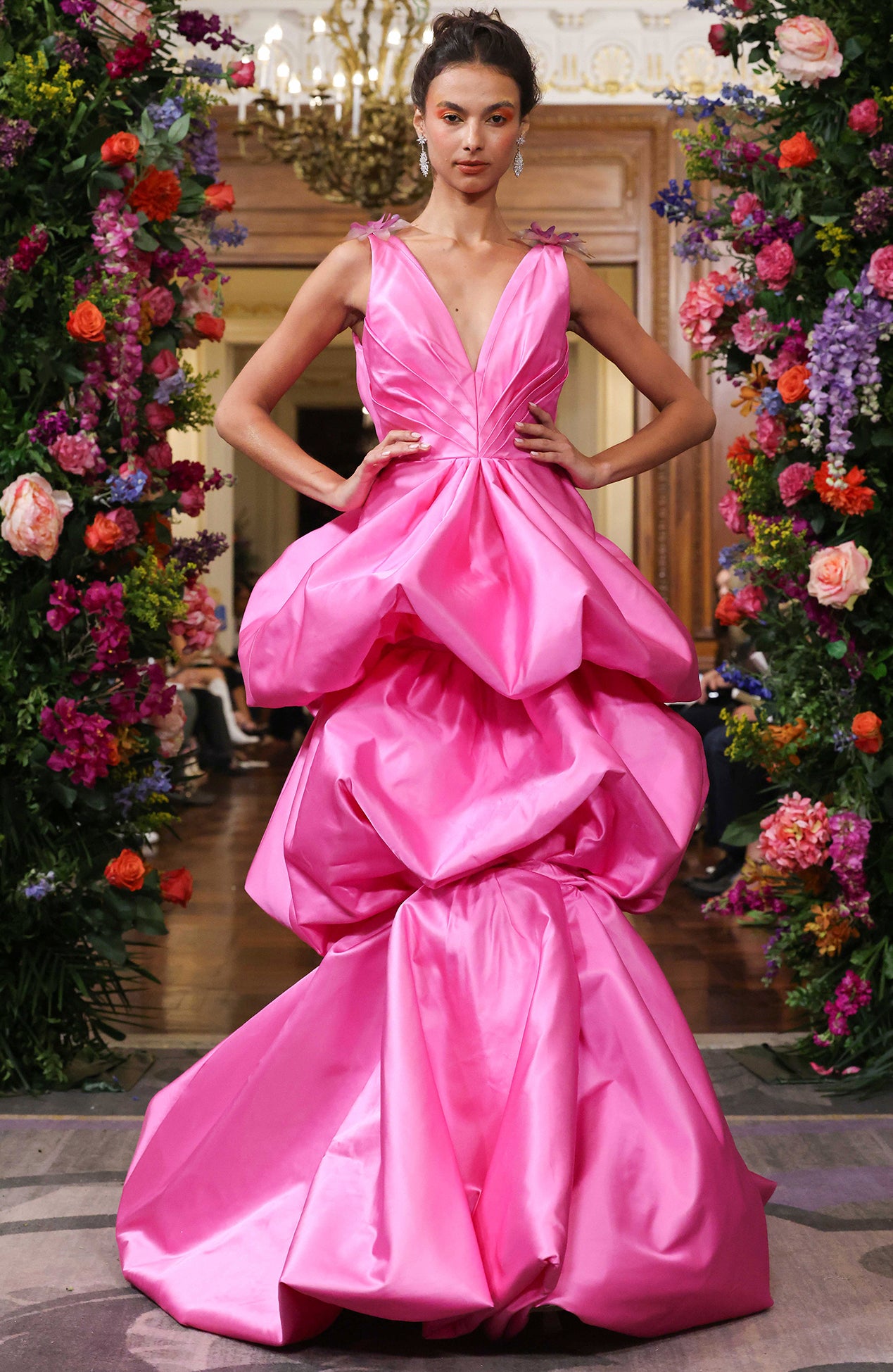 V neck draped duchess satin gown with peplum gathered skirt and glass floral applique on the shoudlers