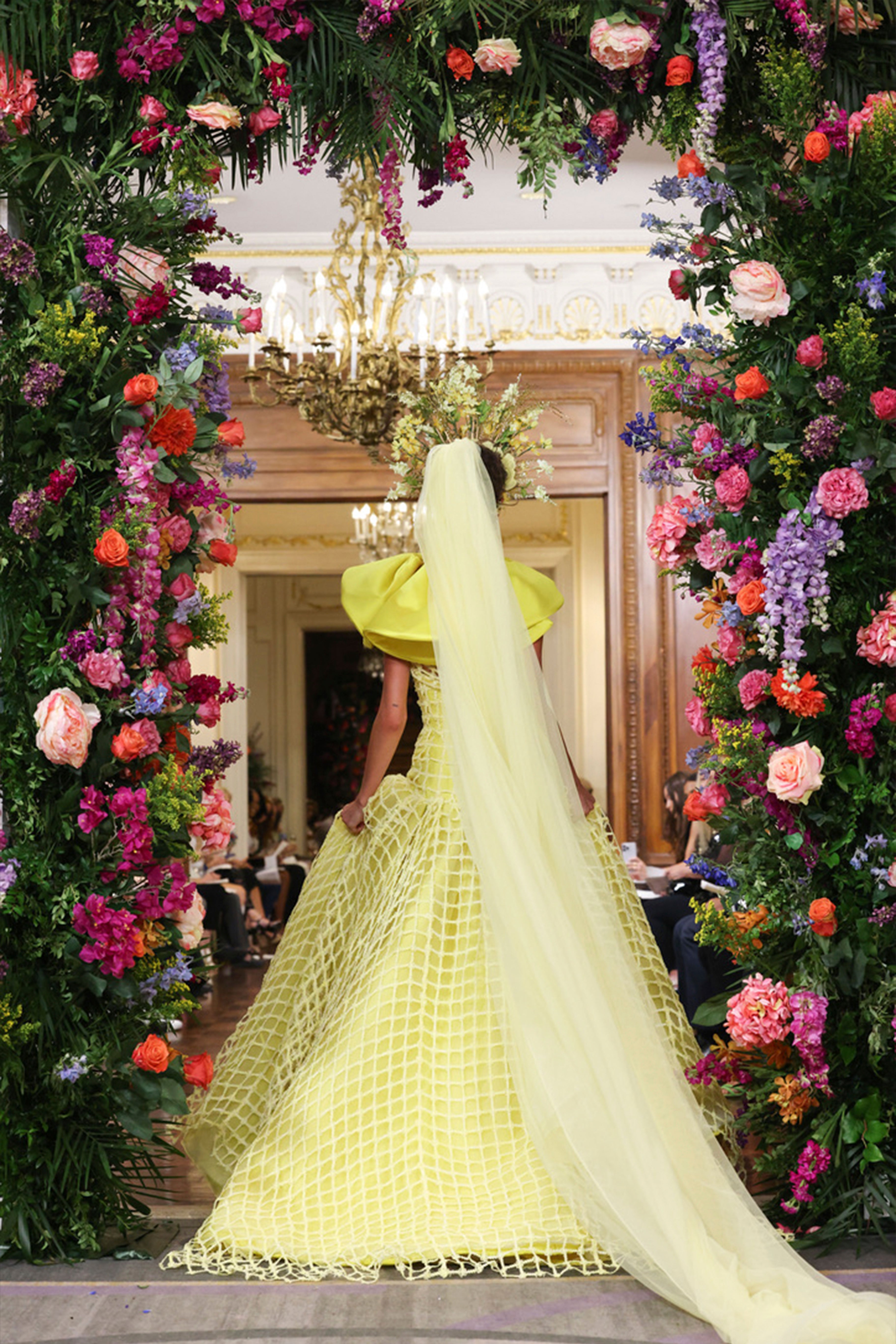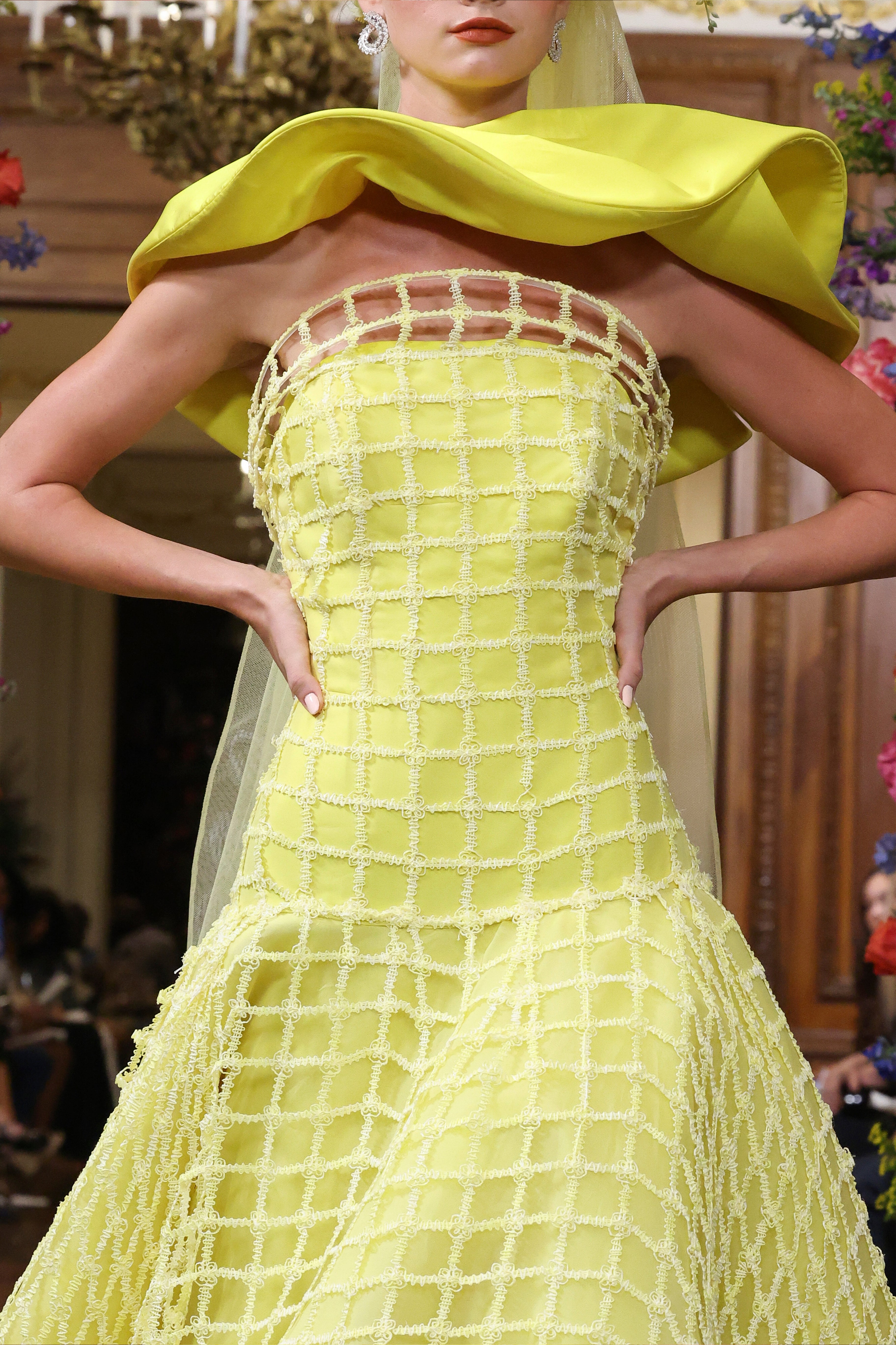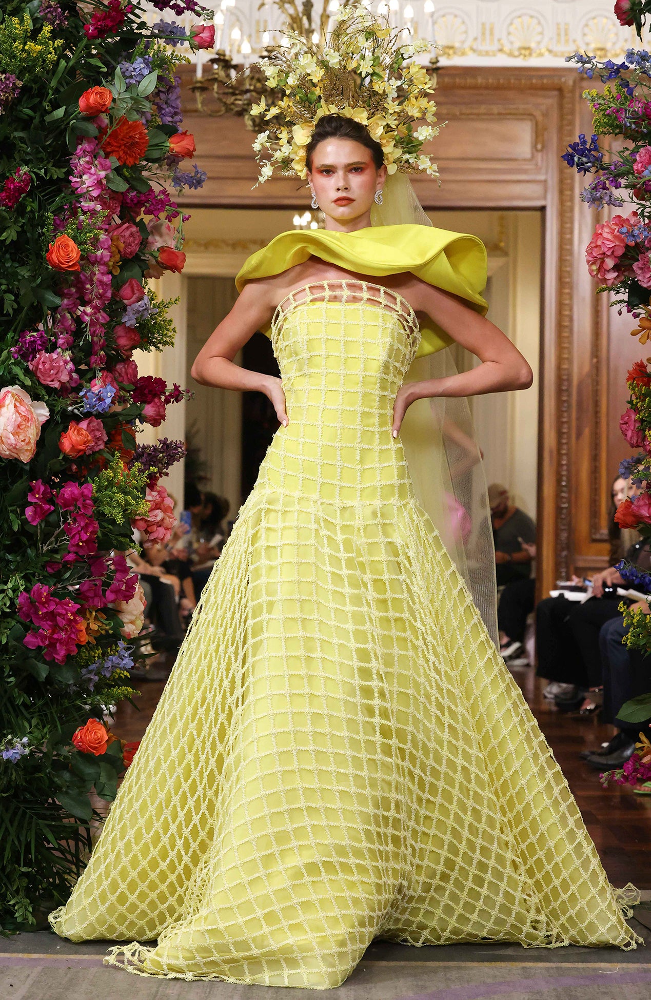 Strapless windowpane macrame ball gown paired with satin ruffle neck piece
