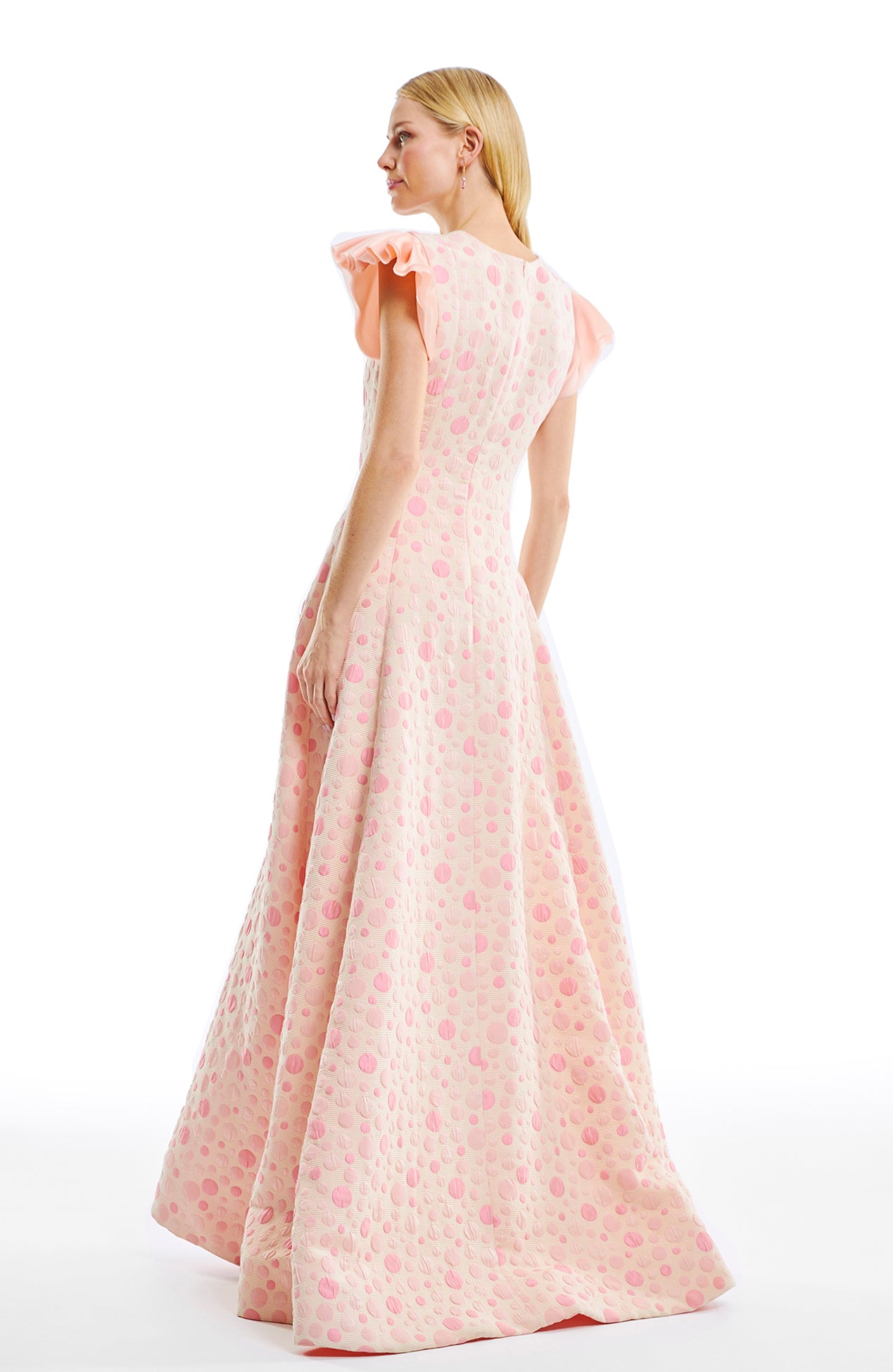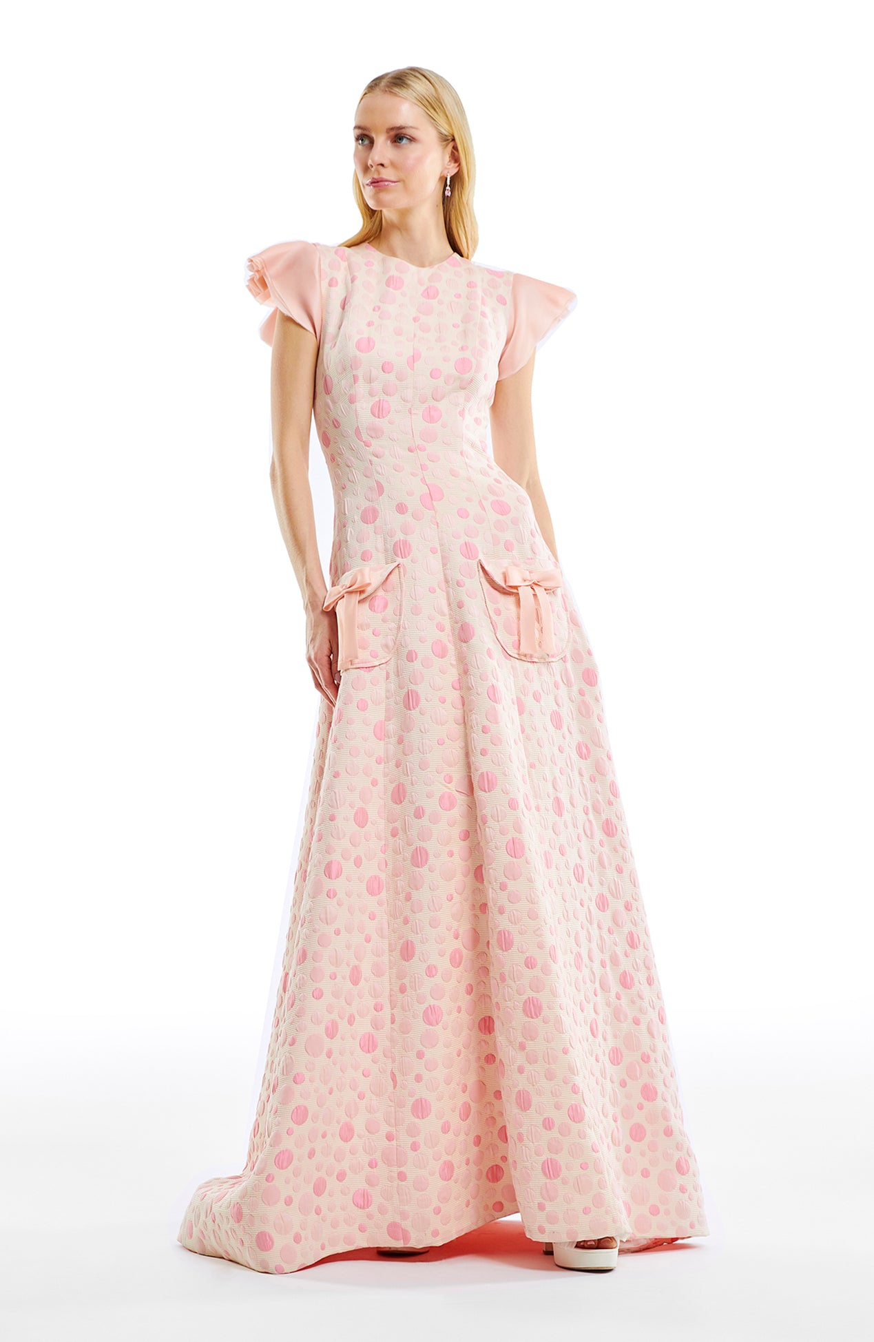 READY TO WEARRuffle sleeve polka dot jacquard dress with bow on pockets