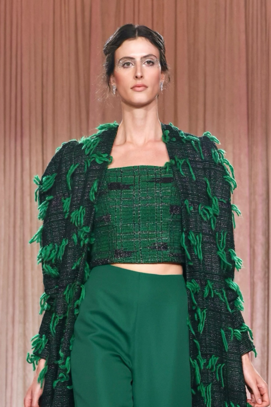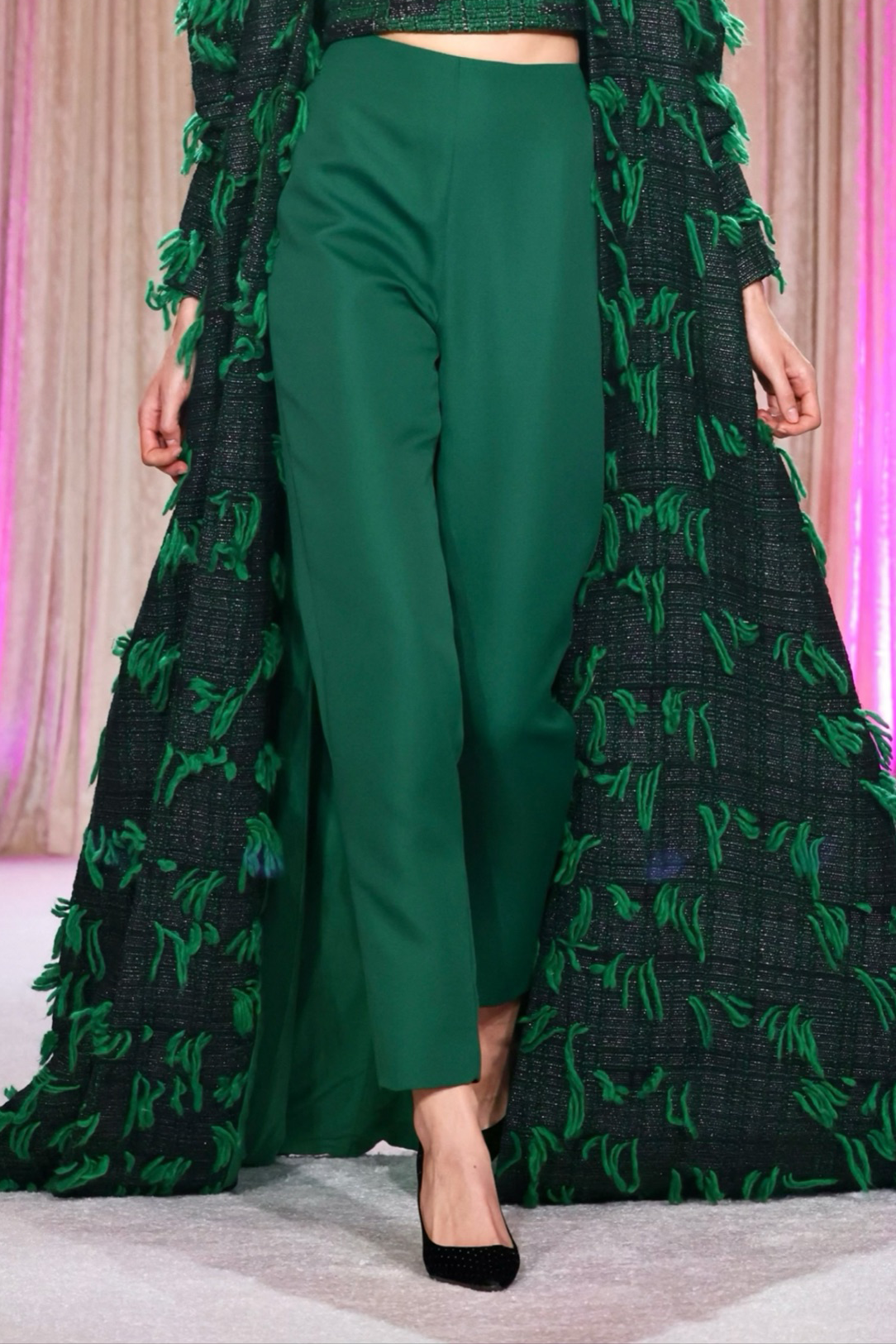 Lush green hues complete the textured floor length embroidered jacket, a slim leg pant, and a sleeveless top.