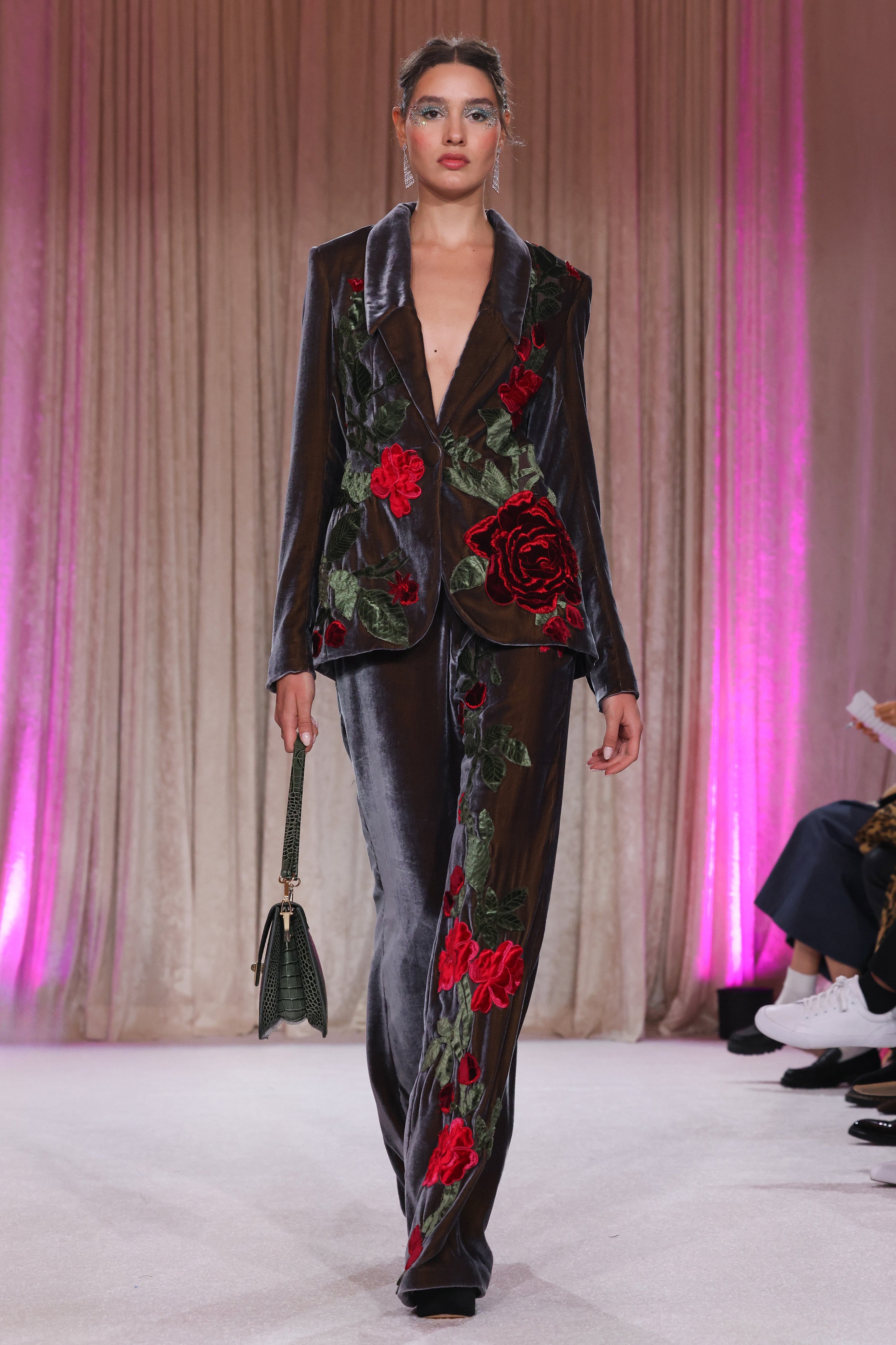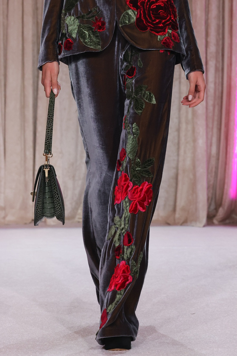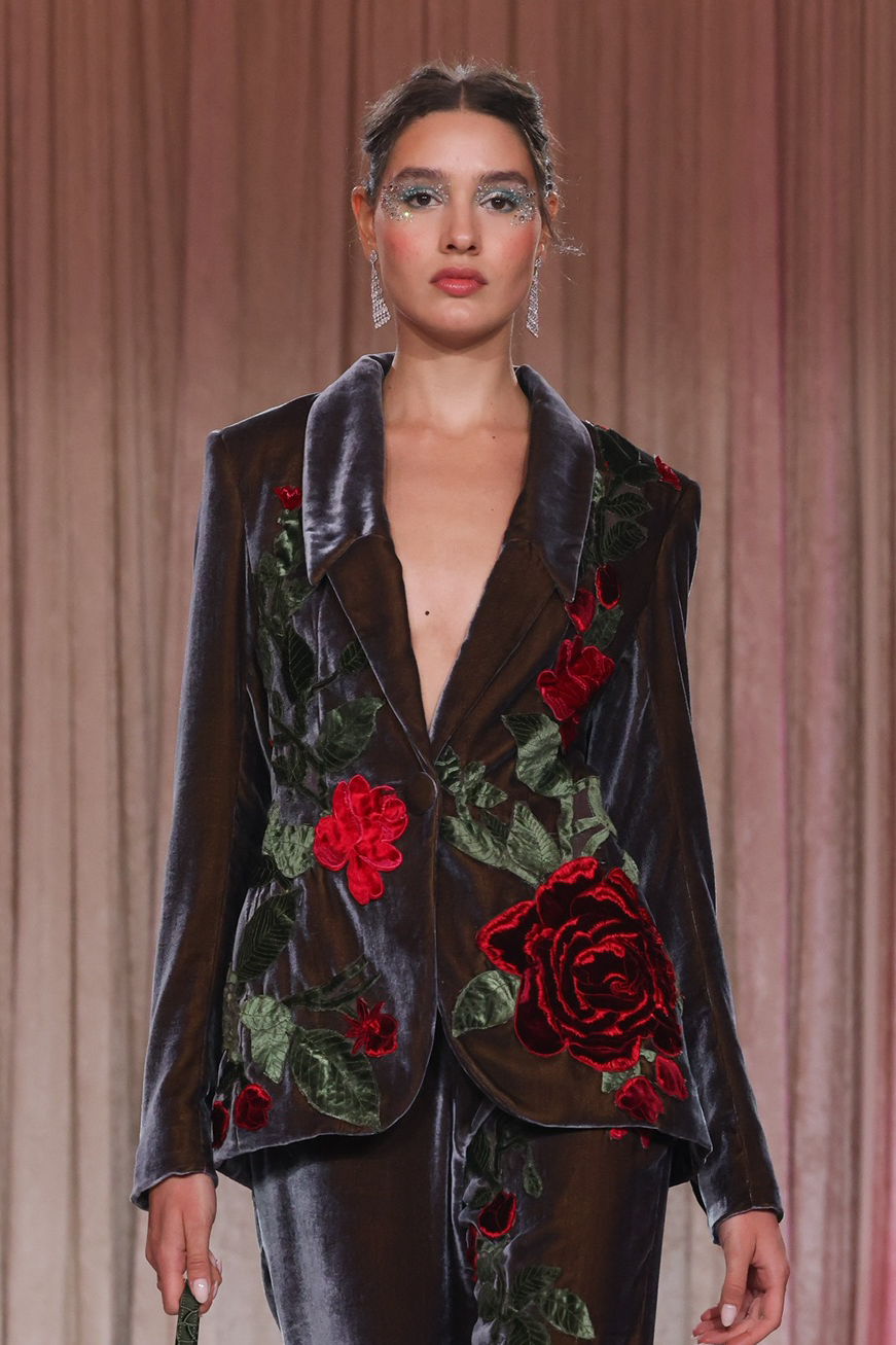 Relaxed silk velvet with embroidered velvet flower detailing creating an effortless beauty.