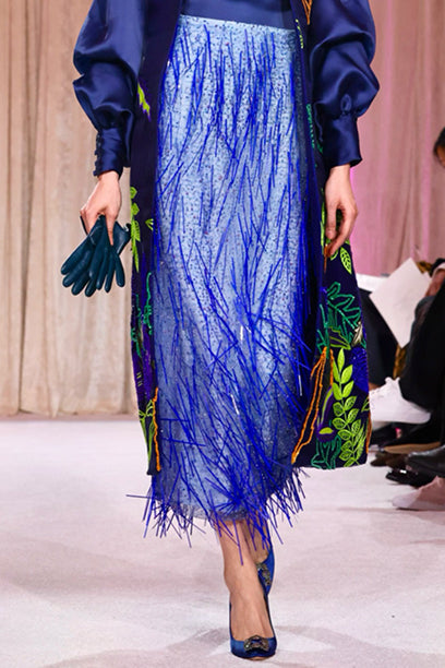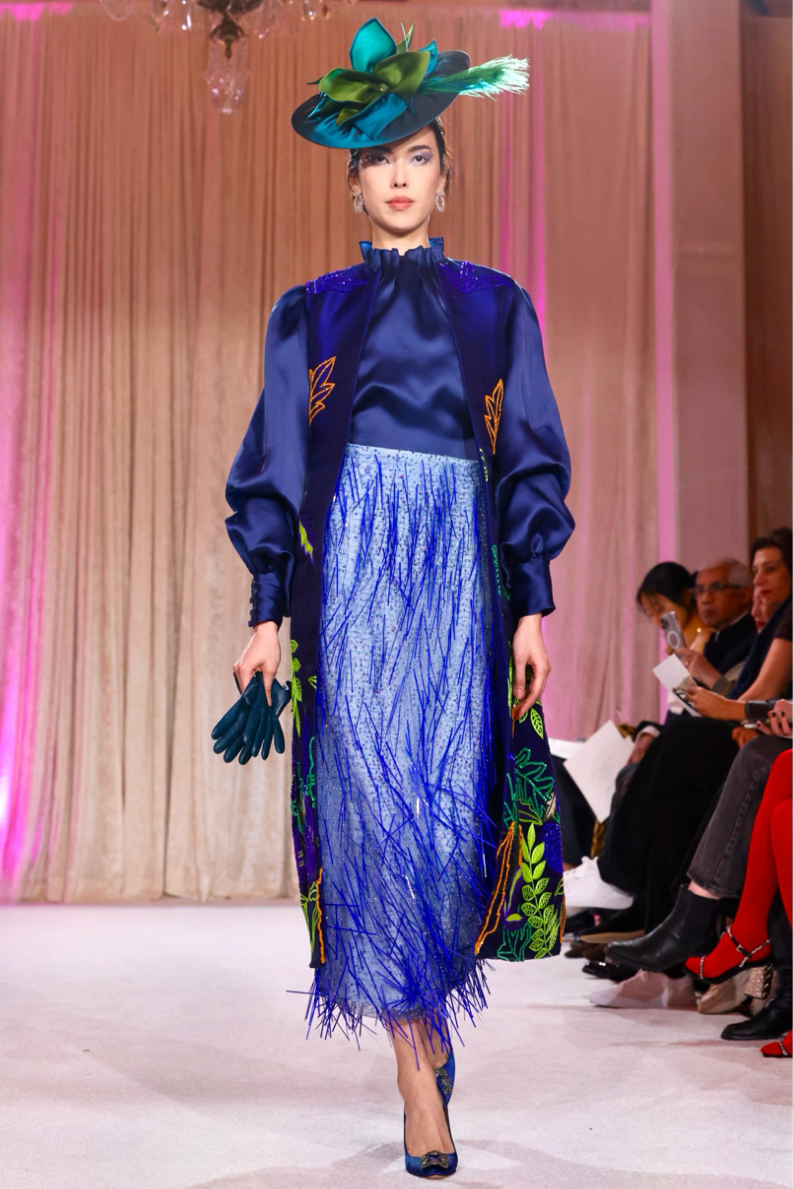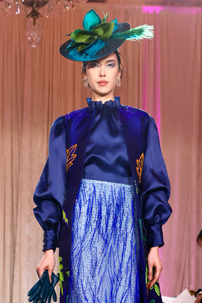 Cool Tone Sophistication: Royal Blue Embroidered duster with satin faced organza blouse depicting a midnight elegance.