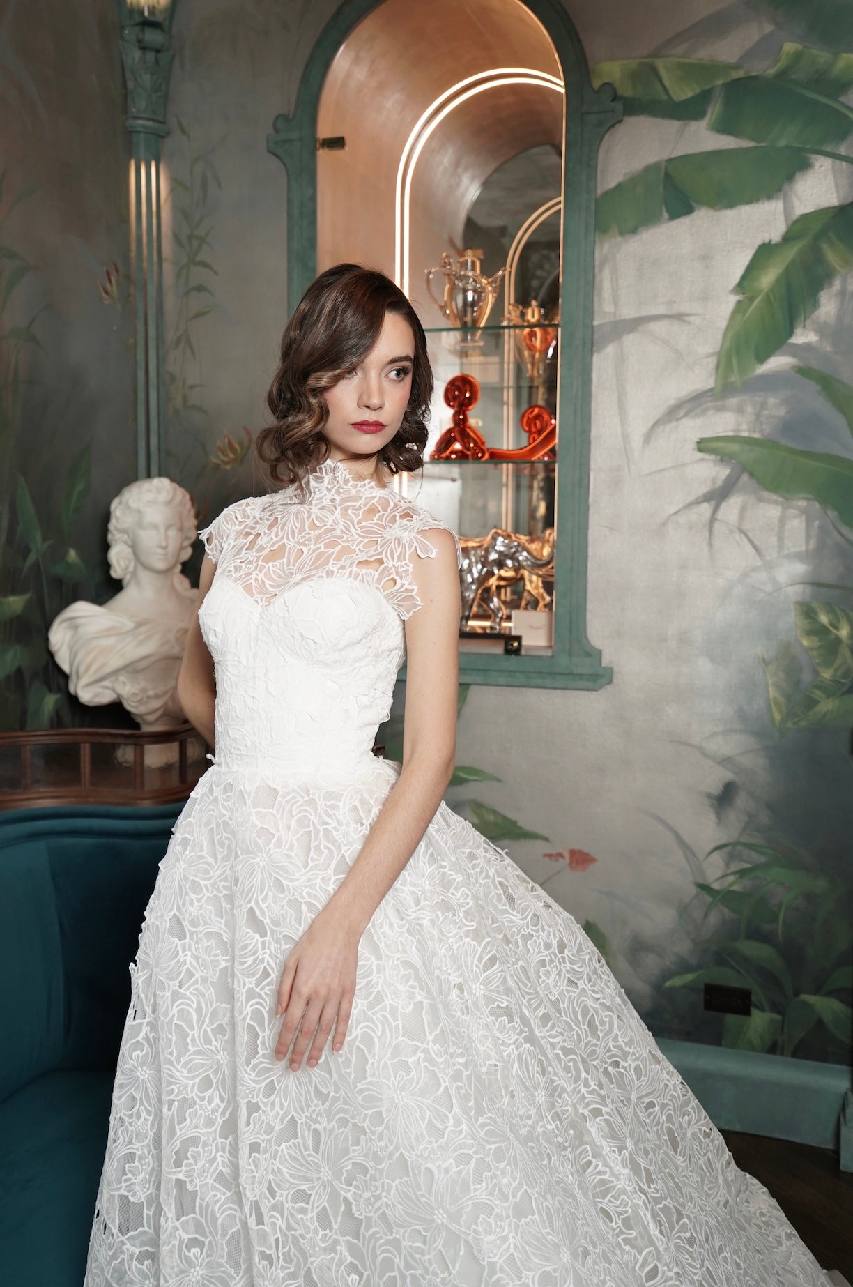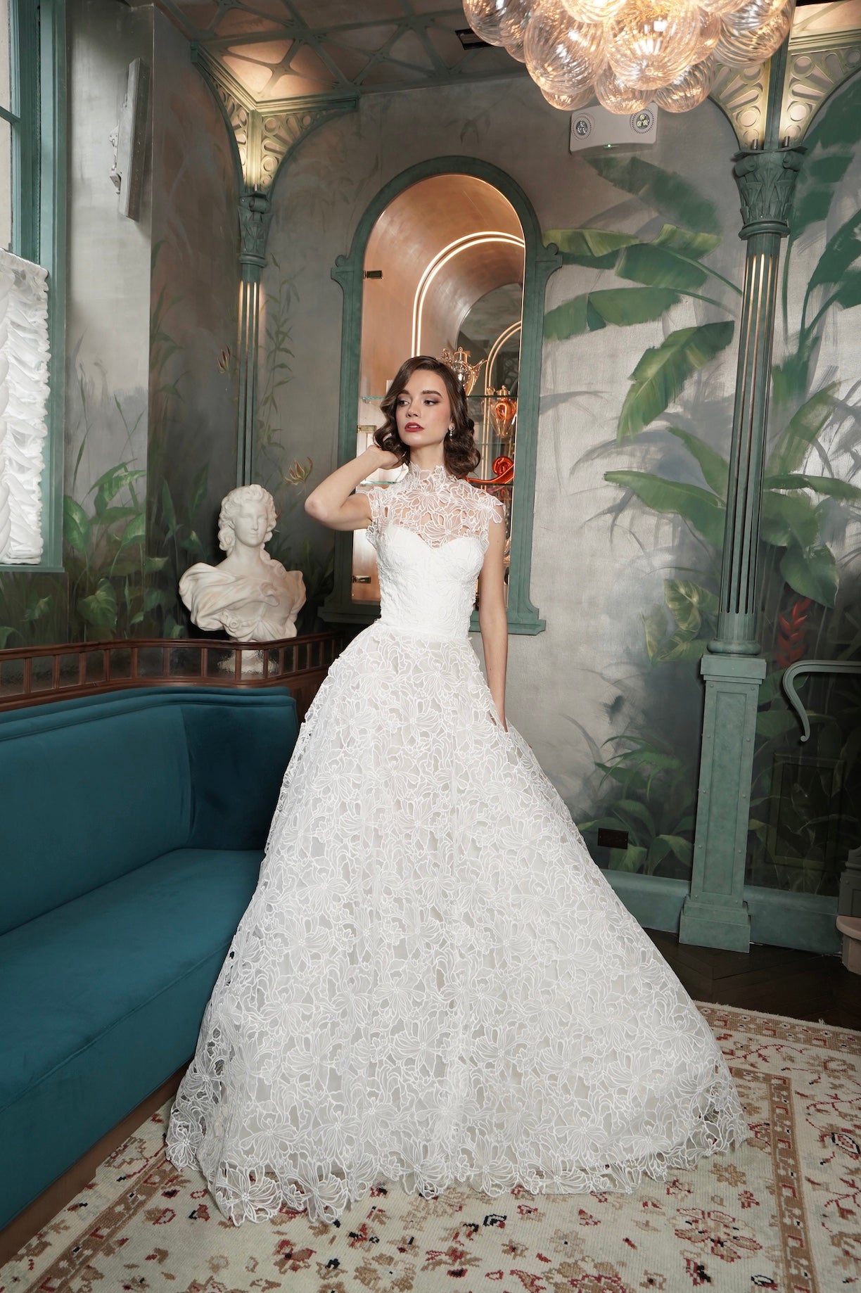 This breathtaking bridal gown is a timeless ode to vintage romance, featuring a captivating bloom-embroidered lace that exudes elegance and sophistication. The fitted bodice is gracefully framed by a high lace illusion neckline, offering a perfect blend of modesty and allure. Its intricate floral lace cascades into a voluminous, floor-sweeping skirt, creating a harmonious silhouette that is both regal and ethereal.