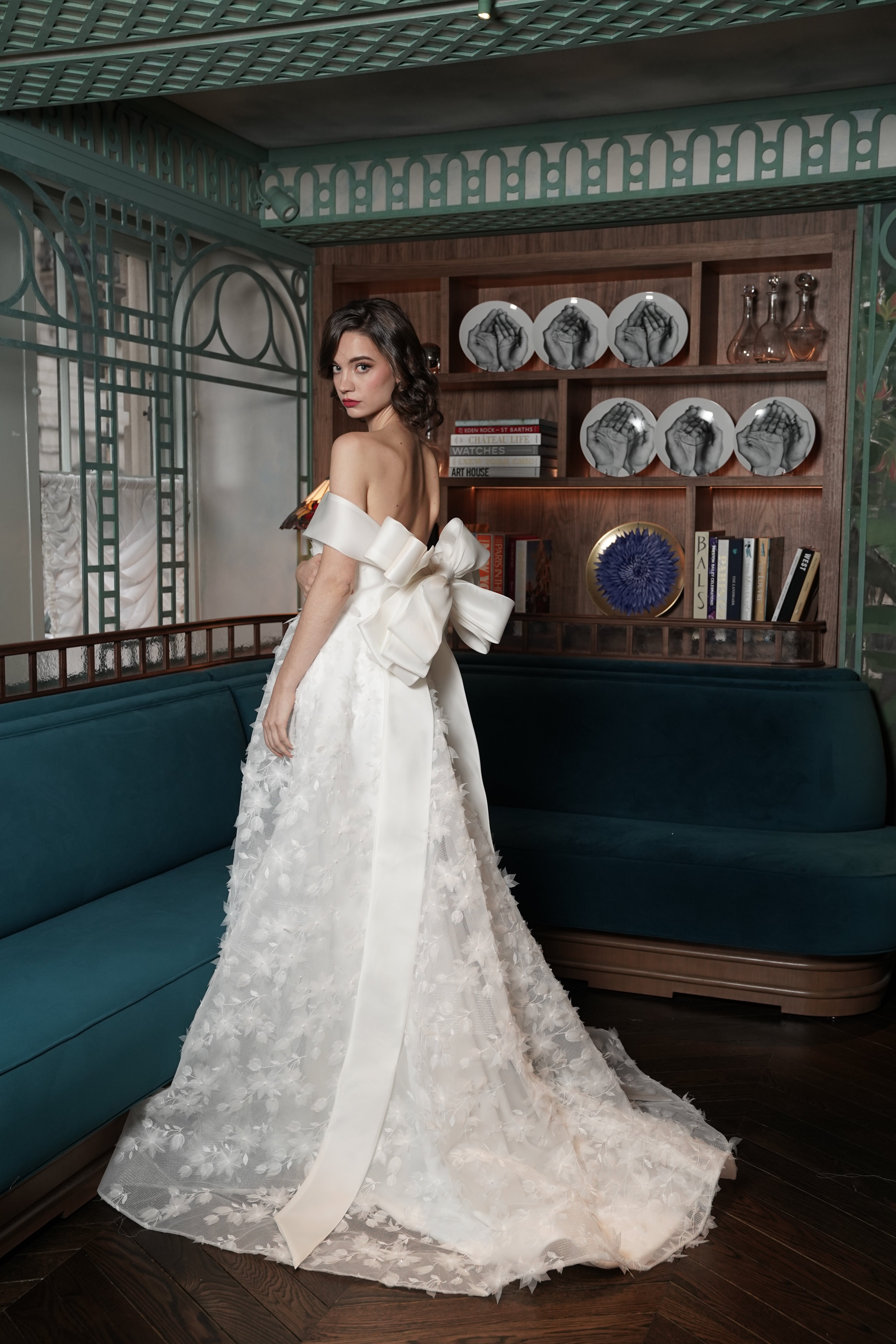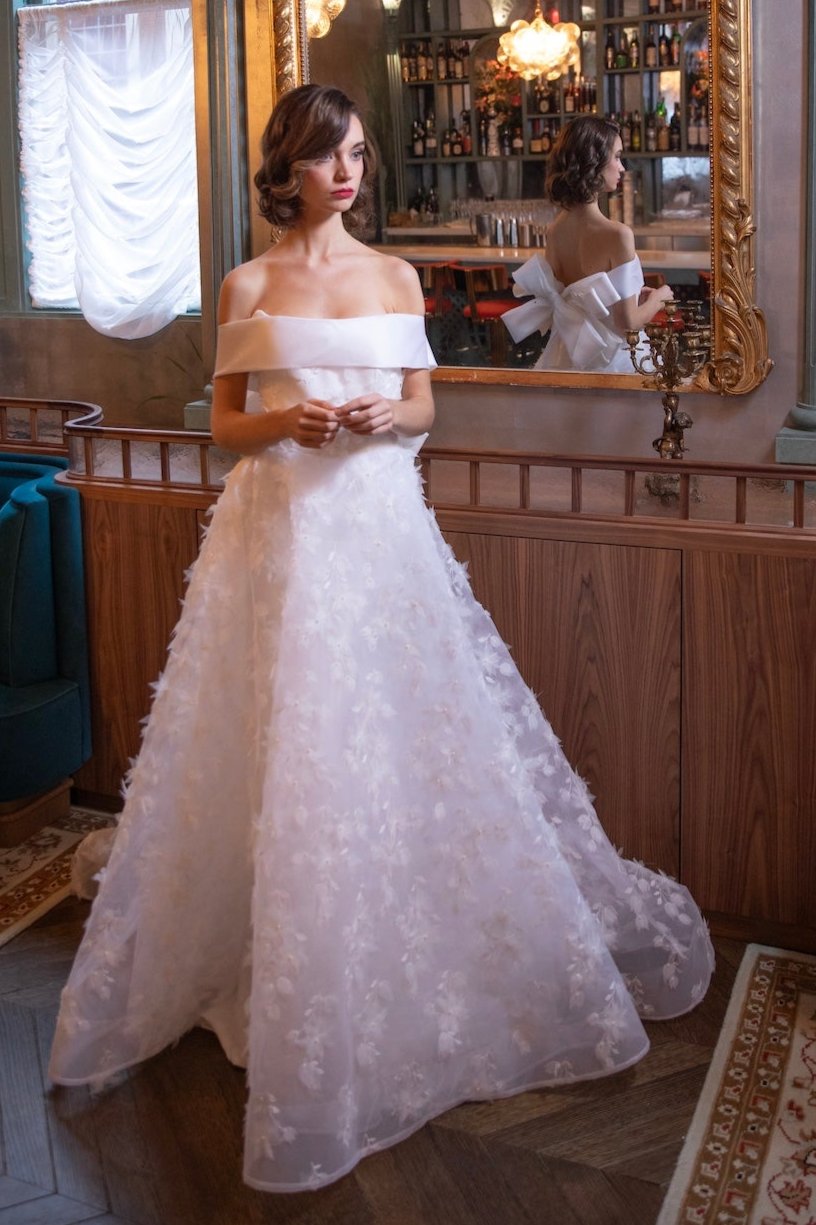 The highlight of the design is the dramatic bow at the back, formed by the extended organza cuff, cascading gracefully to enhance the gown’s striking silhouette. Perfect for the bride seeking a timeless yet distinctive look, this gown ensures a breathtaking entrance and an unforgettable walk down the aisle.