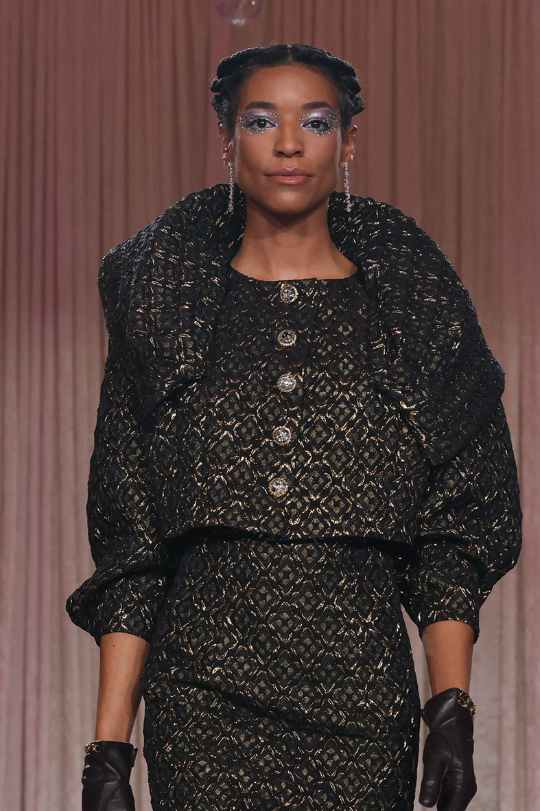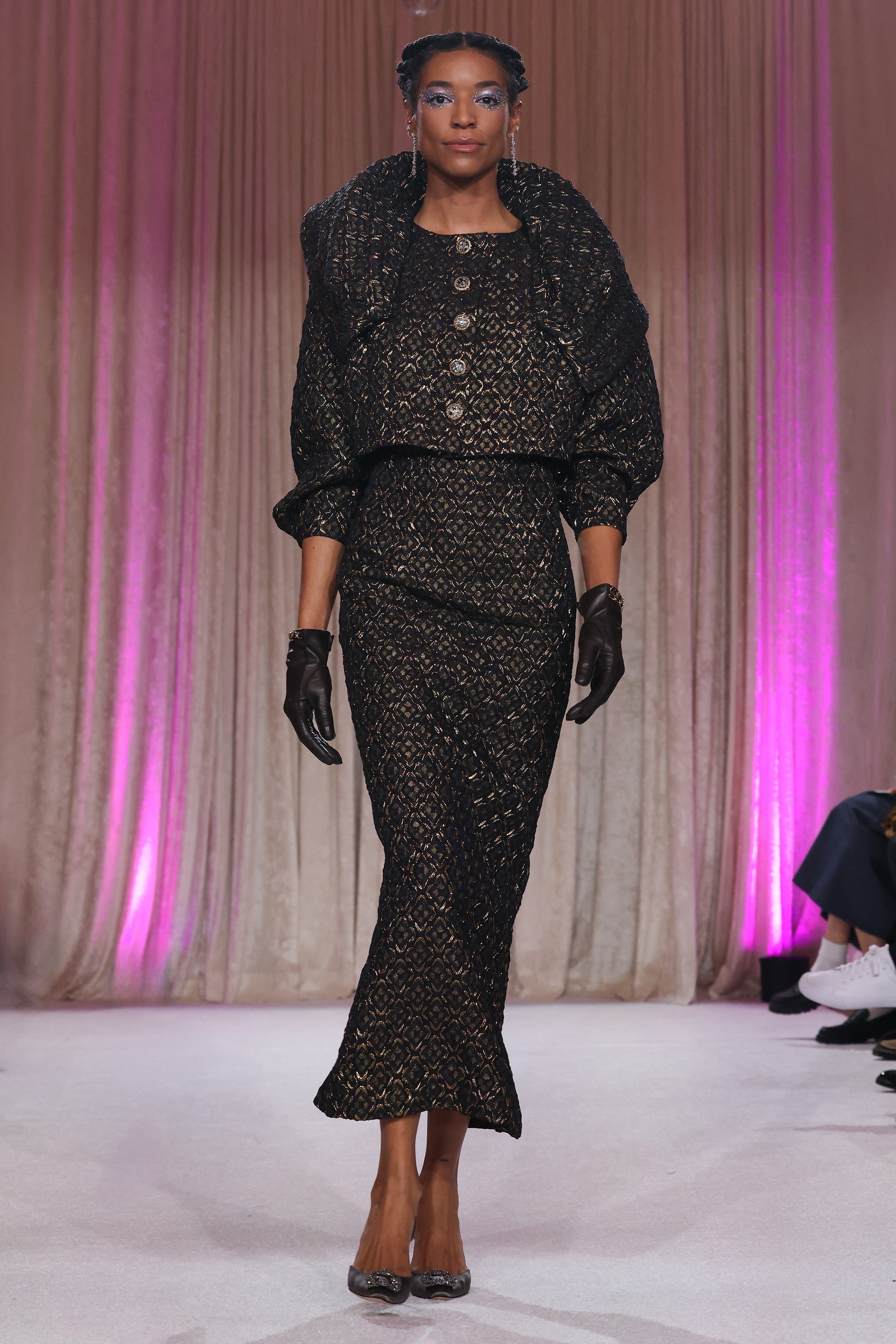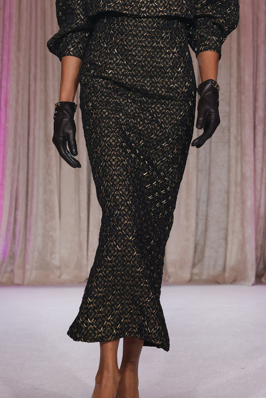 READY TO WEARMetallic jacquard set with jewel button closures of the jacket with a long subtle flare pencil skirt